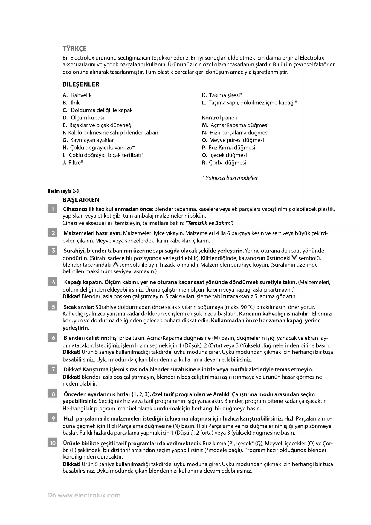 - Yalnızca bazı modeller Resim sayfa 2-3 BAŞLARKEN 1 Cihazınızı ilk kez kullanmadan önce: Blender tabanına, kaselere veya ek parçalara yapıştırılmış olabilecek plastik, yapışkan veya etiket gibi tüm ambalaj malzemelerini sökün. Cihazı ve aksesuarları temizleyin, talimatlara bakın: “Temizlik ve Bakım”. 2 Malzemeleri hazırlayın: Malzemeleri iyice yıkayın. Malzemeleri 4 ila 6 parçaya kesin ve sert veya büyük çekird- ekleri çıkarın. Meyve veya sebzelerdeki kalın kabukları çıkarın. 3 Sürahiyi, blender tabanının üzerine sapı sağda olacak şekilde yerleştirin. Yerine oturana dek saat yönünde döndürün. (Sürahi sadece bir pozisyonda yerleştirilebilir). Kilitlendiğinde, kavanozun üstündeki sembolü, blender tabanındaki sembolü ile aynı hizada olmalıdır. Malzemeleri sürahiye koyun. (Sürahinin üzerinde belirtilen maksimum seviyeyi aşmayın.) 4 Kapağı kapatın. Ölçüm kabını, yerine oturana kadar saat yönünde döndürmek suretiyle takın. (Malzemeleri, dolum deliğinden ekleyebilirsiniz. Ürünü çalıştırırken ölçüm kabını veya kapağı asla çıkartmayın.) Dikkat! Blenderi asla boşken çalıştırmayın. Sıcak sıvıları işleme tabi tutacaksanız 5. adıma göz atın. 5 Sıcak sıvılar: Sürahiye doldurmadan önce sıcak sıvıların soğumaya (maks. 90 °C) bırakılmasını öneriyoruz. Kahveliği yalnızca yarısına kadar doldurun ve işlemi düşük hızda başlatın. Karıcının kahveliği ısınabilir– Ellerinizi koruyun ve doldurma deliğinden gelecek buhara dikkat edin. Kullanmadan önce her zaman kapağı yerine yerleştirin. 6 Blenderı çalıştırın: Fişi prize takın. Açma/Kapama düğmesine (M) basın, düğmelerin ışığı yanacak ve ekranı ay- dınlatacaktır. İstediğiniz işlem hızını seçmek için 1 (Düşük), 2 (Orta) veya 3 (Yüksek) düğmelerinden birine basın. Dikkat! Ürün 5 saniye kullanılmadığı takdirde, uyku moduna girer. Uyku modundan çıkmak için herhangi bir tuşa basabilirsiniz. Uyku modunda çıkan blenderınızı kullanıma devam edebilirsiniz. 7 Dikkat! Karıştırma işlemi sırasında blender sürahisine elinizle veya mutfak aletleriyle temas etmeyin. Dikkat! Blenderı asla boş çalıştırmayın, blenderın boş çalıştırılması aşırı ısınmaya ve ürünün hasar görmesine neden olabilir. 8 Önceden ayarlanmış hızlar (1, 2, 3), özel tarif programları ve Aralıklı Çalıştırma modu arasından seçim yapabilirsiniz. Seçtiğiniz hız veya tarif programının ışığı yanacaktır. Blender, program bitene kadar çalışacaktır. Herhangi bir programı manüel olarak durdurmak için herhangi bir düğmeye basın. 9 Hızlı parçalama ile malzemeleri istediğiniz kıvama ulaşması için hızlıca karıştırabilirsiniz. Hızlı Parçalamamo- duna geçmek için Hızlı Parçalama düğmesine (N) basın. Hızlı Parçalamave hız düğmelerinin ışığı yanıp sönmeye başlar. Farklı hızlarda parçalama yapmak için 1 (Düşük), 2 (orta) veya 3 (yüksek) düğmesine basın. 10 Ürünle birlikte çeşitli tarif programları da verilmektedir. Buz kırma (P), İçecek* (Q), Meyveli içecekler (O) ve Çor- ba (R) şeklindeki bir dizi tarif arasından seçim yapabilirsiniz (*modele bağlı). Program hazır olduğunda blender kendiliğinden duracaktır. Dikkat! Ürün 5 saniye kullanılmadığı takdirde, uyku moduna girer. Uyku modundan çıkmak için herhangi bir tuşa basabilirsiniz. Uyku modunda çıkan blenderınızı kullanıma devam edebilirsiniz.127www.electrolux.com