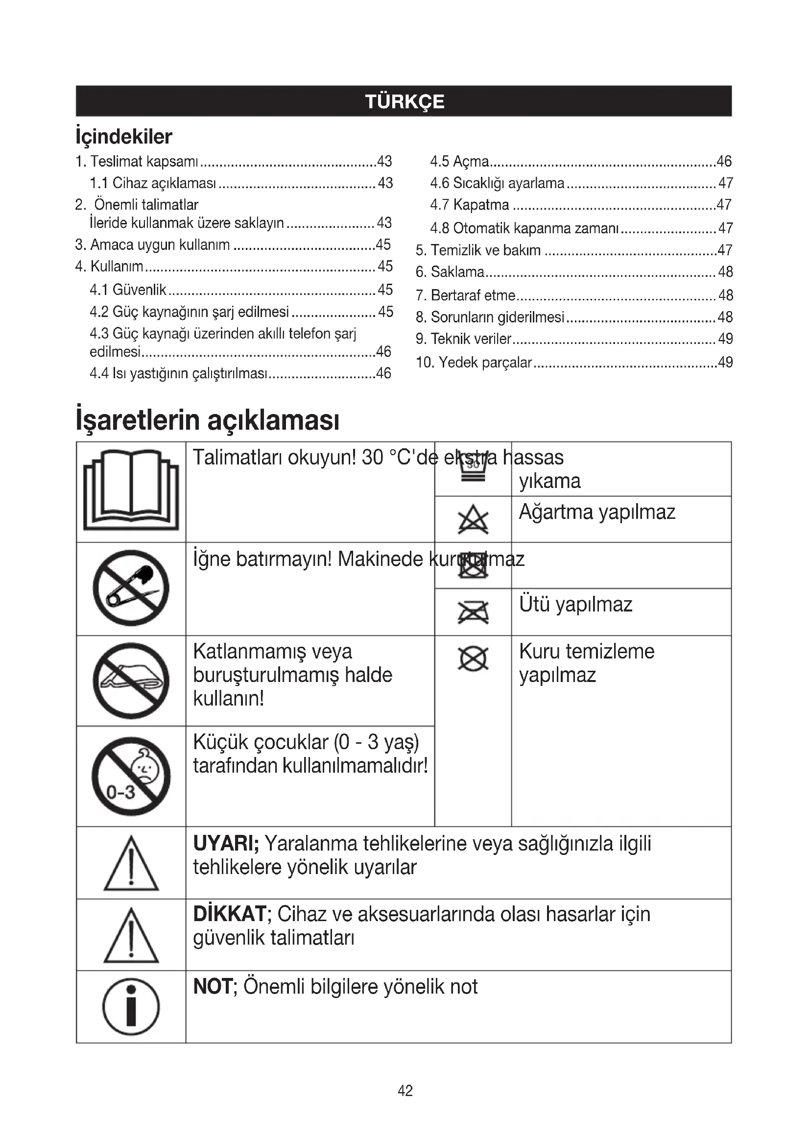 İşaretlerin açıklaması Talimatları okuyun! 30 °C'de ekstra hassas yıkama Ağartma yapılmaz İğne batırmayın! Makinede kurutulmaz Ütü yapılmaz Katlanmamış veya buruşturulmamış halde kullanın! Kuru temizleme yapılmaz Küçük çocuklar (0 - 3 yaş) tarafından kullanılmamalıdır! UYARI; Yaralanma tehlikelerine veya sağlığınızla ilgili tehlikelere yönelik uyarılar DİKKAT; Cihaz ve aksesuarlarında olası hasarlar için güvenlik talimatları NOT; Önemli bilgilere yönelik not İçindekiler43