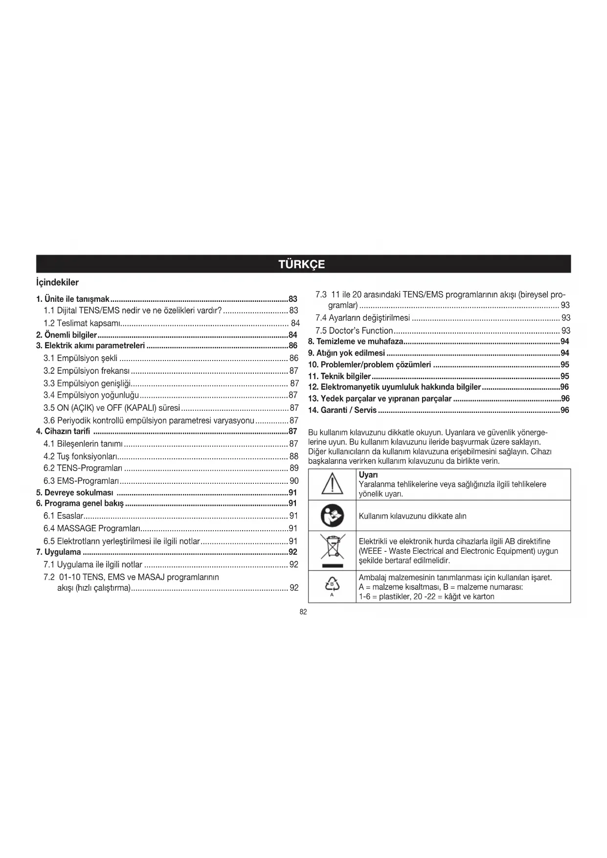 Cihazın kullanılması, bir doktor kontrolünün ve tedavisinin yerine geç- mez. Bu nedenle, her türlü ağrı veya hastalık durumunda daima önce doktorunuza danışınız!85 UYARI! Sağlık açısından zarar oluşmasını önlemek için, aşağıdaki durumlarda Dijital TENS/EMS ünitesi kesinlikle kullanılmamalıdır: