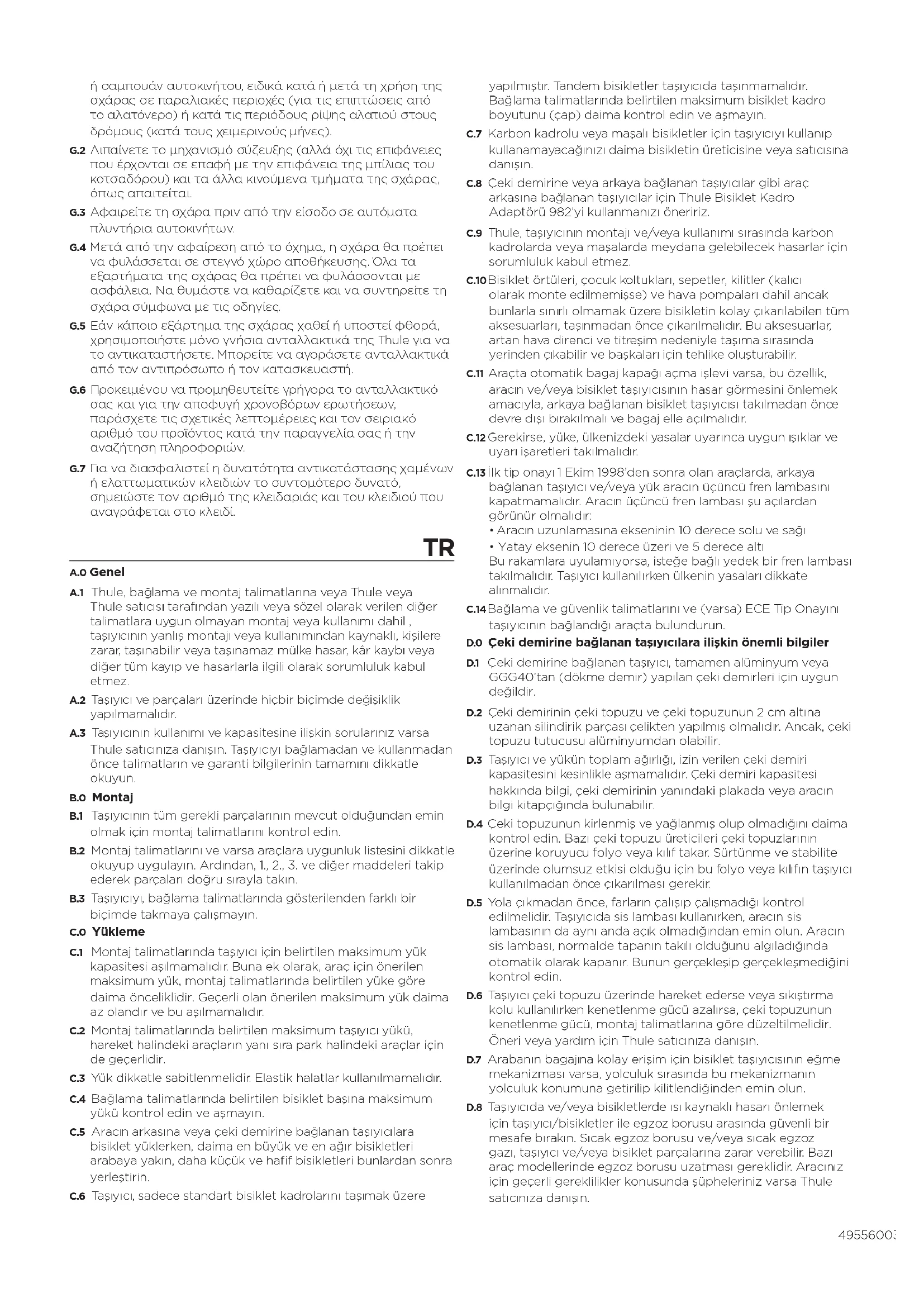 A.0 Genel A.1 Thule, bağlama ve montaj talimatlarına veya Thule veya Thule satıcısı tarafından yazılı veya sözel olarak verilen diğer talimatlara uygun olmayan montaj veya kullanımı dahil , taşıyıcının yanlış montajı veya kullanımından kaynaklı, kişilere zarar, taşınabilir veya taşınamaz mülke hasar, kâr kaybı veya diğer tüm kayıp ve hasarlarla ilgili olarak sorumluluk kabul etmez. A.2 Taşıyıcı ve parçaları üzerinde hiçbir biçimde değişiklik yapılmamalıdır. A.3 Taş ıyıcının kullanımı ve kapasitesine ilişkin sorularınız varsa Thule satıcınıza danışın. Taşıyıcıyı bağlamadan ve kullanmadan önce talimatların ve garanti bilgilerinin tamamını dikkatle okuyun. B.0 Montaj B.1 Taşıyıcının tüm gerekli parçalarının mevcut olduğundan emin olmak için montaj talimatlarını kontrol edin. B.2 Montaj talimatlarını ve varsa araçlara uygunluk listesini dikkatle okuyup uygulayın. Ardından, 1., 2., 3. ve diğer maddeleri takip ederek parçaları doğru sırayla takın. B.3 Ta ş ıyıcıyı, bağlama talimatlarında gösterilenden farklı bir biçimde takmaya çalışmayın. C.0 Yükleme C.1 Montaj talimatlarında taşıyıcı için belirtilen maksimum yük kapasitesi aşılmamalıdır. Buna ek olarak, araç için önerilen maksimum yük, montaj talimatlarında belirtilen yüke göre daima önceliklidir. Geçerli olan önerilen maksimum yük daima az olandır ve bu aşılmamalıdır. C.2 Montaj talimatlarında belirtilen maksimum taşıyıcı yükü, hareket halindeki araçların yanı sıra park halindeki araçlar için de geçerlidir. C.3 Yük dikkatle sabitlenmelidir. Elastik halatlar kullanılmamalıdır. C.4 Bağlama talimatlarında belirtilen bisiklet başına maksimum yükü kontrol edin ve aşmayın. C.5 Aracın arkasına veya çeki demirine bağlanan taşıyıcılara bisiklet yüklerken, daima en büyük ve en ağır bisikletleri arabaya yakın, daha küçük ve hafif bisikletleri bunlardan sonra yerleştirin. C.6 Taşıyıcı, sadece standart bisiklet kadrolarını taşımak üzere yapılmıştır. Tandem bisikletler taşıyıcıda taşınmamalıdır. Bağlama talimatlarında belirtilen maksimum bisiklet kadro boyutunu (çap) daima kontrol edin ve aşmayın. C.7 Karbon kadrolu veya maşalı bisikletler için taşıyıcıyı kullanıp kullanamayacağınızı daima bisikletin üreticisine veya satıcısına danışın. C.8 Çeki demirine veya arkaya bağlanan taşıyıcılar gibi araç arkasına bağlanan taşıyıcılar için Thule Bisiklet Kadro Adaptörü 982’yi kullanmanızı öneririz. C.9 Thule, taşıyıcının montajı ve/veya kullanımı sırasında karbon kadrolarda veya maşalarda meydana gelebilecek hasarlar için sorumluluk kabul etmez. C.10 Bisiklet örtüleri, çocuk koltukları, sepetler, kilitler (kalıcı olarak monte edilmemişse) ve hava pompaları dahil ancak bunlarla sınırlı olmamak üzere bisikletin kolay çıkarılabilen tüm aksesuarları, taşınmadan önce çıkarılmalıdır. Bu aksesuarlar, artan hava direnci ve titreşim nedeniyle taşıma sırasında yerinden çıkabilir ve başkaları için tehlike oluşturabilir. C.11 Araçta otomatik bagaj kapağı açma işlevi varsa, bu özellik, aracın ve/veya bisiklet taşıyıcısının hasar görmesini önlemek amacıyla, arkaya bağlanan bisiklet taşıyıcısı takılmadan önce devre dışı bırakılmalı ve bagaj elle açılmalıdır. C.12 Gerekirse, yüke, ülkenizdeki yasalar uyarınca uygun ışıklar ve uyarı işaretleri takılmalıdır. C.13 İlk tip onayı 1 Ekim 1998’den sonra olan araçlarda, arkaya bağlanan taşıyıcı ve/veya yük aracın üçüncü fren lambasını kapatmamalıdır. Aracın üçüncü fren lambası şu açılardan görünür olmalıdır:
