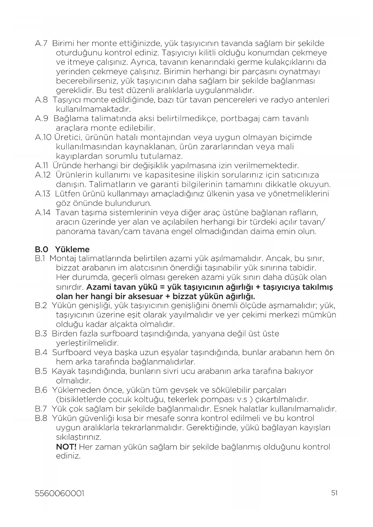 A.7 Birimi her monte ettiğinizde, yük taşıyıcının tavanda sağlam bir şekilde oturduğunu kontrol ediniz. Taşıyıcıyı kilitli olduğu konumdan çekmeye ve itmeye çalışınız. Ayrıca, tavanın kenarındaki germe kulakçıklarını da yerinden çekmeye çalışınız. Birimin herhangi bir parçasını oynatmayı becerebilirseniz, yük taşıyıcının daha sağlam bir şekilde bağlanması gereklidir. Bu test düzenli aralıklarla uygulanmalıdır. A.8 Taşıyıcı monte edildiğinde, bazı tür tavan pencereleri ve radyo antenleri kullanılmamaktadır. A.9 Bağlama talimatında aksi belirtilmedikçe, portbagaj cam tavanlı araçlara monte edilebilir. A.10 Üretici, ürünün hatalı montajından veya uygun olmayan biçimde kullanılmasından kaynaklanan, ürün zararlarından veya mali kayıplardan sorumlu tutulamaz. A.11 Üründe herhangi bir değişiklik yapılmasına izin verilmemektedir. A.12 Ürünlerin kullanımı ve kapasitesine ilişkin sorularınız için satıcınıza danışın. Talimatların ve garanti bilgilerinin tamamını dikkatle okuyun. A.13 Lütfen ürünü kullanmayı amaçladığınız ülkenin yasa ve yönetmeliklerini göz önünde bulundurun. A.14 Tavan taşıma sistemlerinin veya diğer araç üstüne bağlanan rafların, aracın üzerinde yer alan ve açılabilen herhangi bir türdeki açılır tavan/ panorama tavan/cam tavana engel olmadığından daima emin olun. B.0 Yükleme B.1 Montaj talimatlarında belirtilen azami yük aşılmamalıdır. Ancak, bu sınır, bizzat arabanın im alatcısının önerdiği taşınabilir yük sınırına tabidir. Her durumda, geçerli olması gereken azami yük sınırı daha düşük olan sınırdır. Azami tavan yükü = yük taşıyıcının ağırlığı + taşıyıcıya takılmış olan her hangi bir aksesuar + bizzat yükün ağırlığı. B.2 Yükün genişliği, yük taşıyıcının genişliğini önemli ölçüde aşmamalıdır; yük, taşıyıcının üzerine eşit olarak yayılmalıdır ve yer çekimi merkezi mümkün olduğu kadar alçakta olmalıdır. B.3 Birden fazla surfboard taşındığında, yanyana değil üst üste yerleştirilmelidir. B.4 Surfboard veya başka uzun eşyalar taşındığında, bunlar arabanın hem ön hem arka tarafında bağlanmalıdırlar. B.5 Kayak taşındığında, bunların sivri ucu arabanın arka tarafına bakıyor olmalıdır. B.6 Yüklemeden önce, yükün tüm gevşek ve sökülebilir parçaları (bisikletlerde çocuk koltuğu, tekerlek pompası v.s ) çıkartılmalıdır. B.7 Yük çok sağlam bir şekilde bağlanmalıdır. Esnek halatlar kullanılmamalıdır. B.8 Yükün güvenliği kısa bir mesafe sonra kontrol edilmeli ve bu kontrol uygun aralıklarla tekrarlanmalıdır. Gerektiğinde, yükü bağlayan kayışları sıkılaştırınız. NOT! Her zaman yükün sağlam bir şekilde bağlanmış olduğunu kontrol ediniz.52