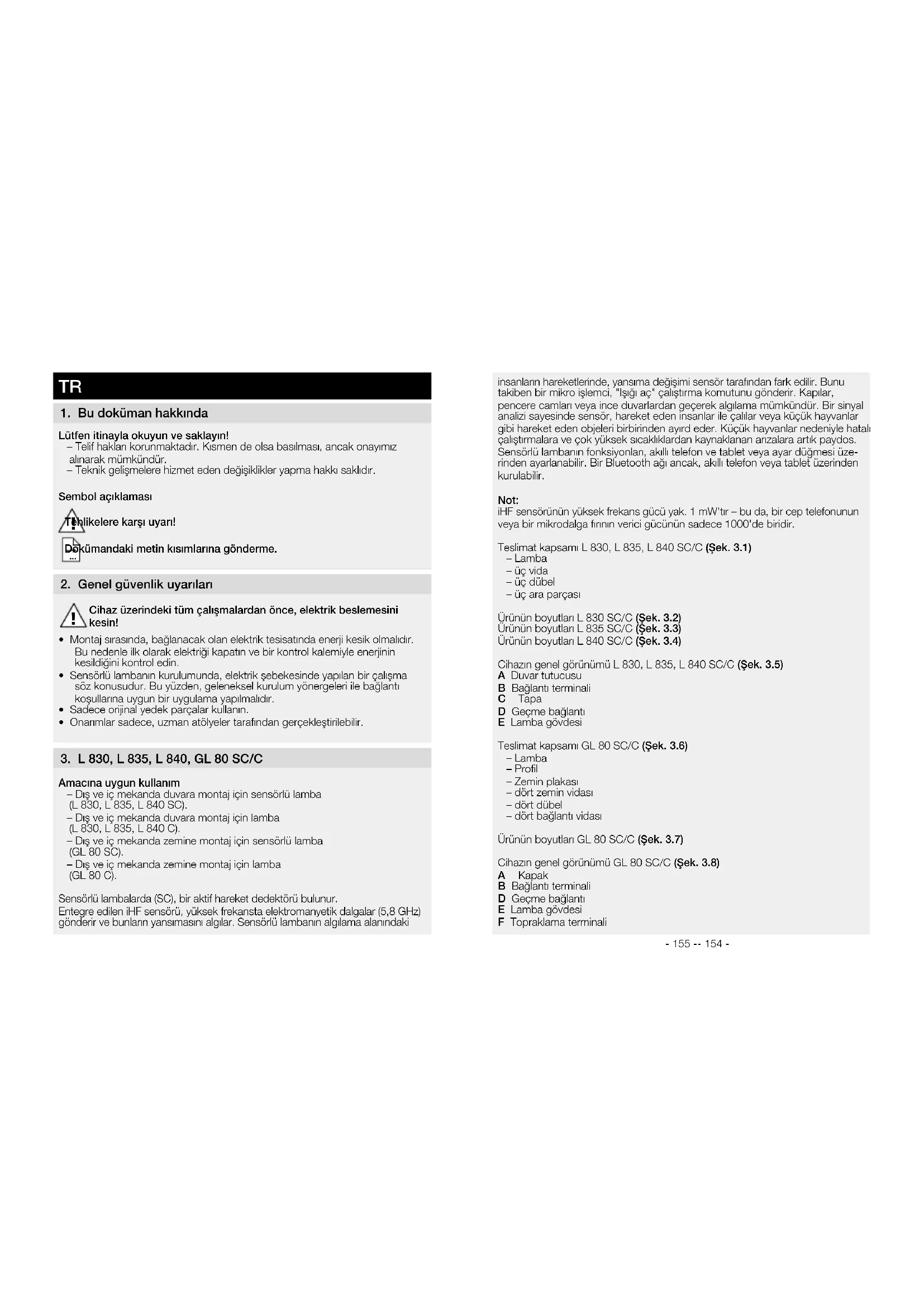 insanların hareketlerinde, yansıma değişimi sensör tarafından fark edilir. Bunu takiben bir mikro işlemci, "Işığı aç" çalıştırma komutunu gönderir. Kapılar, pencere camları veya ince duvarlardan geçerek algılama mümkündür. Bir sinyal analizi sayesinde sensör, hareket eden insanlar ile çalılar veya küçük hayvanlar gibi hareket eden objeleri birbirinden ayırd eder. Küçük hayvanlar nedeniyle hatalı çalıştırmalara ve çok yüksek sıcaklıklardan kaynaklanan arızalara artık paydos. Sensörlü lambanın fonksiyonları, akıllı telefon ve tablet veya ayar düğmesi üze- rinden ayarlanabilir. Bir Bluetooth ağı ancak, akıllı telefon veya tablet üzerinden kurulabilir. Not: iHF sensörünün yüksek frekans gücü yak. 1 mW'tır – bu da, bir cep telefonunun veya bir mikrodalga fırının verici gücünün sadece 1000'de biridir. Teslimat kapsamı L830, L835, L840SC/C (Şek.3.1) – Lamba – üç vida – üç dübel – üç ara parçası Ürünün boyutları L 830SC/C(Şek.3.2) Ürünün boyutları L 835SC/C(Şek.3.3) Ürünün boyutları L 840SC/C(Şek.3.4) Cihazın genel görünümü L830, L835, L840SC/C (Şek.3.5) A Duvar tutucusu B Bağlantı terminali C Tapa D Geçme bağlantı E Lamba gövdesi Teslimat kapsamı GL 80SC/C(Şek.3.6) – Lamba – Profil – Zemin plakası – dört zemin vidası – dört dübel – dört bağlantı vidası Ürünün boyutları GL 80SC/C(Şek.3.7) Cihazın genel görünümü GL 80SC/C(Şek.3.8) A Kapak B Bağlantı terminali D Geçme bağlantı E Lamba gövdesi F Topraklama terminali- 157 -- 156 - Işık şiddeti dağılımı (Şek.3.9/3.10/3.11/3.12) Menzil (sadece SC) (Şek.3.13) Not: Lambalar birbirine çok yakın monte edildiğinde, gönderdikleri yüksek frekans sinyalleri birbirlerini etkileyeceği için hatalı çalıştırmalar meydana gelebilir. (Şek.3.14A) Bu hatayı gidermek için şu önlemler yardımcı olabilir: