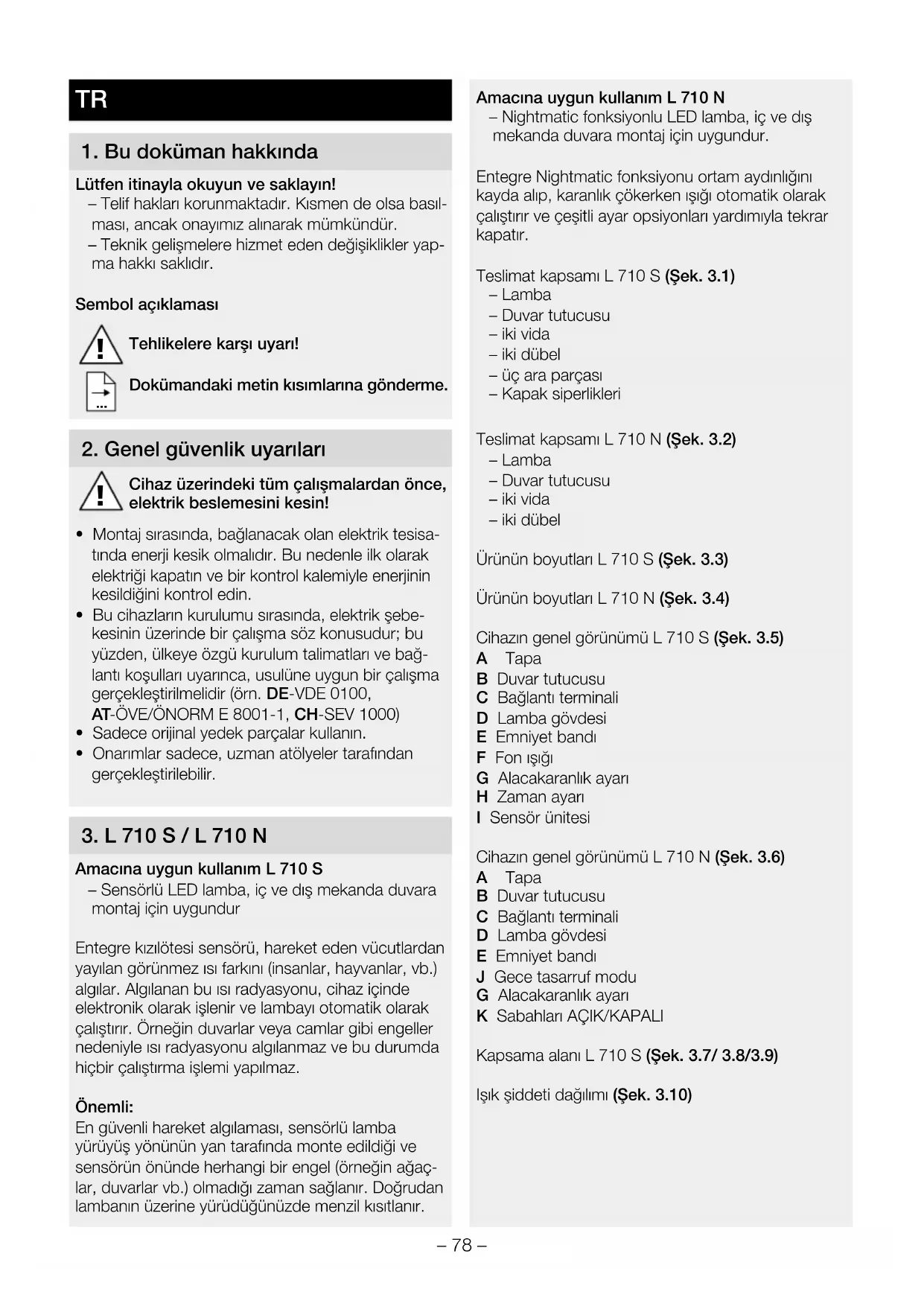 Amacına uygun kullanım L 710 S – Sensörlü LED lamba, iç ve dış mekanda duvara montaj için uygundur Entegre kızılötesi sensörü, hareket eden vücutlardan yayılan görünmez ısı farkını (insanlar, hayvanlar, vb.) algılar. Algılanan bu ısı radyasyonu, cihaz içinde elektronik olarak işlenir ve lambayı otomatik olarak çalıştırır. Örneğin duvarlar veya camlar gibi engeller nedeniyle ısı radyasyonu algılanmaz ve bu durumda hiçbir çalıştırma işlemi yapılmaz. Önemli: En güvenli hareket algılaması, sensörlü lamba yürüyüş yönünün yan tarafında monte edildiği ve sensörün önünde herhangi bir engel (örneğin ağaç- lar, duvarlar vb.) olmadığı zaman sağlanır. Doğrudan lambanın üzerine yürüdüğünüzde menzil kısıtlanır. Amacına uygun kullanım L 710 N – Nightmatic fonksiyonlu LED lamba, iç ve dış mekanda duvara montaj için uygundur. Entegre Nightmatic fonksiyonu ortam aydınlığını kayda alıp, karanlık çökerken ışığı otomatik olarak çalıştırır ve çeşitli ayar opsiyonları yardımıyla tekrar kapatır. Teslimat kapsamı L 710 S (Şek.3.1) – Lamba – Duvar tutucusu – iki vida – iki dübel – üç ara parçası – Kapak siperlikleri Teslimat kapsamı L 710 N (Şek.3.2) – Lamba – Duvar tutucusu – iki vida – iki dübel Ürünün boyutları L 710 S (Şek.3.3) Ürünün boyutları L 710 N (Şek.3.4) Cihazın genel görünümü L 710 S (Şek.3.5) A Tapa B Duvar tutucusu C Bağlantı terminali D Lamba gövdesi E Emniyet bandı F Fon ışığı G Alacakaranlık ayarı H Zaman ayarı I Sensör ünitesi Cihazın genel görünümü L 710 N (Şek.3.6) A Tapa B Duvar tutucusu C Bağlantı terminali D Lamba gövdesi E Emniyet bandı J Gece tasarruf modu G Alacakaranlık ayarı K Sabahları AÇIK/KAPALI Kapsama alanı L 710 S (Şek.3.7/ 3.8/3.9) Işık şiddeti dağılımı (Şek.3.10)– 79 –