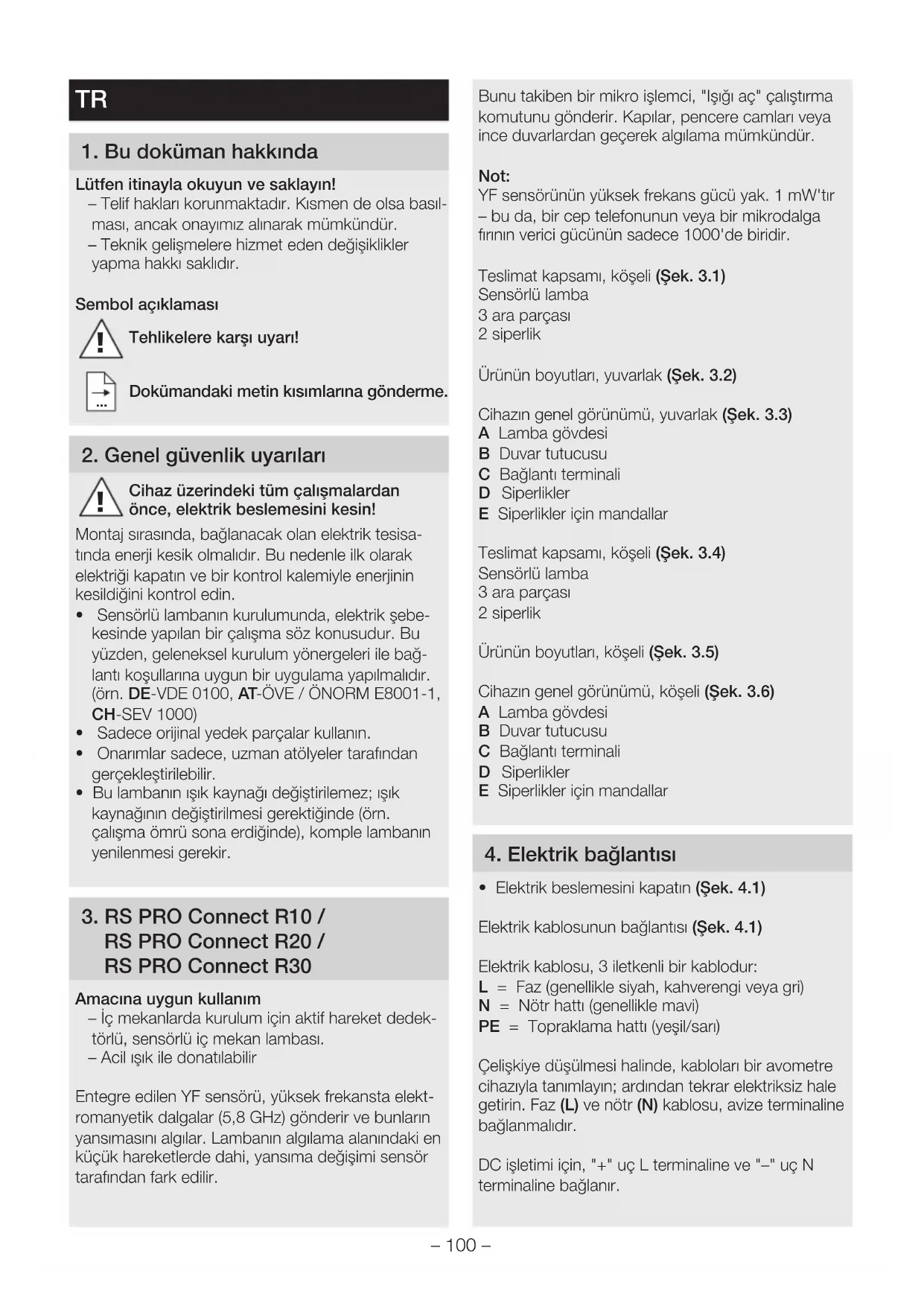 RS PRO Connect R20 / RS PRO Connect R30 Amacına uygun kullanım – İç mekanlarda kurulum için aktif hareket dedek- törlü, sensörlü iç mekan lambası. – Acil ışık ile donatılabilir Entegre edilen YF sensörü, yüksek frekansta elekt- romanyetik dalgalar (5,8GHz) gönderir ve bunların yansımasını algılar. Lambanın algılama alanındaki en küçük hareketlerde dahi, yansıma değişimi sensör tarafından fark edilir. Bunu takiben bir mikro işlemci, "Işığı aç" çalıştırma komutunu gönderir. Kapılar, pencere camları veya ince duvarlardan geçerek algılama mümkündür. Not: YF sensörünün yüksek frekans gücü yak. 1 mW'tır – bu da, bir cep telefonunun veya bir mikrodalga fırının verici gücünün sadece 1000'de biridir. Teslimat kapsamı, köşeli (Şek.3.1) Sensörlü lamba 3 ara parçası 2 siperlik Ürünün boyutları, yuvarlak (Şek.3.2) Cihazın genel görünümü, yuvarlak (Şek.3.3) A Lamba gövdesi B Duvar tutucusu C Bağlantı terminali D Siperlikler E Siperlikler için mandallar Teslimat kapsamı, köşeli (Şek.3.4) Sensörlü lamba 3 ara parçası 2 siperlik Ürünün boyutları, köşeli (Şek.3.5) Cihazın genel görünümü, köşeli (Şek.3.6) A Lamba gövdesi B Duvar tutucusu C Bağlantı terminali D Siperlikler E Siperlikler için mandallar
