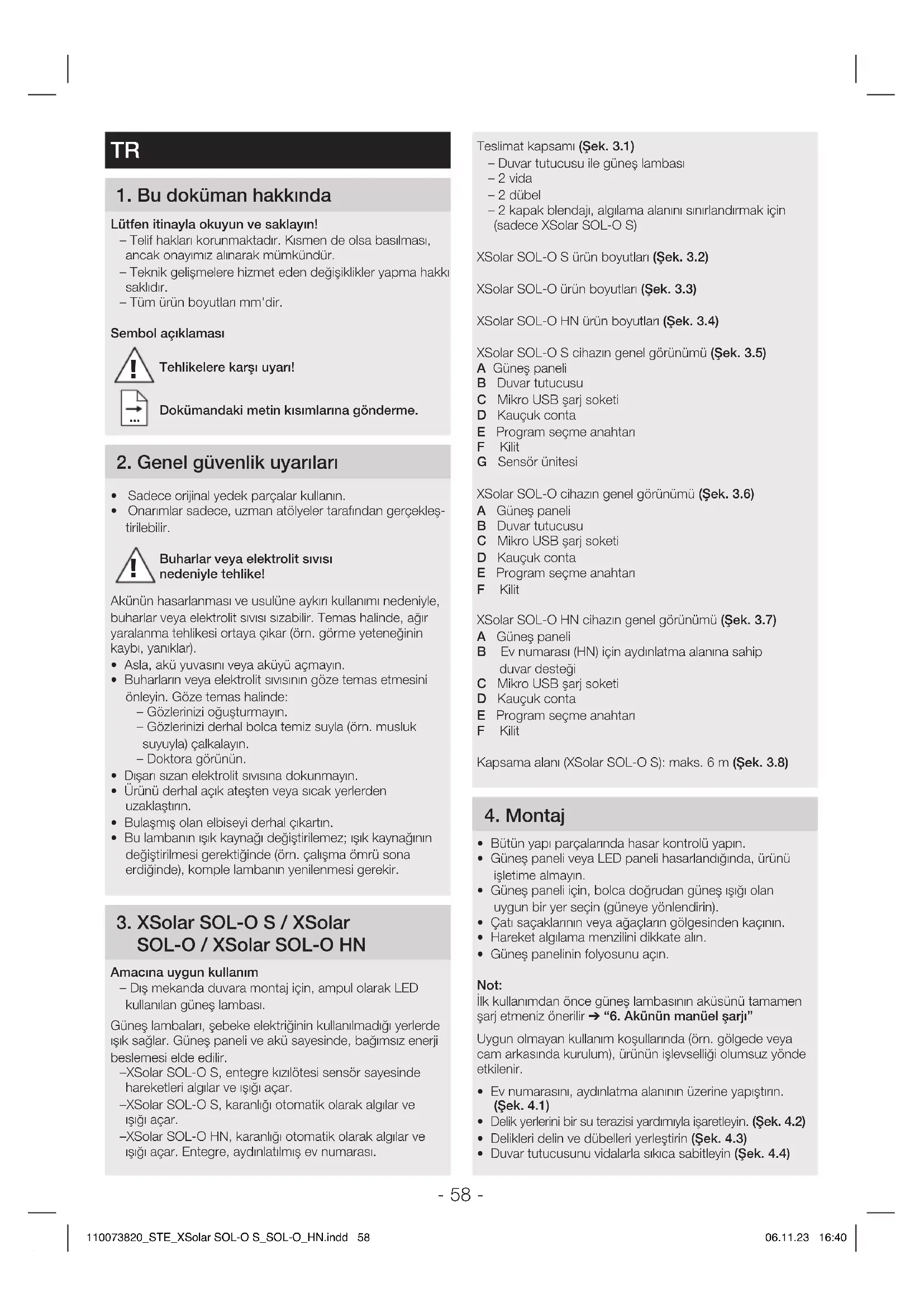 110073820_STE_XSolar SOL-O S_SOL-O_HN.indd 57110073820_STE_XSolar SOL-O S_SOL-O_HN.indd 57 06.11.23 16:4006.11.23 16:40- 58 - Teslimat kapsamı (Şek 31) – Duvar tutucusu ile güneş lambası – 2 vida – 2 dübel – 2 kapak blendajı, algılama alanını sınırlandırmak için (sadece XSolarSOL-OS) XSolarSOL-OS ürün boyutları (Şek 32) XSolarSOL-O ürün boyutları (Şek 33) XSolarSOL-OHN ürün boyutları (Şek 34) XSolarSOL-OS cihazın genel görünümü (Şek 35) A Güneş paneli B Duvar tutucusu C Mikro USB şarj soketi D Kauçuk conta E Program seçme anahtarı F Kilit G Sensör ünitesi XSolarSOL-O cihazın genel görünümü (Şek 36) A Güneş paneli B Duvar tutucusu C Mikro USB şarj soketi D Kauçuk conta E Program seçme anahtarı F Kilit XSolarSOL-OHN cihazın genel görünümü (Şek 37) A Güneş paneli B Ev numarası (HN) için aydınlatma alanına sahip duvar desteği C Mikro USB şarj soketi D Kauçuk conta E Program seçme anahtarı F Kilit Kapsama alanı (XSolarSOL-OS): maks. 6m (Şek 38) 4 Montaj