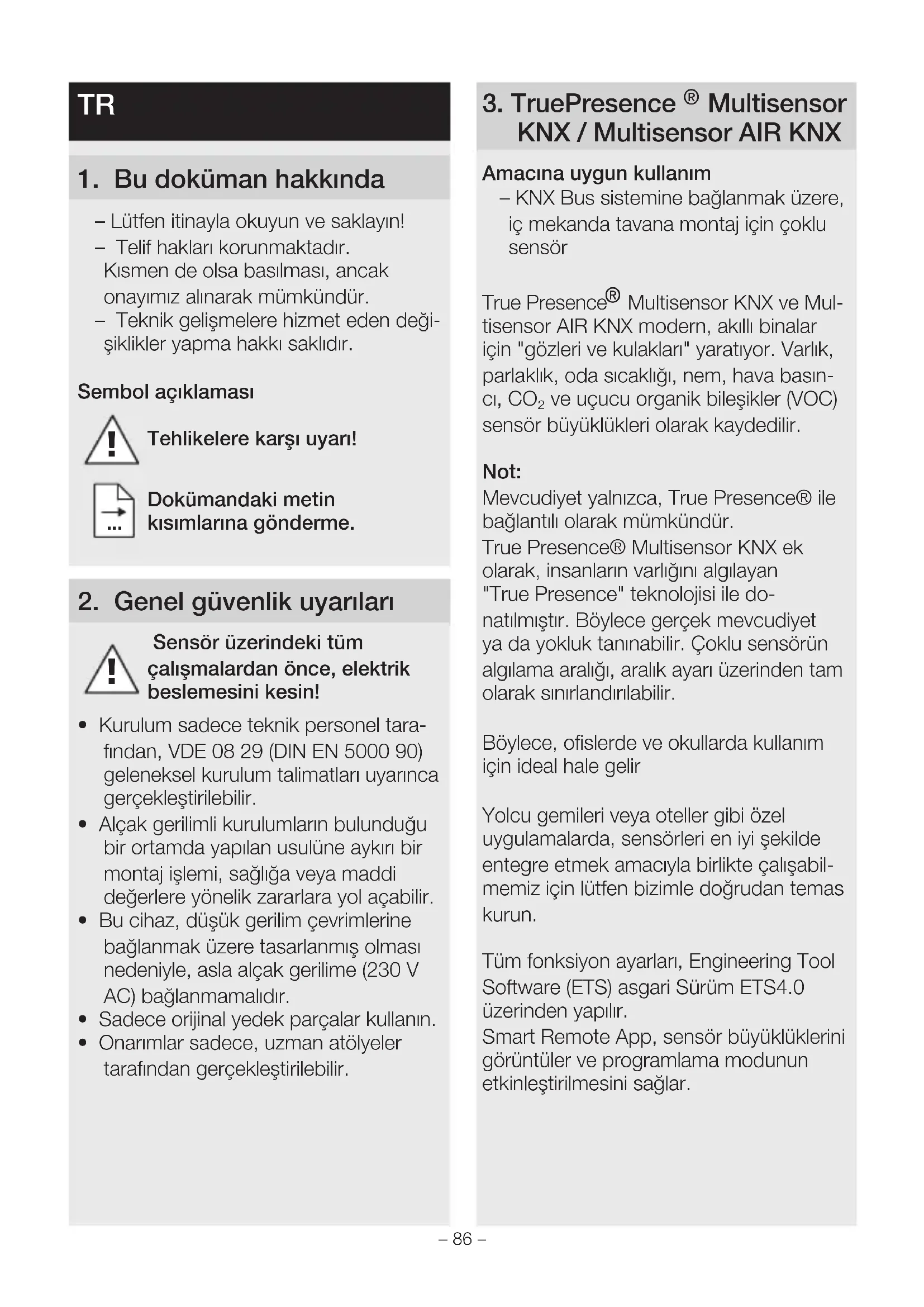 Multisensor KNX ve Mul- tisensor AIR KNX modern, akıllı binalar için "gözleri ve kulakları" yaratıyor. Varlık, parlaklık, oda sıcaklığı, nem, hava basın- cı, CO₂ ve uçucu organik bileşikler (VOC) sensör büyüklükleri olarak kaydedilir. Not: Mevcudiyet yalnızca, True Presence® ile bağlantılı olarak mümkündür. True Presence® Multisensor KNX ek olarak, insanların varlığını algılayan "TruePresence" teknolojisi ile do- natılmıştır. Böylece gerçek mevcudiyet ya da yokluk tanınabilir. Çoklu sensörün algılama aralığı, aralık ayarı üzerinden tam olarak sınırlandırılabilir. Böylece, ofislerde ve okullarda kullanım için ideal hale gelir Yolcu gemileri veya oteller gibi özel uygulamalarda, sensörleri en iyi şekilde entegre etmek amacıyla birlikte çalışabil- memiz için lütfen bizimle doğrudan temas kurun. Tüm fonksiyon ayarları, Engineering Tool Software (ETS) asgari Sürüm ETS4.0 üzerinden yapılır. Smart Remote App, sensör büyüklüklerini görüntüler ve programlama modunun etkinleştirilmesini sağlar.– 86 – – 87 – Montaj adımları Sıva altı – Çerçeveyi montaj kutusuna vidalayın (Şek.5.1) – Geçme bağlantıyı bağlayın (Şek.5.2) – Sensörü çerçevenin üzerine oturtun (Şek.5.3)