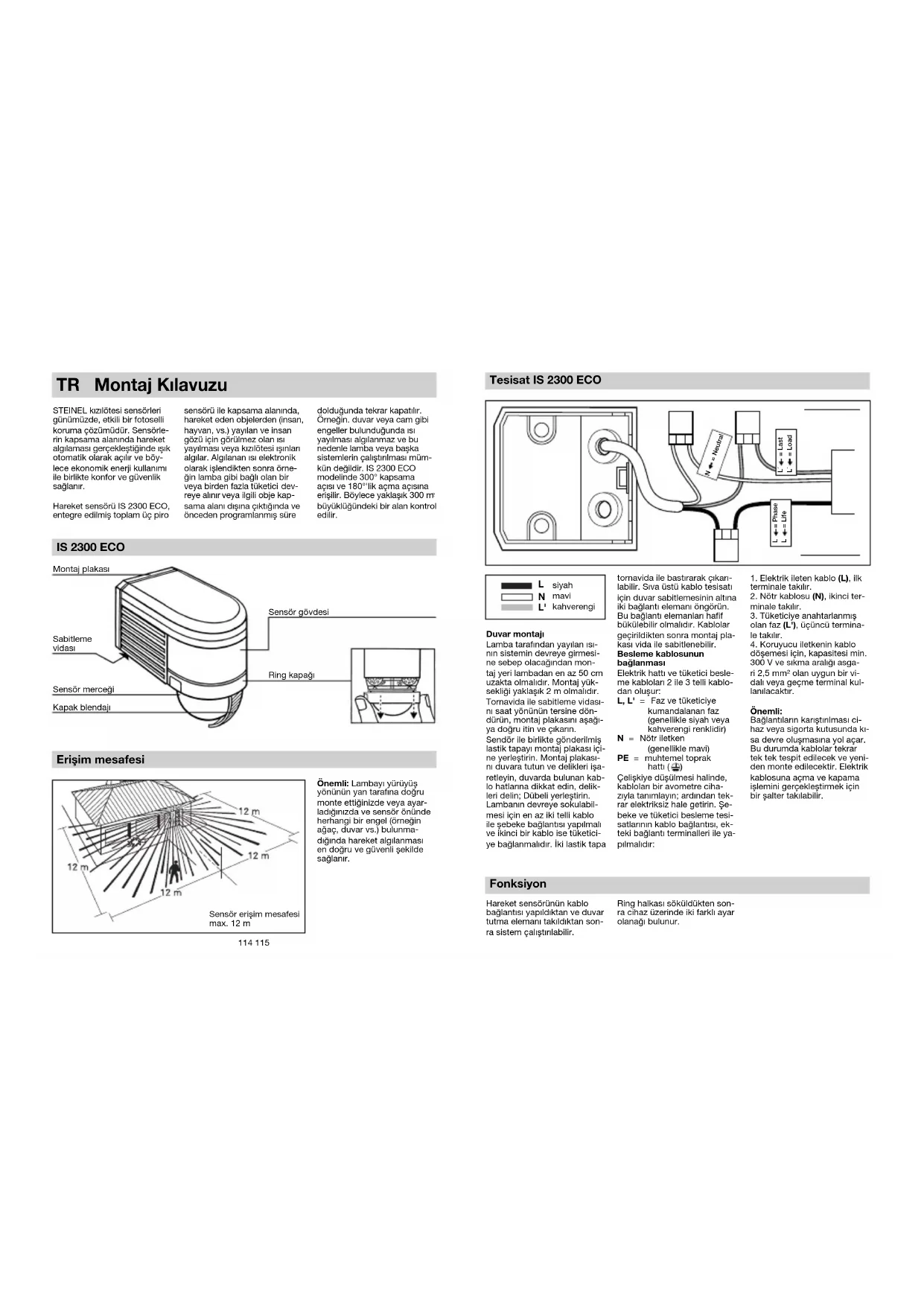 ΕΓΓΥΗΣΗ114 115 Montaj Kılavuzu STEINEL kızılötesi sensörleri günümüzde, etkili bir fotoselli koruma çözümüdür. Sensörle- rin kapsama alanında hareket algılaması gerçekleştiğinde ışık otomatik olarak açılır ve böy- lece ekonomik enerji kullanımı ile birlikte konfor ve güvenlik sağlanır. Hareket sensörü IS2300ECO, entegre edilmiş toplam üç piro sensörü ile kapsama alanında, hareket eden objelerden (insan, hayvan, vs.) yayılan ve insan gözü için görülmez olan ısı yayılması veya kızılötesi ışınları algılar. Algılanan ısı elektronik olarak işlendikten sonra örne- ğin lamba gibi bağlı olan bir veya birden fazla tüketici dev- reye alınır veya ilgili obje kap- sama alanı dışına çıktığında ve önceden programlanmış süre dolduğunda tekrar kapatılır. Örneğin. duvar veya cam gibi engeller bulunduğunda ısı yayılması algılanmaz ve bu nedenle lamba veya başka sistemlerin çalıştırılması müm- kün değildir. IS2300ECO modelinde 300° kapsama açısı ve 180°'lik açma açısına erişilir. Böylece yaklaşık 300m