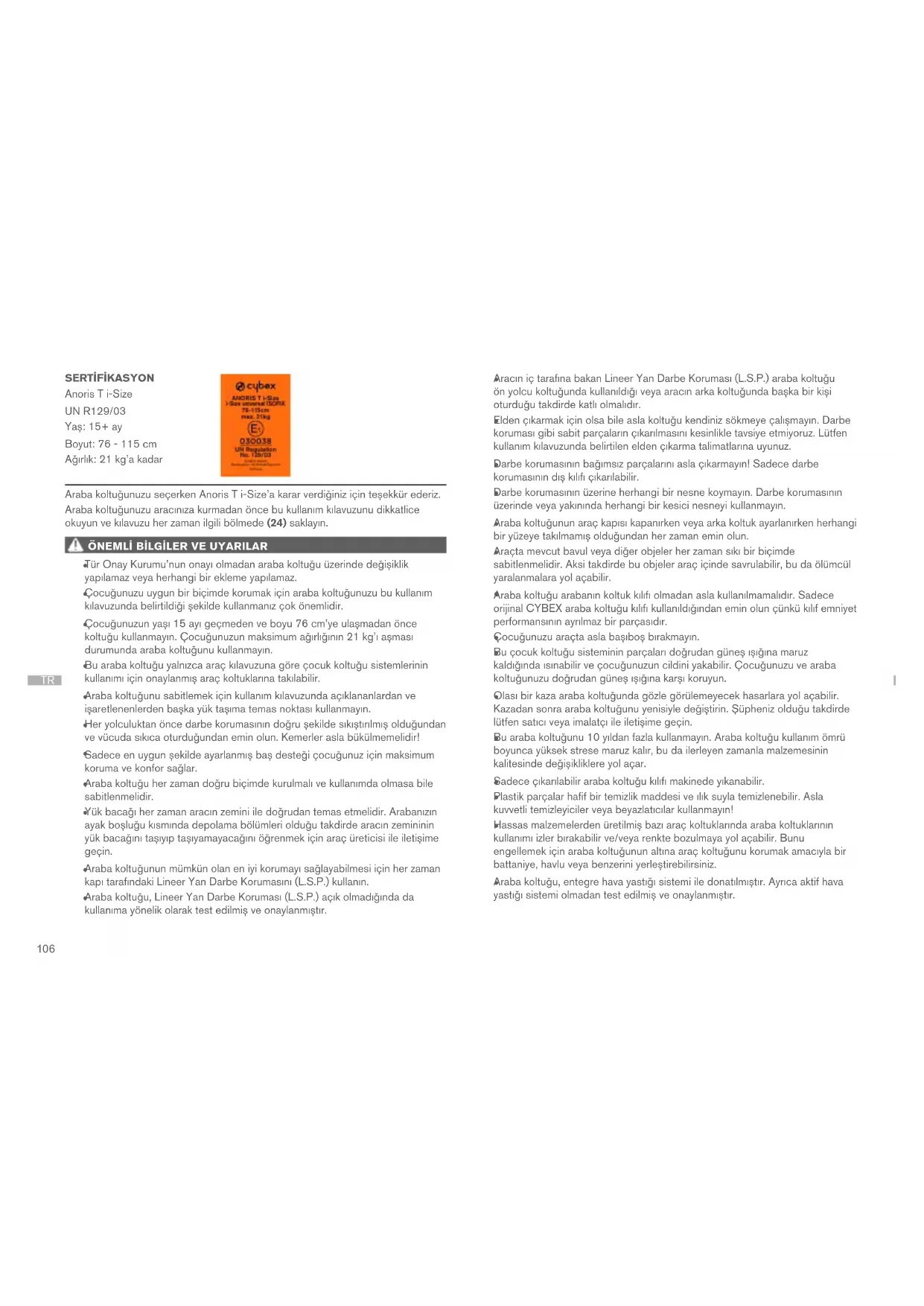 Bu bir i-Size Geliştirilmiş Çocuk Koltuğu Sistemidir. BM Yönetmeliği No. R129/03’e göre, i-Size ile uyumlu koltuk konumlarında, araç kullanım kılavuzlarında belirtildiği şekilde kullanım için onaylanmıştır. Aracınızda i-Size ile uyumlu koltuk konumu yoksa kullanımına izin verilip verilmediğini öğrenmek için ekteki araç türü listesini kontrol ediniz. Tür Listesi’nin en güncel versiyonunu www.cybex-online.com adresinden elde edebilirsiniz. Aracınızda ISOFIX donanımı yoksa, araba koltuğu kullanılamaz. Aracınızda yeterli boşluk yoksa, Lineer Yan Darbe Koruması (L.S.P.) katlanarak kapatılabilir. Onaylı tüm araçlarda tüm oturma ve yatma konumlarının kullanılabileceği garanti edilemez.