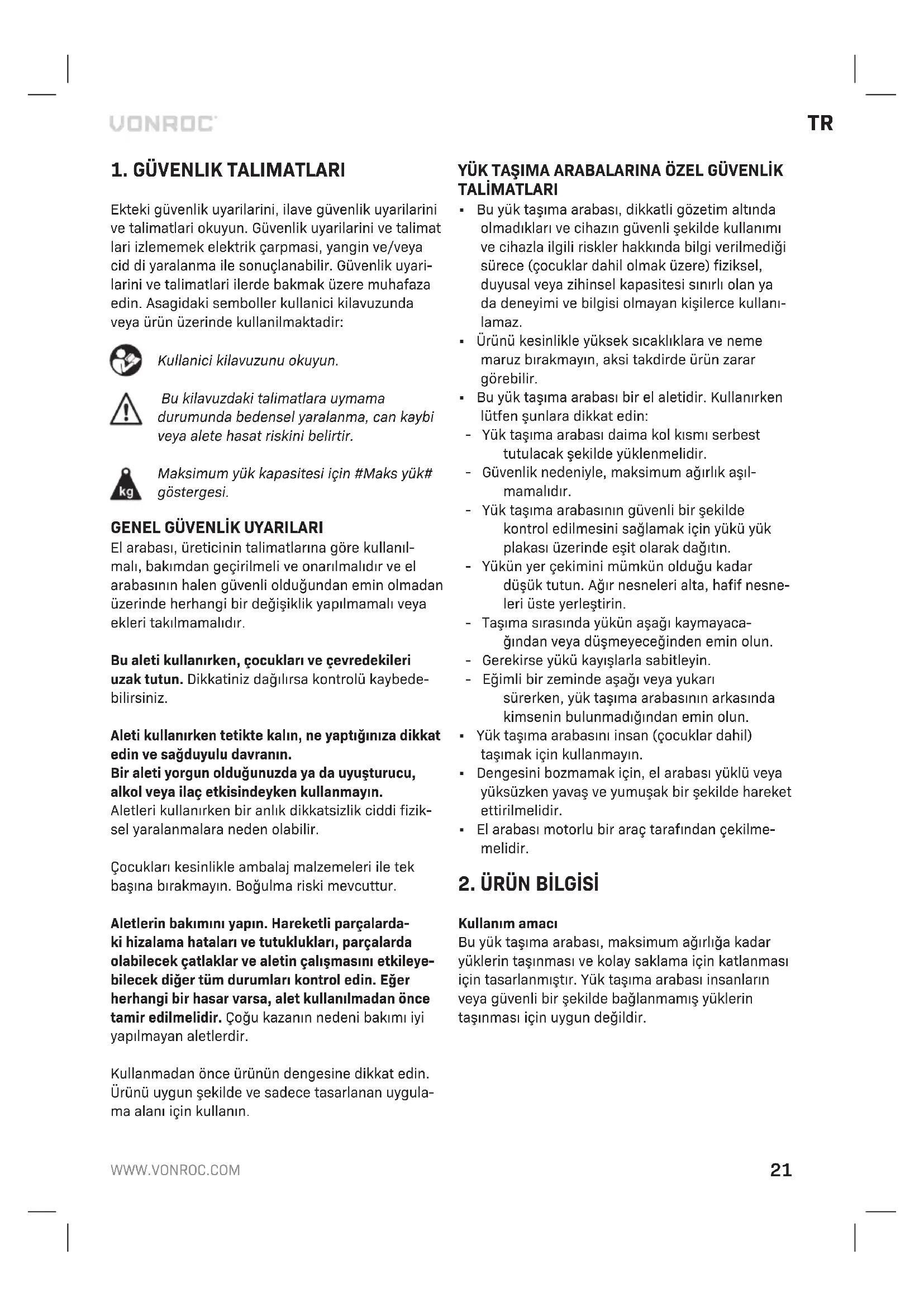 El arabası, üreticinin talimatlarına göre kullanıl- malı, bakımdan geçirilmeli ve onarılmalıdır ve el arabasının halen güvenli olduğundan emin olmadan üzerinde herhangi bir değişiklik yapılmamalı veya ekleri takılmamalıdır. Bu aleti kullanırken, çocukları ve çevredekileri uzak tutun. Dikkatiniz dağılırsa kontrolü kaybede- bilirsiniz. Aleti kullanırken tetikte kalın, ne yaptığınıza dikkat edin ve sağduyulu davranın. Bir aleti yorgun olduğunuzda ya da uyuşturucu, alkol veya ilaç etkisindeyken kullanmayın. Aletler kullanırken br anlık dkkatszlk cdd fzk- sel yaralanmalara neden olablr. Çocukları kesinlikle ambalaj malzemeleri ile tek başına bırakmayın. Boğulma riski mevcuttur. Aletlerin bakımını yapın. Hareketli parçalarda- ki hizalama hataları ve tutuklukları, parçalarda olabilecek çatlaklar ve aletin çalışmasını etkileye- bilecek diğer tüm durumları kontrol edin. Eğer herhangi bir hasar varsa, alet kullanılmadan önce tamir edilmelidir. Çoğu kazanın nedeni bakımı iyi yapılmayan aletlerdir. Kullanmadan önce ürünün dengesine dikkat edin. Ürünü uygun şekilde ve sadece tasarlanan uygula- ma alanı için kullanın. YÜK TAŞIMA ARABALARINA ÖZEL GÜVENLİK TALİMATLARI