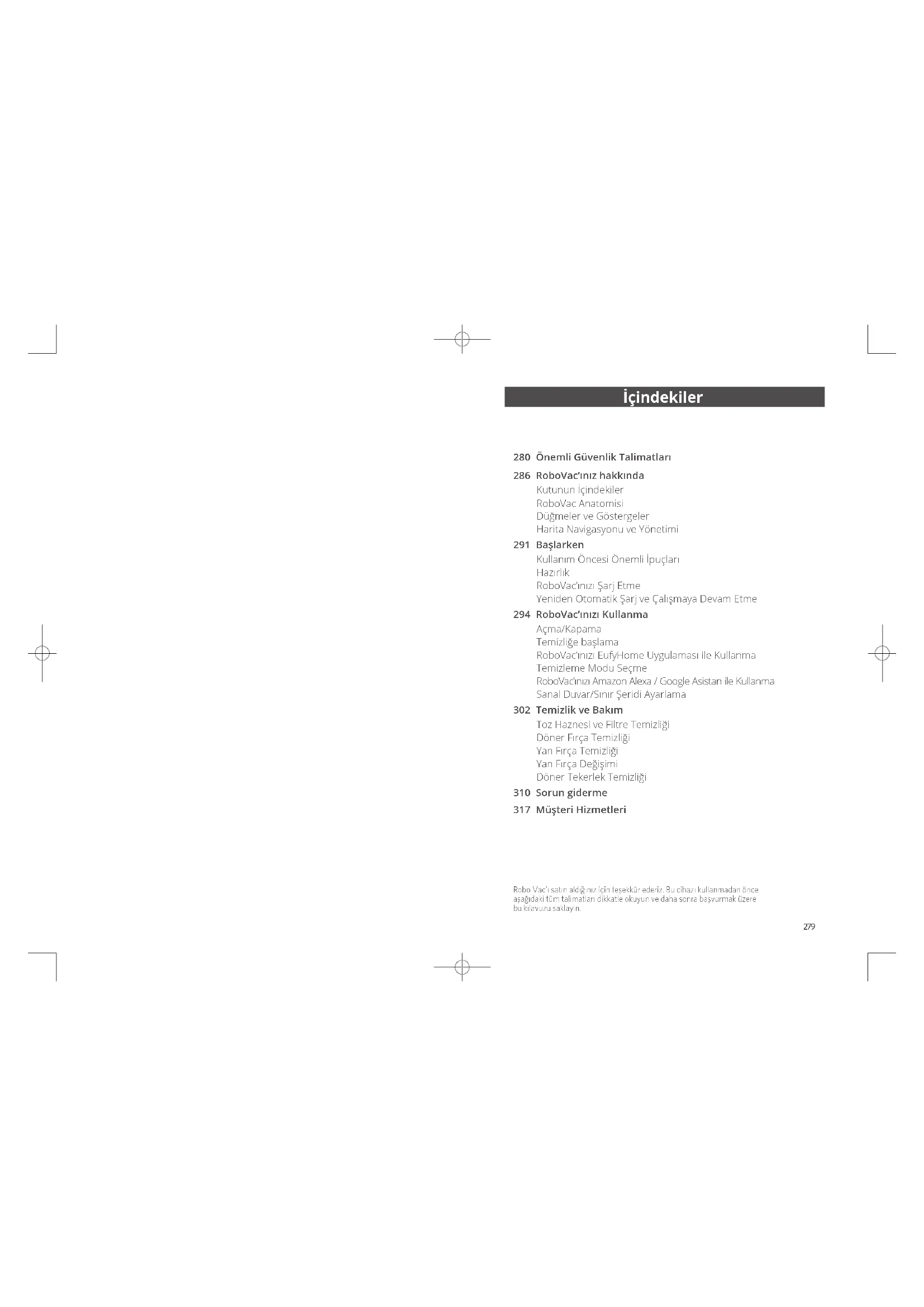 Пример: если SN - ACEGE51924201317, дата производства будет вторник 24-й недели в 2019 году. Служба техподдержки Более подробную информацию и ответы на часто задаваемые вопросы можно найти на сайте https://support.eufylife.com/. support@eufylife.com support.mea@anker.com (US) +1 (800) 988 7973 Mon-Fri 6:15 - 17:00 (PT) Sat-Sun 6:30-16:30 (PT) (UK) +44 (0) 1604 936200 Mon-Sun 6:00 - 17:00 Sat-Sun 6:00-14:00 (DE) +49 (0) 69 9579 7960 Mo-Fr 8:00 - 16:00 (日本) 03 4455 7823 月-金 9:00 - 17:00 www.eufylife.com https://support.eufylife.com/s/phonecontactus Отсканируйте QR-код, чтобы получить дополнительную справочную информацию. Гарантия: 1 год Срок службы: 2 года Компания Anker Innovations Limited Офис 1318-19, Голливуд Плаза, 610 Натан Роуд, Могкок, Коулун, Гонконг (Room 1318-19, Hollywood Plaza, 610 Nathan Road, Mongkok, Kowloon, Hong Kong)279 Robo Vac’ı satın aldığınız için teşekkür ederiz. Bu cihazı kullanmadan önce aşağıdaki tüm talimatları dikkatle okuyun ve daha sonra başvurmak üzere bu kılavuzu saklayın. İçindekiler 280 ÖnemliGüvenlikTalimatları 286 RoboVac’ınızhakkında Kutunun İçindekiler RoboVac Anatomisi Düğmeler ve Göstergeler Harita Navigasyonu ve Yönetimi 291 Başlarken Kullanım Öncesi Önemli İpuçları Hazırlık RoboVac’ınızı Şarj Etme Yeniden Otomatik Şarj ve Çalışmaya Devam Etme 294 RoboVac’ınızıKullanma Açma/Kapama Temizliğe başlama RoboVac’ınızı EufyHome Uygulaması ile Kullanma Temizleme Modu Seçme RoboVac’ınızı Amazon Alexa / Google Asistan ile Kullanma Sanal Duvar/Sınır Şeridi Ayarlama 302 TemizlikveBakım Toz Haznesi ve Filtre Temizliği Döner Fırça Temizliği Yan Fırça Temizliği Yan Fırça Değişimi Döner Tekerlek Temizliği 310 Sorungiderme 317 MüşteriHizmetleriTürk Türk