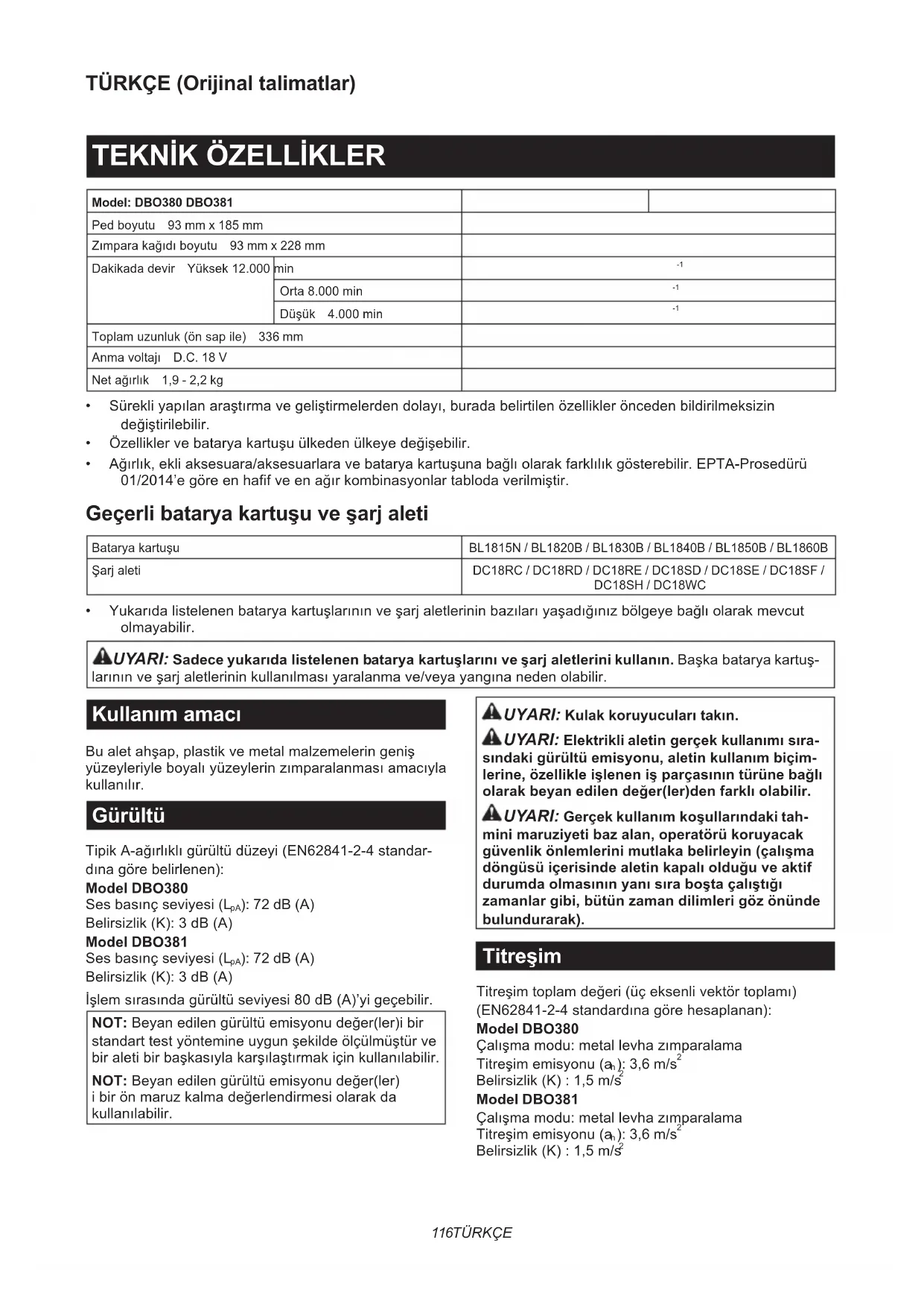 - Yukarıdalistelenenbataryakartuşlarınınveşarjaletlerininbazılarıyaşadığınızbölgeyebağlıolarakmevcut olmayabilir. UYARI: Sadece yukarıda listelenen batarya kartuşlarını ve şarj aletlerini kullanın.Başkabataryakartuş- larınınveşarjaletlerininkullanılmasıyaralanmave/veyayangınanedenolabilir. Kullanım amacı Bualetahşap,plastikvemetalmalzemeleringeniş yüzeyleriyleboyalıyüzeylerinzımparalanmasıamacıyla kullanılır. Gürültü TipikA-ağırlıklıgürültüdüzeyi(EN62841-2-4standar- dınagörebelirlenen): Model DBO380 Sesbasınçseviyesi(L