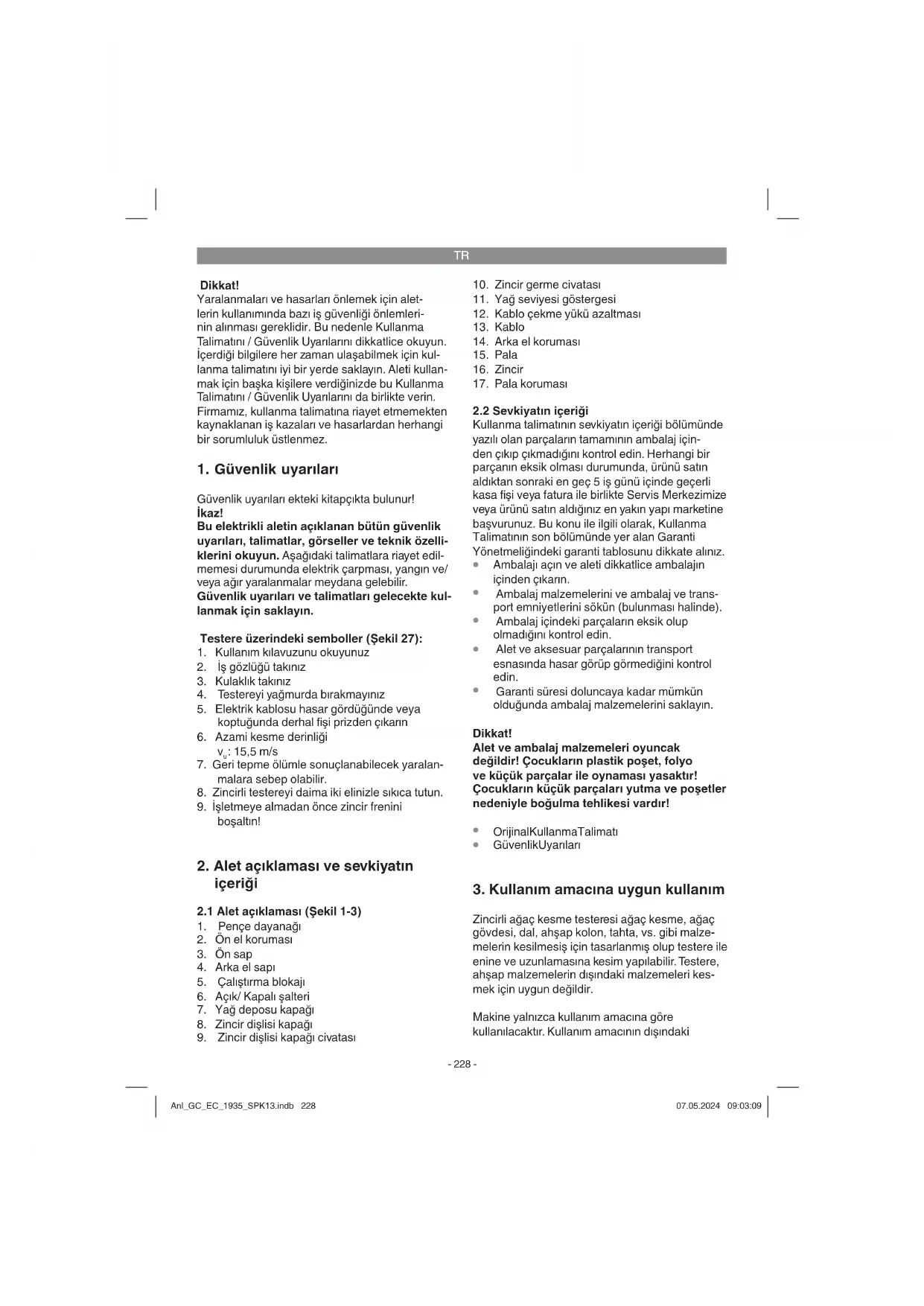 Zincirli ağaç kesme testeresi ağaç kesme, ağaç gövdesi, dal, ahşap kolon, tahta, vs. gibi malze- melerin kesilmesiş için tasarlanmış olup testere ile enine ve uzunlamasına kesim yapılabilir. Testere, ahşap malzemelerin dışındaki malzemeleri kes- mek için uygun değildir. Makine yalnızca kullanım amacına göre kullanılacaktır. Kullanım amacının dışındaki Anl_GC_EC_1935_SPK13.indb 228Anl_GC_EC_1935_SPK13.indb 228 07.05.2024 09:03:0907.05.2024 09:03:09TR