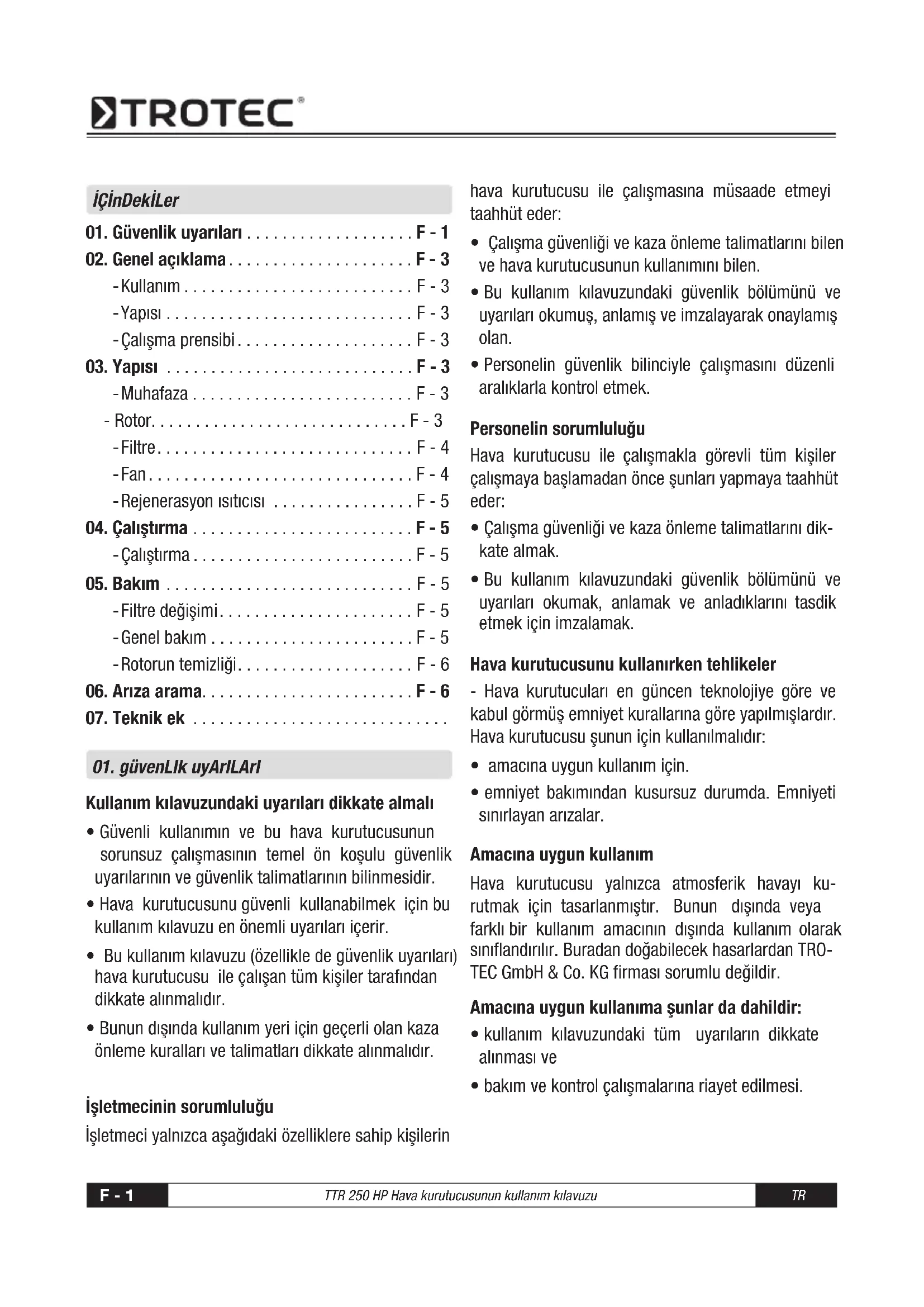 - emniyet bakımından kusursuz durumda. Emniyeti sınırlayan arızalar. Amacına uygun kullanım Hava kurutucusu yalnızca atmosferik havayı ku- rutmak için tasarlanmıştır. Bunun dışında veya farklı bir kullanım amacının dışında kullanım olarak sınıflandırılır. Buradan doğabilecek hasarlardan TRO- TEC GmbH & Co. KG firması sorumlu değildir. Amacına uygun kullanıma şunlar da dahildir: