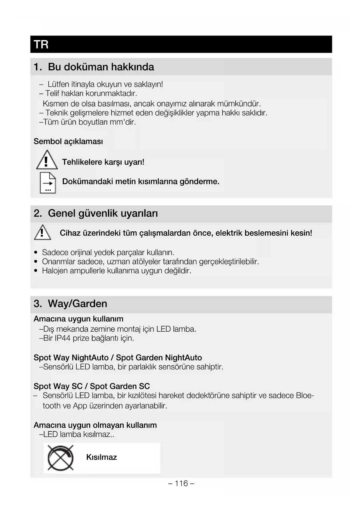 Amacına uygun kullanım – Dış mekanda zemine montaj için LED lamba. – Bir IP44 prize bağlantı için. Spot Way NightAuto / Spot Garden NightAuto – Sensörlü LED lamba, bir parlaklık sensörüne sahiptir. Spot Way SC / Spot Garden SC – Sensörlü LED lamba, bir kızılötesi hareket dedektörüne sahiptir ve sadece Bloe- tooth ve App üzerinden ayarlanabilir. Amacına uygun olmayan kullanım – LED lamba kısılmaz.. Kısılmaz– 117 – Spot Way teslimat kapsamı (Şek. 3.1) – Direk, zemin plakası ve elektrik fişli bağlantı kablosu dahil lamba – üç vida – üç dübel Spot Garden teslimat kapsamı (Şek. 3.2) – Elektrik fişli bağlantı kablosu dahil lamba – Çakma çubuğu – iki vida Spot Way ürün boyutları (Şek. 3.3) Spot Garden ürün boyutları (Şek. 3.4) Ürüne genel bakış (Şek. 3.5-3.10) A Lamba gövdesi B Hareket sensörü (sadece Spot Way / Spot Garden SC) C Parlaklık sensörü (sadece Spot Way / Garden NightAuto) D Alacakaranlık ayarı (sadece Spot Way / Garden NightAuto) E Zemin plakası ile direk (sadece Spot Way) F Çakma çubuğu (sadece Spot Garden) G Fişli elektrik bağlantı kablosu Kapsama alanı Spot Way / Spot Garden SC (Şek. 3.11-3.16) Işık şiddeti dağılımı (Şek. 3.17)