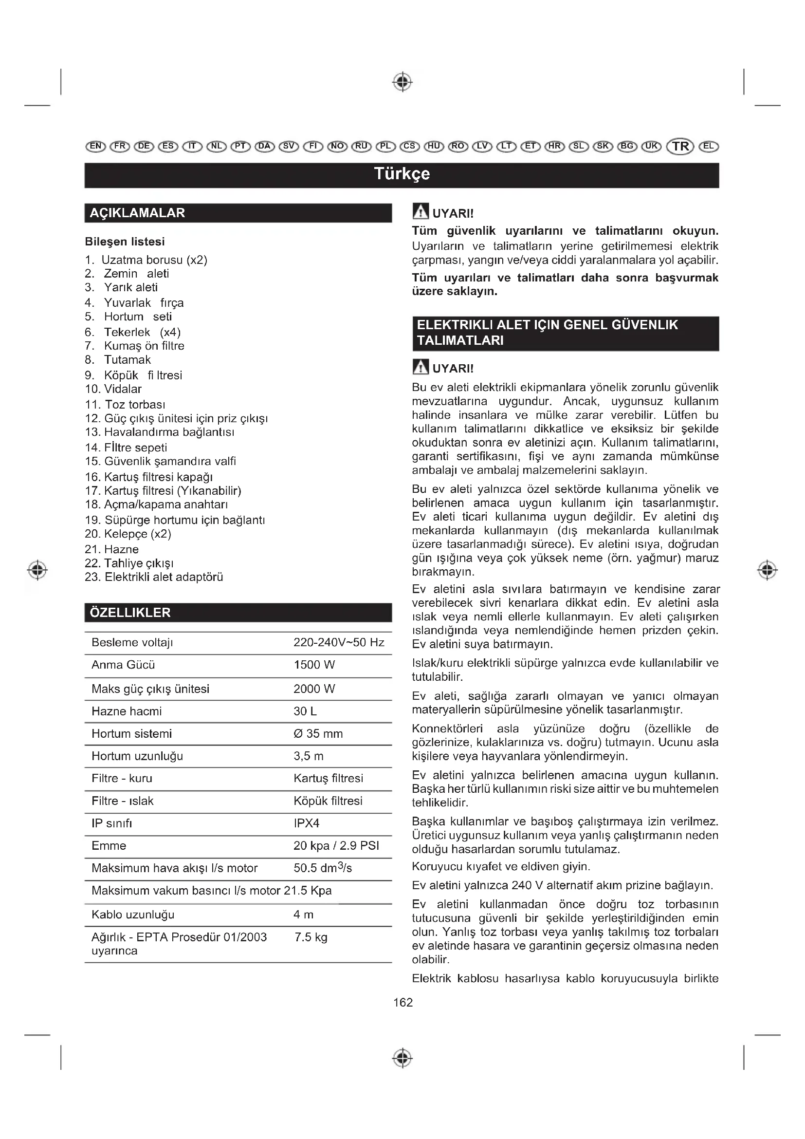 EN FR DE ES IT NL PT DA SV FI NO RU PL CS HU RO LV LT ET HR SL BGSK UK EL UYARI! Tüm güvenlik uyarılarını ve talimatlarını okuyun. Uyarıların ve talimatların yerine getirilmemesi elektrik çarpması, yangın ve/veya ciddi yaralanmalara yol açabilir. Tüm uyarıları ve talimatları daha sonra başvurmak üzere saklayın. ELEKTRIKLI ALET IÇIN GENEL GÜVENLIK TALIMATLARI UYARI! Bu ev aleti elektrikli ekipmanlara yönelik zorunlu güvenlik mevzuatlarına uygundur. Ancak, uygunsuz kullanım halinde insanlara ve mülke zarar verebilir. Lütfen bu kullanım talimatlarını dikkatlice ve eksiksiz bir şekilde okuduktan sonra ev aletinizi açın. Kullanım talimatlarını, garanti sertifi kasını, fi şi ve aynı zamanda mümkünse ambalajı ve ambalaj malzemelerini saklayın. Bu ev aleti yalnızca özel sektörde kullanıma yönelik ve belirlenen amaca uygun kullanım için tasarlanmıştır. Ev aleti ticari kullanıma uygun değildir. Ev aletini dış mekanlarda kullanmayın (dış mekanlarda kullanılmak üzere tasarlanmadığı sürece). Ev aletini ısıya, doğrudan gün ışığına veya çok yüksek neme (örn. yağmur) maruz bırakmayın. Ev aletini asla sıvı lara batırmayın ve kendisine zarar verebilecek sivri kenarlara dikkat edin. Ev aletini asla ıslak veya nemli ellerle kullanmayın. Ev aleti çalışırken ıslandığında veya nemlendiğinde hemen prizden çekin. Ev aletini suya batırmayın. Islak/kuru elektrikli süpürge yalnızca evde kullanılabilir ve tutulabilir. Ev aleti, sağlığa zararlı olmayan ve yanıcı olmayan materyallerin süpürülmesine yönelik tasarlanmıştır. Konnektörleri asla yüzünüze doğru (özellikle de gözlerinize, kulaklarınıza vs. doğru) tutmayın. Ucunu asla kişilere veya hayvanlara yönlendirmeyin. Ev aletini yalnızca belirlenen amacına uygun kullanın. Başka her türlü kullanımın riski size aittir ve bu muhtemelen tehlikelidir. Başka kullanımlar ve başıboş çalıştırmaya izin verilmez. Üretici uygunsuz kullanım veya yanlış çal ıştırmanın neden olduğu hasarlardan sorumlu tutulamaz. Koruyucu kıyafet ve eldiven giyin. Ev aletini yalnızca 240 V alternatif akım prizine bağlayın. Ev aletini kullanmadan önce doğru toz torbasının tutucusuna güvenli bir şekilde yerleştirildiğinden emin olun. Yanlış toz torbası veya yanlış takılmış toz torbaları ev aletinde hasara ve garantinin geçersiz olmasına neden olabilir. Elektrik kablosu hasarlıysa kablo koruyucusuyla birlikte AÇIKLAMALAR Bileşen listesi