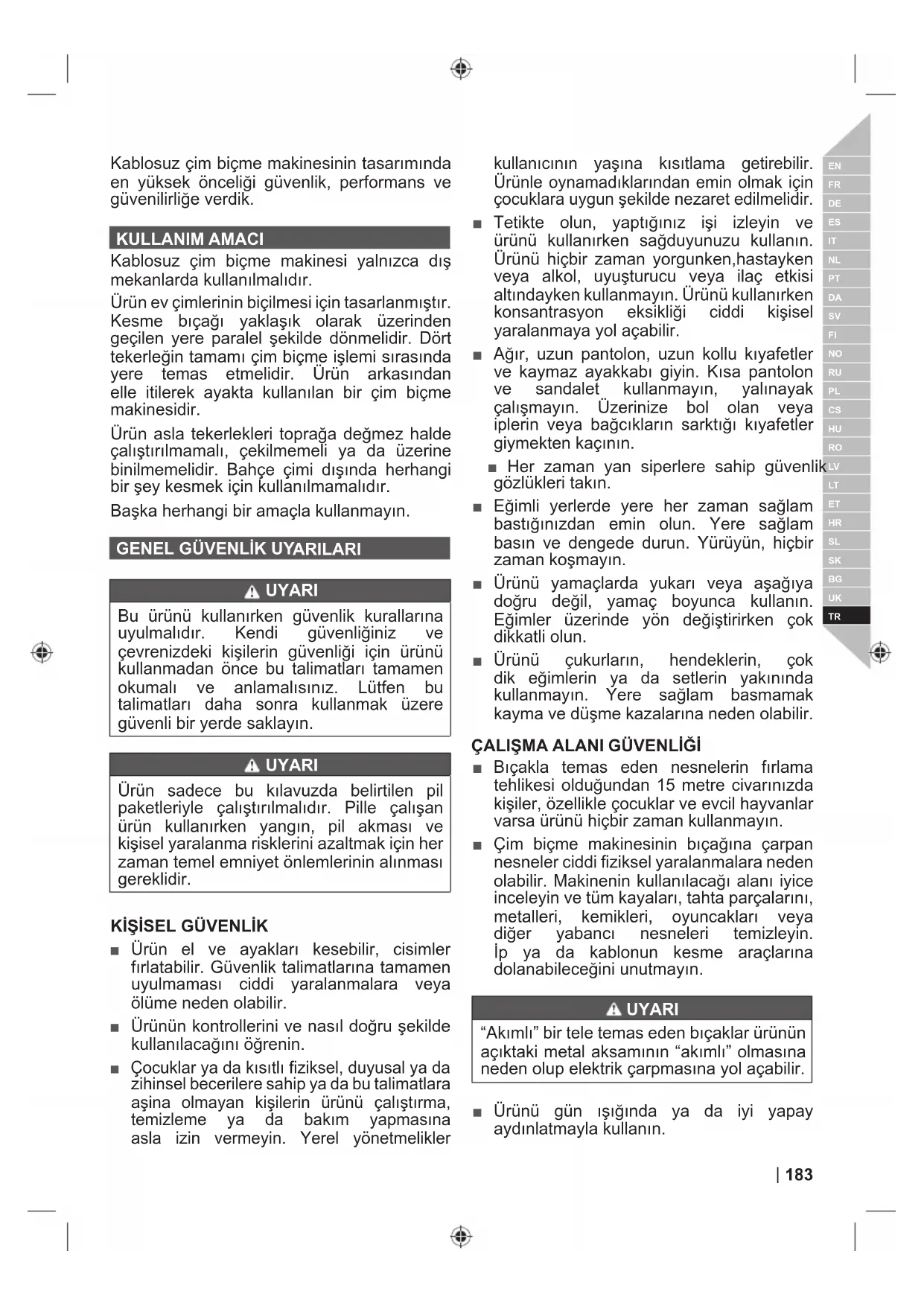 Попередження 182 | українськ а моваKablosuz çim biçme makinesinin tasarımında en yüksek önceliği güvenlik, performans ve güvenilirliğe verdik. KULLANIM AMACI Kablosuz çim biçme makinesi yalnızca dış mekanlarda kullanılmalıdır. Ürün ev çimlerinin biçilmesi için tasarlanmıştır. Kesme bıçağı yaklaşık olarak üzerinden geçilen yere paralel şekilde dönmelidir. Dört tekerleğin tamamı çim biçme işlemi sırasında yere temas etmelidir. Ürün arkasından elle itilerek ayakta kullanılan bir çim biçme makinesidir. Ürün asla tekerlekleri toprağa değmez halde çalıştırılmamalı, çekilmemeli ya da üzerine binilmemelidir. Bahçe çimi dışında herhangi bir şey kesmek için kullanılmamalıdır. Başka herhangi bir amaçla kullanmayın.