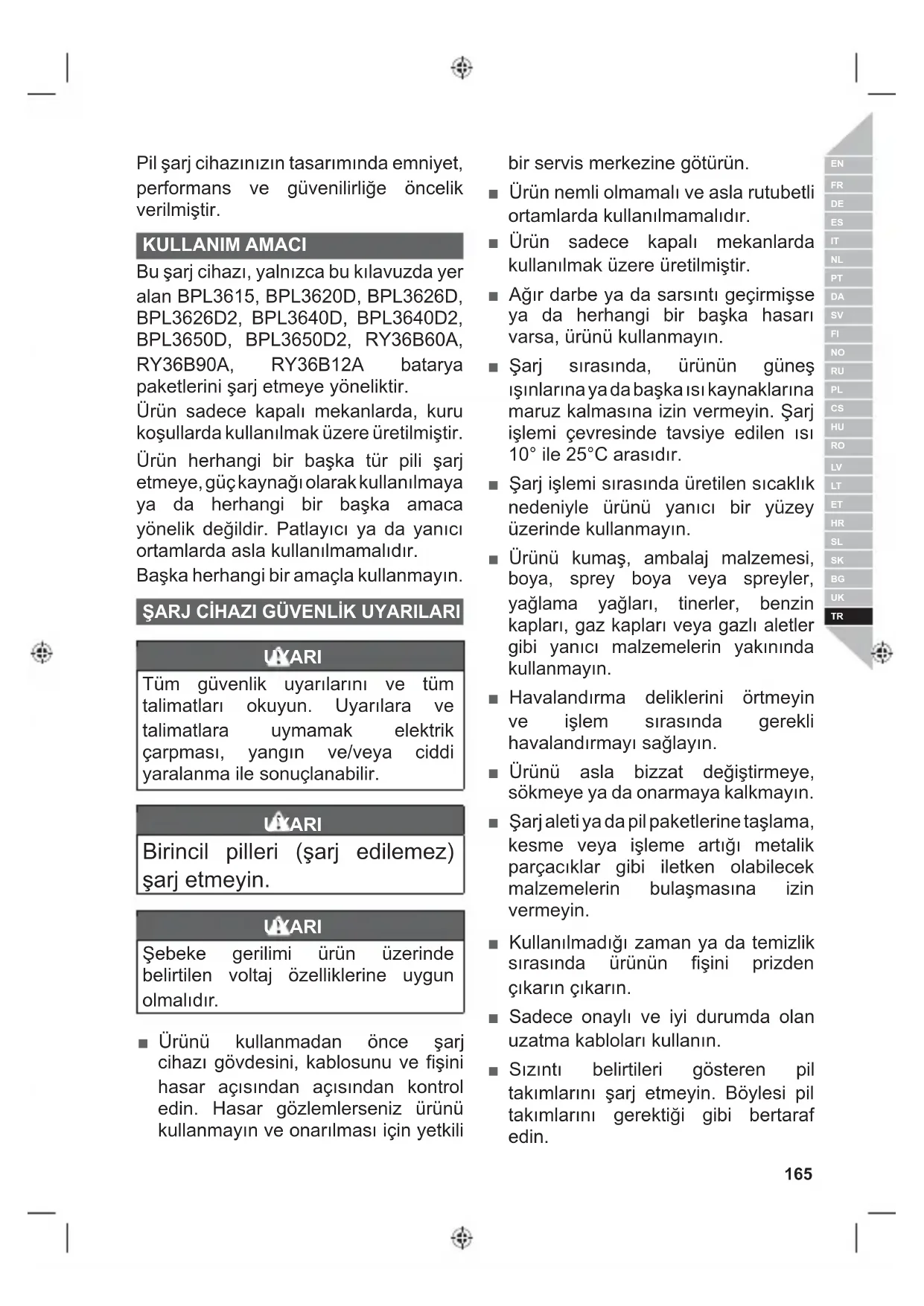 Pil şarj cihazınızın tasarımında emniyet, performans ve güvenilirliğe öncelik verilmiştir. KULLANIM AMACI Bu şarj cihazı, yalnızca bu kılavuzda yer alan BPL3615, BPL3620D, BPL3626D, BPL3626D2, BPL3640D, BPL3640D2, BPL3650D, BPL3650D2, RY36B60A, RY36B90A, RY36B12A batarya paketlerini şarj etmeye yöneliktir. Ürün sadece kapalı mekanlarda, kuru koşullarda kullanılmak üzere üretilmiştir. Ürün herhangi bir başka tür pili şarj etmeye, güç kaynağı olarak kullanılmaya ya da herhangi bir başka amaca yönelik değildir. Patlayıcı ya da yanıcı ortamlarda asla kullanılmamalıdır. Başka herhangi bir amaçla kullanmayın. ŞARJ CİHAZI GÜVENLİK UYARILARI UYARI Tüm güvenlik uyarılarını ve tüm talimatları okuyun. Uyarılara ve talimatlara uymamak elektrik çarpması, yangın ve/veya ciddi yaralanma ile sonuçlanabilir. UYARI Birincil pilleri (şarj edilemez) şarj etmeyin. UYARI Şebeke gerilimi ürün üzerinde belirtilen voltaj özelliklerine uygun olmalıdır. ■ Ürünü kullanmadan önce şarj cihazı gövdesini, kablosunu ve fişini hasar açısından açısından kontrol edin. Hasar gözlemlerseniz ürünü kullanmayın ve onarılması için yetkili bir servis merkezine götürün. ■ Ürün nemli olmamalı ve asla rutubetli ortamlarda kullanılmamalıdır. ■ Ürün sadece kapalı mekanlarda kullanılmak üzere üretilmiştir. ■ Ağır darbe ya da sarsıntı geçirmişse ya da herhangi bir başka hasarı varsa, ürünü kullanmayın. ■ Şarj sırasında, ürünün güneş ışınlarına ya da başka ısı kaynaklarına maruz kalmasına izin vermeyin. Şarj işlemi çevresinde tavsiye edilen ısı 10° ile 25°C arasıdır. ■ Şarj işlemi sırasında üretilen sıcaklık nedeniyle ürünü yanıcı bir yüzey üzerinde kullanmayın. ■ Ürünü kumaş, ambalaj malzemesi, boya, sprey boya veya spreyler, yağlama yağları, tinerler, benzin kapları, gaz kapları veya gazlı aletler gibi yanıcı malzemelerin yakınında kullanmayın. ■ Havalandırma deliklerini örtmeyin ve işlem sırasında gerekli havalandırmayı sağlayın. ■ Ürünü asla bizzat değiştirmeye, sökmeye ya da onarmaya kalkmayın. ■ Şarj aleti ya da pil paketlerine taşlama, kesme veya işleme artığı metalik parçacıklar gibi iletken olabilecek malzemelerin bulaşmasına izin vermeyin. ■ Kullanılmadığı zaman ya da temizlik sırasında ürünün fişini prizden çıkarın çıkarın. ■ Sadece onaylı ve iyi durumda olan uzatma kabloları kullanın. ■ Sızıntı belirtileri gösteren pil takımlarını şarj etmeyin. Böylesi pil takımlarını gerektiği gibi bertaraf edin.166 | Türkçe ■ Hasarlı bir pil takımını asla şarj etmeyin. Hasarlı pil takımlarını derhal değiştirin. ■ Her kullanım öncesinde güç kablosunu hasara karşı kontrol edin. Hasar belirtisi olması durumunda, tehlikeli bir durumdan kaçınmak için değiştirme işleminin yetkili bir servis merkezince yapılması gerekir. PİL İÇİN EK GÜVENLİK UYARILARI UYARI Bir kısa devreden kaynaklanan yangın, yaralanma veya ürün hasarları tehlikesini önlemek için aleti, güç paketini veya şarj cihazını asla sıvıların içine daldırmayınız ve cihazların ve pillerin içine sıvı girmesini önleyiniz. Tuzlu su, belirli kimyasallar, ağartıcı madde veya ağartıcı madde içeren ürünler gibi korozif veya iletken sıvılar kısa devreye neden olabilir. ÇEVRE KORUMASI Ham maddeleri atık olarak bertaraf etmek yerine geri dönüştürün. Makine, aksesuarlar ve ambalaj çevre dostu bir şekilde geri dönüştürülmek üzere sınıfl andırılmalıdır. KULLANİM