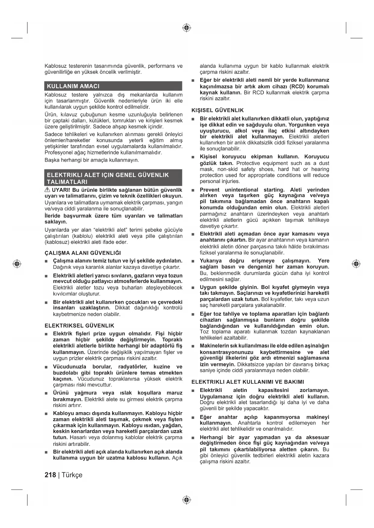 ■ Elektrikli aletin kapasitesini zorlamayın. Uygulamanız için doğru elektrikli aleti kullanın. Doğru elektrikli alet tasarlandığı işi daha iyi ve daha güvenli bir şekilde yapacaktır. ■ Eğer anahtar açılıp kapanmıyorsa makineyi kullanmayın. Anahtarla kontrol edilemeyen her elektrikli alet tehlikelidir ve onarılmalıdır. ■ Herhangi bir ayar yapmadan ya da aksesuar değiştirmeden önce fişi güç kaynağından ve/veya pil takımını çıkartılabiliyorsa aletten çıkarın. Bu gibi önleyici güvenlik tedbirleri elektrikli aletin kazara çalışma riskini azaltır. 218 | Türkçe■ Boş konumda olan elektrikli aletleri çocukların ulaşamayacağı yerde depolayın ve elektrikli aleti tanımayan veya bu talimatları bilmeyen kişilerin elektrikli aleti kullanmasına izin vermeyin. Elektrikli aletler eğitimsiz kullanıcıların elinde tehlikelidir. ■ Elektrikli aletlerin ve aksesuarların bakımını yapın. Hareketli parçaların hiza kaymasını ve bağlantısını, parçaların kırık olup olmadığını ve elektrikli aletin çalışmasını etkileyebilecek diğer durumları kontrol edin. Eğer hasarlıysa elektrikli aleti kullanmadan önce onartın. Pek çok kaza bakımı kötü yapılmış elektrikli aletlerden kaynaklanır. ■ Kesici aletleri keskin ve temiz tutun. Uygun şekilde bakımı yapılan keskin kesme kenarlarına sahip kesme aletlerinin sıkışma olasılığı daha azdır ve kontrol edilmesi daha kolaydır. ■ Elektrik aleti, aksesuarları ve alet uçlarını vb. çalışma koşullarını ve yapılacak çalışmayı dikkate alarak bu talimatlara uygun şekilde kullanın. Elektrikli aleti amaçlananlar dışındaki çalışmalar için kullanmak tehlikeli bir durumun oluşmasına yol açabilir. ■ Kulpları ve kavrama yüzeylerini kuru, temiz ve yağdan ve gresten arındırılmış hâlde tutun. Kaygan kulplar ve kavrama yüzeyleri beklenmedik durumlarda aletin güvenli şekilde taşınmasına ve kontrol edilmesine izin vermez.