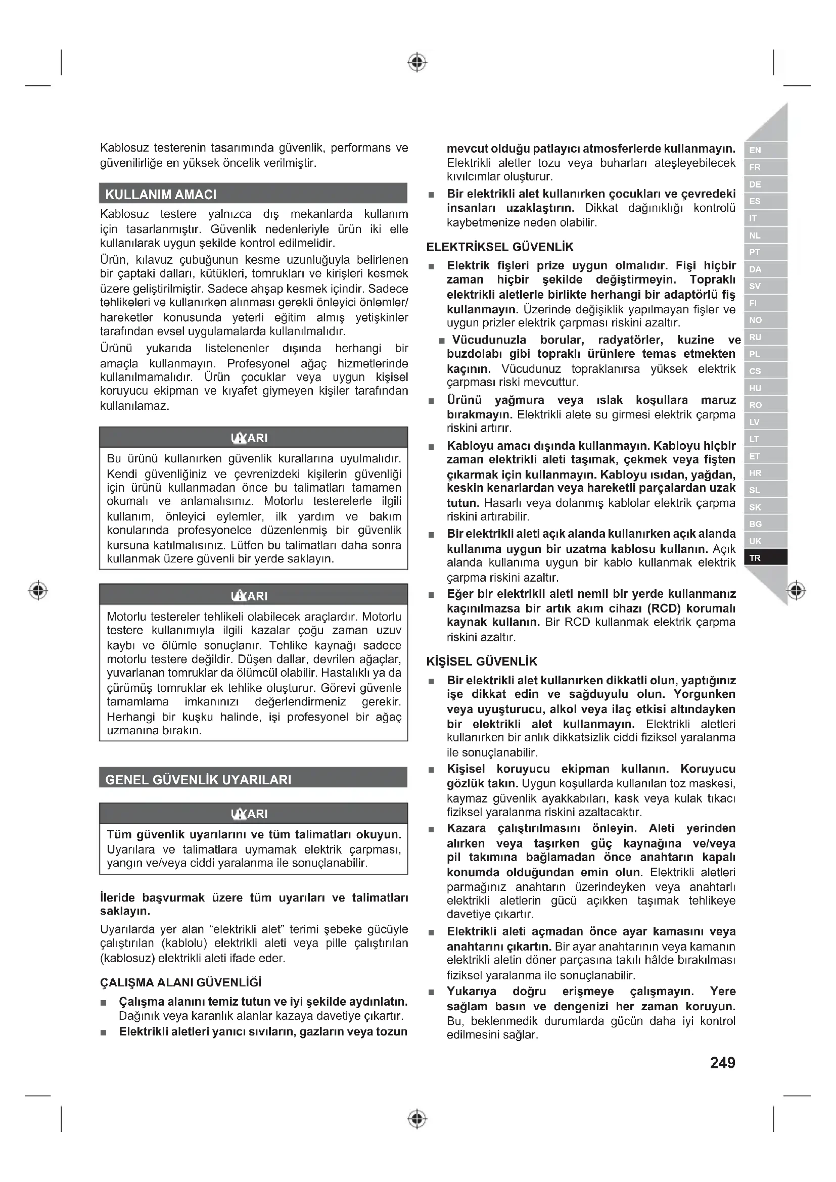Kablosuz testerenin tasarımında güvenlik, performans ve güvenilirliğe en yüksek öncelik verilmiştir. KULLANIM AMACI Kablosuz testere yalnızca dış mekanlarda kullanım için tasarlanmıştır. Güvenlik nedenleriyle ürün iki elle kullanılarak uygun şekilde kontrol edilmelidir. Ürün, kılavuz çubuğunun kesme uzunluğuyla belirlenen bir çaptaki dalları, kütükleri, tomrukları ve kirişleri kesmek üzere geliştirilmiştir. Sadece ahşap kesmek içindir. Sadece tehlikeleri ve kullanırken alınması gerekli önleyici önlemler/ hareketler konusunda yeterli eğitim almış yetişkinler tarafından evsel uygulamalarda kullanılmalıdır. Ürünü yukarıda listelenenler dışında herhangi bir amaçla kullanmayın. Profesyonel ağaç hizmetlerinde kullanılmamalıdır. Ürün çocuklar veya uygun kişisel koruyucu ekipman ve kıyafet giymeyen kişiler tarafından kullanılamaz. UYARI Bu ürünü kullanırken güvenlik kurallarına uyulmalıdır. Kendi güvenliğiniz ve çevrenizdeki kişilerin güvenliği için ürünü kullanmadan önce bu talimatları tamamen okumalı ve anlamalısınız. Motorlu testerelerle ilgili kullanım, önleyici eylemler, ilk yardım ve bakım konularında profesyonelce düzenlenmiş bir güvenlik kursuna katılmalısınız. Lütfen bu talimatları daha sonra kullanmak üzere güvenli bir yerde saklayın. UYARI Motorlu testereler tehlikeli olabilecek araçlardır. Motorlu testere kullanımıyla ilgili kazalar çoğu zaman uzuv kaybı ve ölümle sonuçlanır. Tehlike kaynağı sadece motorlu testere değildir. Düşen dallar, devrilen ağaçlar, yuvarlanan tomruklar da ölümcül olabilir. Hastalıklı ya da çürümüş tomruklar ek tehlike oluşturur. Görevi güvenle tamamlama imkanınızı değerlendirmeniz gerekir. Herhangi bir kuşku halinde, işi profesyonel bir ağaç uzmanına bırakın.