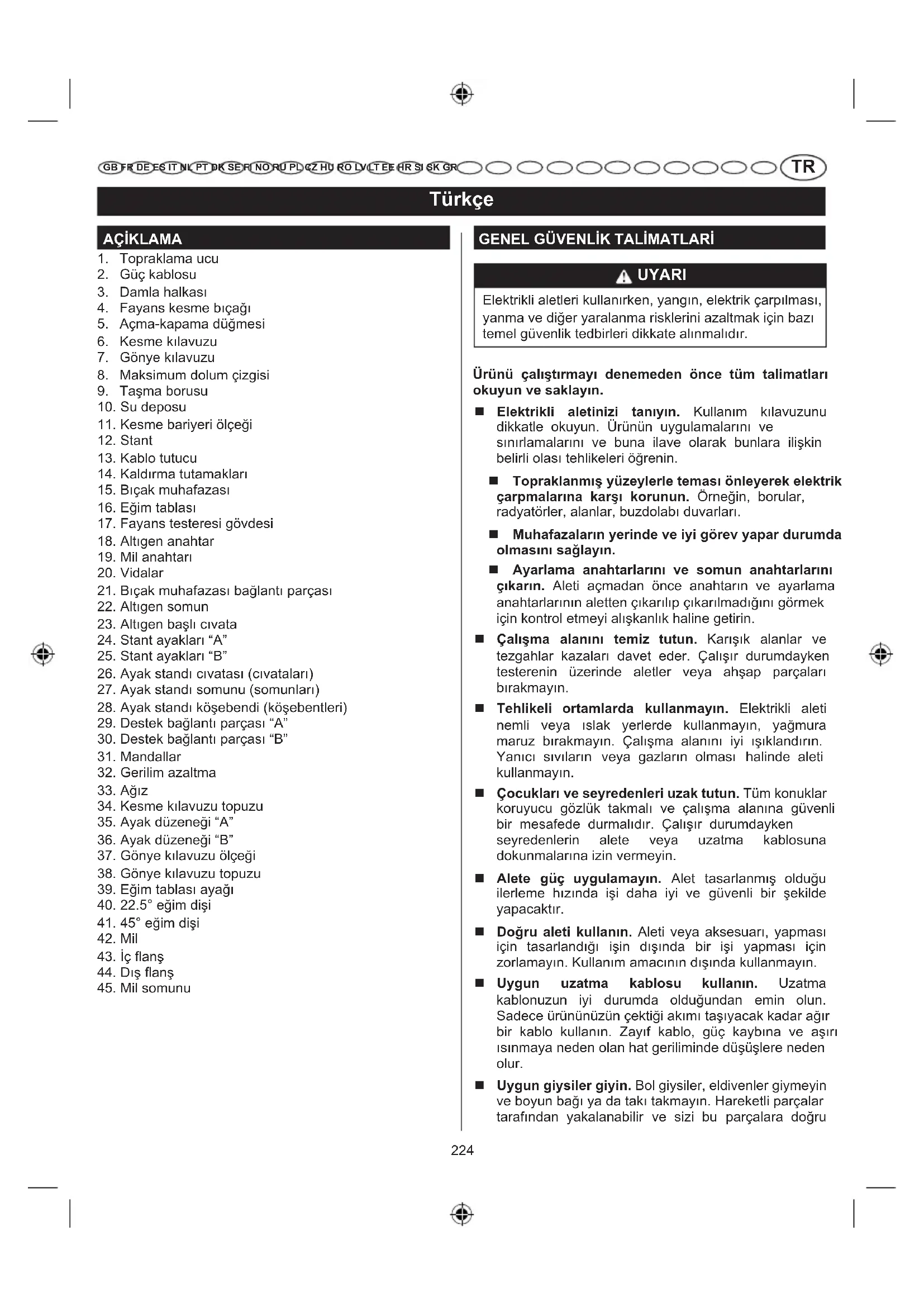 GB FR DE ES IT NL PT DK SE FI NO RU PL CZ HU RO LV LT EE HR SI SK GR çekebilirler. Dışarıda çalışma esnasında lastik eldivenler ve kaymayan ayakkabı (lastik tabanlı botlar) önerilir. Aynı zamanda uzun saçlarınızı tutması için koruyucu saç örtüleri kullanın. Daima yan siperlere sahip koruyucu gözlükler kullanın. Basit gözlükler sadece darbeye dayanıklı camlara sahiptir; koruyucu gözlük DEĞİLLERDİR. Işi emniyete alın. Kullanışlı olduğunda iş parçasını tutmak için kelepçeler veya bir mengene kullanın, bunu yapmak elinizi kullanmaktan daha güvenlidir ve aleti kullanmak üzere her iki elinizi de serbest bırakır. Aşırı derecede uzanmayın. Her zaman güvenli ve dengede durun. Aletlere özenle bakım yapın. Daha iyi ve daha güvenli performans için aletleri keskin ve temiz tutun. Aksesuarların yağlanması ve değiştirilmesi talimatlarını takip edin. Aletin kablosunu düzenli aralıklarla kontrol edin hasar görmüşse yetkili bir servis merkezi tarafından değiştirilmesini sağlayın. Uzatma kablosunu düzenli aralıklarla kontrol edin ve hasar görmüşse değiştirin. Tutamakları kuru, temiz, yağdan ve gresten uzak olarak muhafaza edin. Aletlerin fişini çekin. Kullanılmıyorken, bakım yapmadan önce veya aksesuar, bıçak, uç, kesici vb. değiştirmeden önce tüm aletler çıkarılmalıdır. Herhangi bir ayarlama, tamir veya bakım gerçekleştirmeden önce fişi prizden çekin. Yanlışlıkla çalıştırmaları engelleyin. Tüm elektrikli aletleri fişe takmadan önce düğmelerinin kapalı konumda olduğundan emin olun. Önerilen aksesuarları kullanın. Önerilen aksesuarlar için kullanıcı kılavuzuna bakın. Uygun olmayan aksesuarların kullanılması yaralanmalara neden olabilir. Asla alete dayanmayın. Alet devrilirse veya kesme aletine yanlışlıkla dokunulursa ciddi yaralanmalar meydana gelebilir. Hasarlı parçalara karşı kontrol edin. Cihazı daha fazla kullanmadan önce, hasar görmüş bir muhafazanın veya başka bir parçanın doğru olarak çalışacağını ve tasarlanan işlevini gerçekleştireceğini saptamak üzere dikkatli bir şekilde kontrol edilmelidir. Hareketli parçaların yerleşimini, bağlantısını, parçaların kırık olup olmadığını, parçaların takılmış olduğunu ve makinenin çalışmasını etkileyecek diğer durumları kontrol edin. Kişisel yaralanmaları önlemek için hasarlı bir koruyucu veya diğer parça veya yetkili bir servis merkezi tarafından tam olarak onarılmalı veya değiştirilmelidir. Doğru ilerletme yönünü kullanın. İş parçasını, bir bıçağa veya kesiciye sadece bıçağın veya kesicinin dönüş yönüne doğru ilerletin. Aleti asla çalışır durumdayken gözetimsiz bırakmayın. Testereyi kapatın. Tamamen durana kadar aletin yanından ayrılmayın. Akciğerlerinizi koruyun. Kesme işlemi tozluysa bir yüz veya toz maskesi takın. Kulaklarınızı koruyun. Uzun süreli işlemler esnasında kulak koruyucu kullanın. Elektrik kablosunu hor kullanmayın. Prizden çıkarmak için asla kablodan çekmeyin. Kabloyu ısıdan, yağdan ve keskin kenarlardan uzak tutun. Bıçak muhafazasının her zaman yerinde ve görev yapar durumda olmasını sağlayın. Ellerinizi kesme bölgesinden uzak tutun. Ellerinizi bıçaktan uzak tutun. Bıçak hala dönüyorken işin altından veya bıçağın etrafından ya da üzerinden uzanmayın. Bıçak hareket ediyorken kesim malzemesini çıkarmayı denemeyin. Alet kapandıktan sonra bıçak boşta dönmeye devam eder. Asla patlayıcı bir ortamda kullanmayın. Motorun normal kıvılcımlanması dumanları tutuşturabilir. Aletin kablolarını düzenli aralıklarla kontrol edin. Hasar görmüşse yetkili bir serviste uzman bir servis teknisyeni tarafından değiştirilmesini sağlayın. Uzatma kablosunu düzenli aralıklarla kontrol edin ve hasar görmüşse değiştirin. Tüm aletleri topraklayın. Alette üç uçlu priz bulunuyorsa üç delikli bir elektrik prizine takılmalıdır. Topraklama talimatları tam olarak anlaşılmazsa veya cihaz doğru olarak topraklanmasına rağmen bir kuşku varsa uzman bir elektrik teknisyeni veya servis elemanıyla birlikte kontrol edin. Sadece doğru elektrikli cihazları kullanın: 3 uçlu topraklı fişe ve aletin fişine uygun 3 kutuplu prizlere sahip 3 telli uzatma kablolarını kullanın. Ürünle birlikte verilen fiş üzerinde değişiklik yapmayın. Fiş prize uymazsa uzman bir elektrik teknisyenine uygun bir fiş taktırın. Aleti kuru, temiz, yağdan ve gresten uzak olarak muhafaza edin. Temizlik işlemi için daima temiz bir bez kullanın. Aleti temizlemek için asla fren hidrolik yağı, benzin, petrol bazlı ürünler veya diğer güçlü solventleri kullanmayın. Tetikte olun ve kontrol alıştırmaları yapın. Ne yaptığınıza dikkat edin ve sağduyunuzu kullanın. Yorgunken aleti kullanmayın. Acele etmeyin. Düğme aleti açmıyor ve kapatmıyorsa o aleti kullanmayın. Arızalı düğmenin yetkili bir servis merkezi tarafından değiştirilmesini sağlayın. Sadece doğru bıçak kullanın. Doğru büyüklükteki deliklere sahip olmayan bıçakları kullanmayın. Kusurlu veya doğru olmayan pulları ya da mil somunlarını asla226 Türkçe