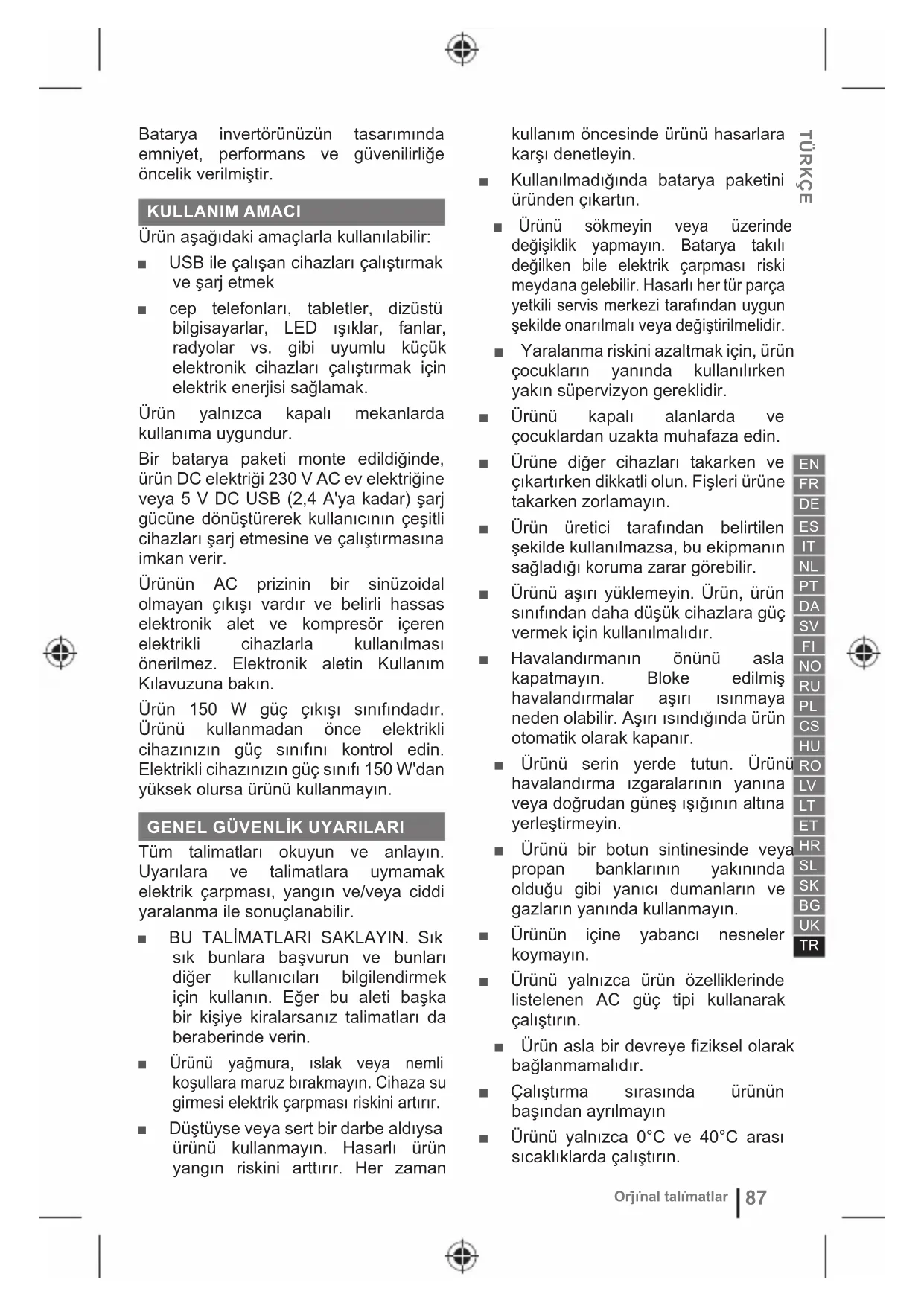 Tüm talimatları okuyun ve anlayın. Uyarılara ve talimatlara uymamak elektrik çarpması, yangın ve/veya ciddi yaralanma ile sonuçlanabilir. ■ BU TALİMATLARI SAKLAYIN. Sık sık bunlara başvurun ve bunları diğer kullanıcıları bilgilendirmek için kullanın. Eğer bu aleti başka bir kişiye kiralarsanız talimatları da beraberinde verin. ■ Ürünü yağmura, ıslak veya nemli koşullara maruz bırakmayın. Cihaza su girmesi elektrik çarpması riskini artırır. ■ Düştüyse veya sert bir darbe aldıysa ürünü kullanmayın. Hasarlı ürün yangın riskini arttırır. Her zaman kullanım öncesinde ürünü hasarlara karşı denetleyin. ■ Kullanılmadığında batarya paketini üründen çıkartın. ■ Ürünü sökmeyin veya üzerinde değişiklik yapmayın. Batarya takılı değilken bile elektrik çarpması riski meydana gelebilir. Hasarlı her tür parça yetkili servis merkezi tarafından uygun şekilde onarılmalı veya değiştirilmelidir. ■ Yaralanma riskini azaltmak için, ürün çocukların yanında kullanılırken yakın süpervizyon gereklidir. ■ Ürünü kapalı alanlarda ve çocuklardan uzakta muhafaza edin. ■ Ürüne diğer cihazları takarken ve çıkartırken dikkatli olun. Fişleri ürüne takarken zorlamayın. ■ Ürün üretici tarafından belirtilen şekilde kullanılmazsa, bu ekipmanın sağladığı koruma zarar görebilir. ■ Ürünü aşırı yüklemeyin. Ürün, ürün sınıfından daha düşük cihazlara güç vermek için kullanılmalıdır. ■ Havalandırmanın önünü asla kapatmayın. Bloke edilmiş havalandırmalar aşırı ısınmaya neden olabilir. Aşırı ısındığında ürün otomatik olarak kapanır. ■ Ürünü serin yerde tutun. Ürünü havalandırma ızgaralarının yanına veya doğrudan güneş ışığının altına yerleştirmeyin. ■ Ürünü bir botun sintinesinde veya propan banklarının yakınında olduğu gibi yanıcı dumanların ve gazların yanında kullanmayın. ■ Ürünün içine yabancı nesneler koymayın. ■ Ürünü yalnızca ürün özelliklerinde listelenen AC güç tipi kullanarak çalıştırın. ■ Ürün asla bir devreye fiziksel olarak bağlanmamalıdır. ■ Çalıştırma sırasında ürünün başından ayrılmayın ■ Ürünü yalnızca 0°C ve 40°C arası sıcaklıklarda çalıştırın.88 Orı