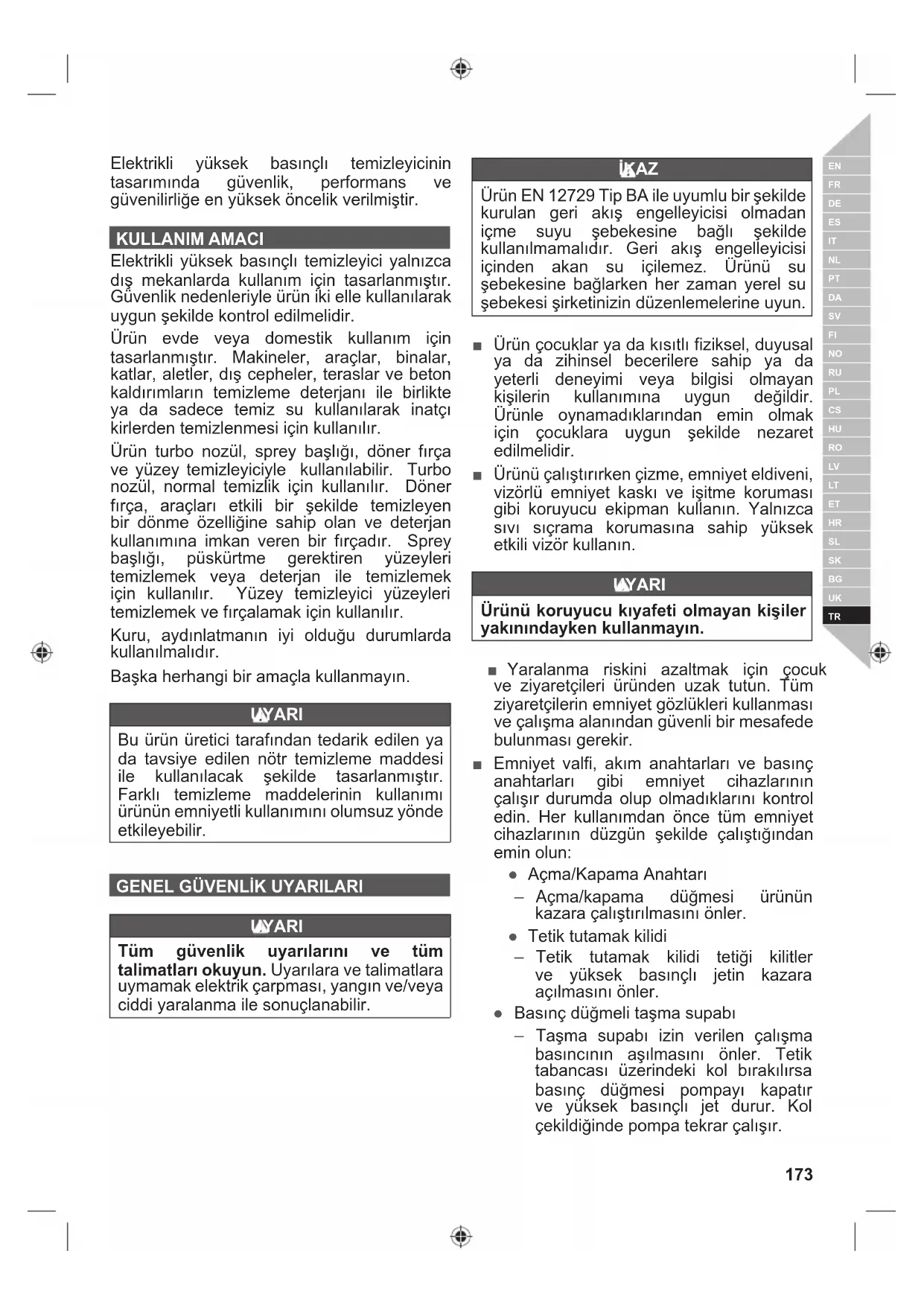 Elektrikl yuksek basinci temizleyici yanizcadis mekanlarda kullanim icin tasarlanmistir. Guvenlik nedenleriyle urun iki elle kullanilarak uygun sekilde kontrl edilmelidir.