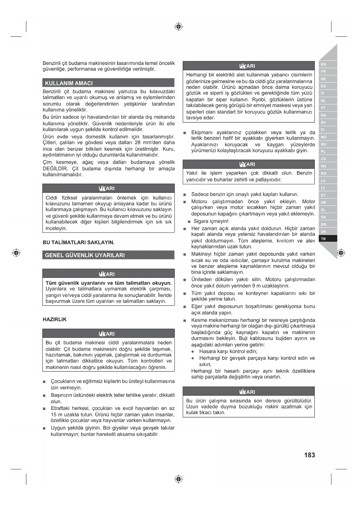 ■ Motoru durdurun ve depolamadan veya taşımadan önce soğumasını bekleyin. ■ Üründeki tüm yabancı maddeleri temizleyin. ■ Bıçağı bıçak koruyucu (kılıf) ile kapatın. ■ Depodaki tüm yakıtı benzin için onaylı bir konteyner185 Türkçe |