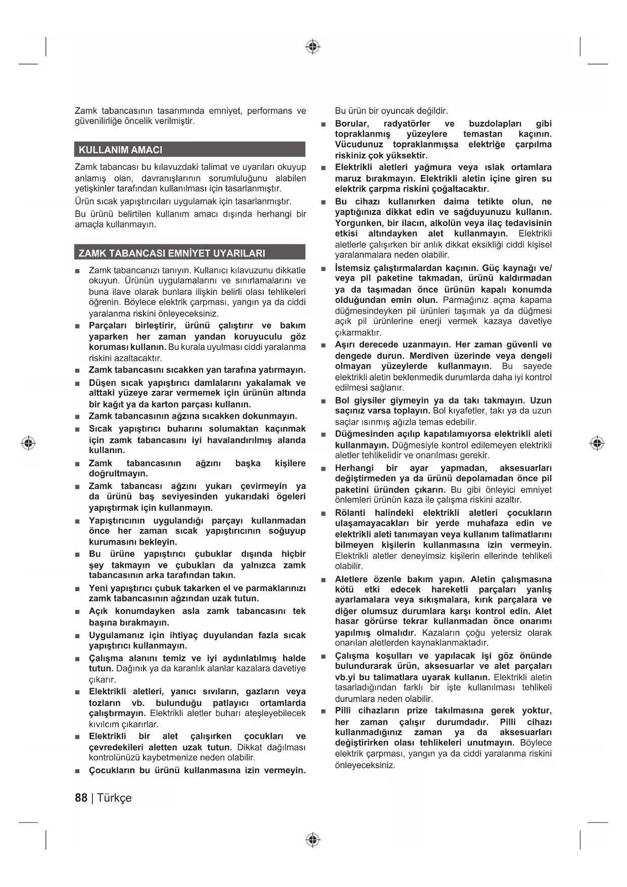 (Без Символу попередження про небезпеку) Вказує на ситуацію, яка може привести до матеріальних збитків.88 | Türkçe Zamk tabancasının tasarımında emniyet, performans ve güvenilirliğe öncelik verilmiştir. KULLANIM AMACI Zamk tabancası bu kılavuzdaki talimat ve uyarıları okuyup anlamış olan, davranışlarının sorumluluğunu alabilen yetişkinler tarafından kullanılması için tasarlanmıştır. Ürün sıcak yapıştırıcıları uygulamak için tasarlanmıştır. Bu ürünü belirtilen kullanım amacı dışında herhangi bir amaçla kullanmayın.