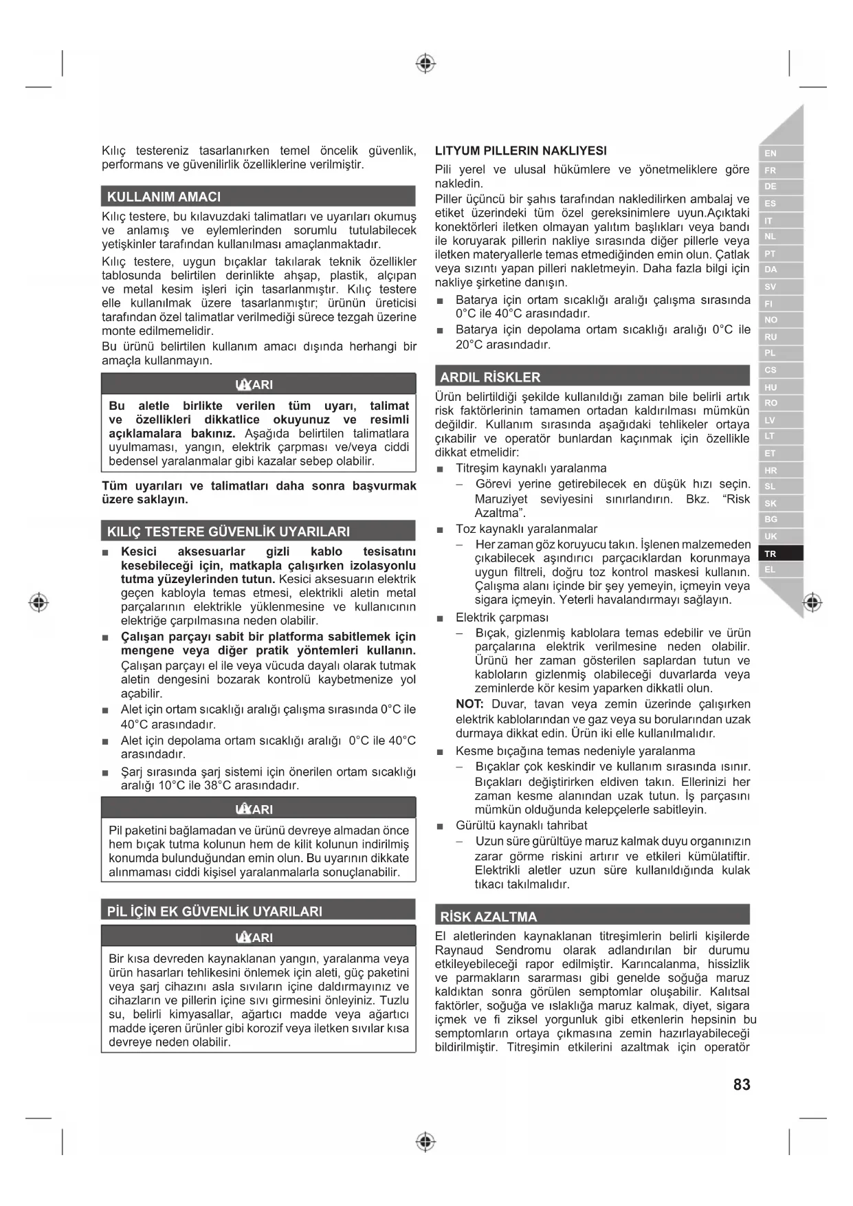 Ürün belirtildiği şekilde kullanıldığı zaman bile belirli artık risk faktörlerinin tamamen ortadan kaldırılması mümkün değildir. Kullanım sırasında aşağıdaki tehlikeler ortaya çıkabilir ve operatör bunlardan kaçınmak için özellikle dikkat etmelidir: ■ Titreşim kaynaklı yaralanma – Görevi yerine getirebilecek en düşük hızı seçin. Maruziyet seviyesini sınırlandırın. Bkz. “Risk Azaltma”. ■ Toz kaynaklı yaralanmalar – Her zaman göz koruyucu takın. İşlenen malzemeden çıkabilecek aşındırıcı parçacıklardan korunmaya uygun filtreli, doğru toz kontrol maskesi kullanın. Çalışma alanı içinde bir şey yemeyin, içmeyin veya sigara içmeyin. Yeterli havalandırmayı sağlayın. ■ Elektrik çarpması – Bıçak, gizlenmiş kablolara temas edebilir ve ürün parçalarına elektrik verilmesine neden olabilir. Ürünü her zaman gösterilen saplardan tutun ve kabloların gizlenmiş olabileceği duvarlarda veya zeminlerde kör kesim yaparken dikkatli olun. NOT : Duvar, tavan veya zemin üzerinde çalışırken elektrik kablolarından ve gaz veya su borularından uzak durmaya dikkat edin. Ürün iki elle kullanılmalıdır. ■ Kesme bıçağına temas nedeniyle yaralanma – Bıçaklar çok keskindir ve kullanım sırasında ısınır. Bıçakları değiştirirken eldiven takın. Ellerinizi her zaman kesme alanından uzak tutun. İş parçasını mümkün olduğunda kelepçelerle sabitleyin. ■ Gürültü kaynaklı tahribat – Uzun süre gürültüye maruz kalmak duyu organınızın zarar görme riskini artırır ve etkileri kümülatiftir. Elektrikli aletler uzun süre kullanıldığında kulak tıkacı takılmalıdır.