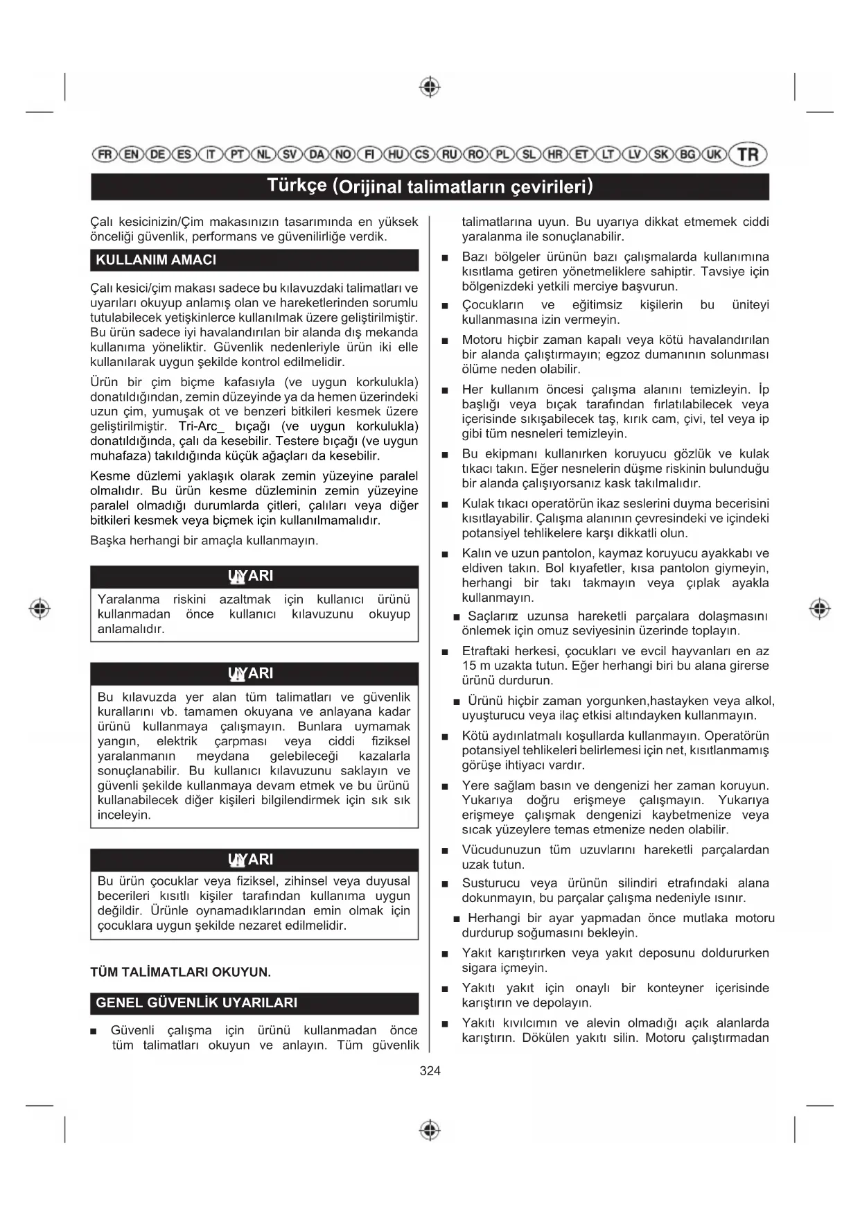 ■ Çatlamışsa, kırılmışsa veya herhangi bir şekilde zarar görmüşse ip başlığını değiştirin. Tel kafanın düzgün şekilde takılı olduğundan ve güvenli şekilde sıkıştırıldığından emin olun. Aksi hâlde ciddi yaralanmaya neden olabilir. ■ Islak çim üzerinde kullanmaktan kaçının. ■ Ürünü kullanırken geri geri yürümeyin. ■ Yürüyün, hiçbir zaman koşmayın. ■ Kesme eklentisine takılı olan küçük bıçak, güvenli ve en iyi performans için yeni çekilmiş teli doğru uzunlukta kesmek içindir. Çok keskindir; özellikle ürünü temizlerken dokunmayın. ■ Havalandırma girişlerinin her zaman birikintiden arındırılmış hâlde tutulduğundan emin olun. ■ Her kullanım öncesi ve her hangi bir darbeden sonra hasarlı parça olmadığını kontrol edin. Kesme araçlarını çatlak ve diğer hasar belirtilerine karşı inceleyin. Arızalı bir anahtarın ya da hasarlı veya aşınmış herhangi bir parçanın yetkili bir servis tarafından gerektiği gibi onarılması ya da değiştirilmesi gerekir. ■ Başlık bağlantısının doğru şekilde takıldığı ndan ve güvenli şekilde sabitlendiğinden emin olun. ■ Tüm korkuluk, deflektör, tutamak, cıvata ve tespit elemanlarının yerlerinde bulunduklarından emin olun. ■ Üründe herhangi bir şekilde değişiklik yapmayın Bu, sizin ve başkalarının yaralanma tehlikesini artırabilir. ■ Kesme başlığında sadece üreticinin yedek ipini kullanın. Başka bir kesme aparatı kullanmayın. ■ Ürünü hiçbir zaman kesme bağlantısı koruması yerinde ve iyi durumda değilken kullanmayın. ■ Kesme sırasında her iki tutamağı da sıkıca kavramayı sürdürün. Tel kafayı göğüs seviyesinin altında tutun. Hiçbir zaman yerden 76 cm veya daha yukarıda bulunan ip başlığı ile kesim yapmayın. ÇALI KESİCİ GÜVENLİK UYARILARI ■ Yukarıdaki kurallar ile birlikte ürünü çalı tırpanı modunda kullanırken bu ek talimatlara uyulmalıdır. ■ Kanatları takar ya da sökerken ağır hizmet tipi eldiven kullanın, kanat kenarları keskindir. ■ Dönerken bıçağa dokunmaya veya durdurmaya çalışmayın. ■ Hareketli bir kanat ciddi yaralanmaya yol açabilir. Bıçak dönmeyi bütünüyle kesene kadar iki elle ürünün kontrolünü sürdürün. ■ Hasar gören tüm bıçakları değiştirin. Her kullanım öncesi bıçağın doğru şekilde takıldığından ve güvenli bir şekilde sabitlendiğinden her zaman emin olun. ■ Yalnızca üretici tarafından önerilen yedek Tri-Arc™ ya da testere bıçağı kullanın. Başka bir kesme aparatı kullanmayın. ■ Hiçbir zaman Tri-Arc™ bıçak ile 13 mm ve testere bıçağı ile 40 mm üzerindeki herhangi bir malzemeyi kesmeyin. ■ Ürününüz bir kayış takımıyla donatılmıştır. Kayış donanımını ürünün ağırlığını rahatça destekleyecek şekilde ve sağ tarafınızda kalacak gibi sırtınıza asın. ■ Hızlı serbest bırakma mekanizmasını tanıyın ve ürünü kullanmaya başlamadan önce bunu kullanarak pratik yapın. Doğru şekilde kullanılmas ı acil bir durumda ciddi yaralanmaları önleyebilir. Hiçbir zaman kayış326 Türkçe ( Orijinal talimatların çevirileri