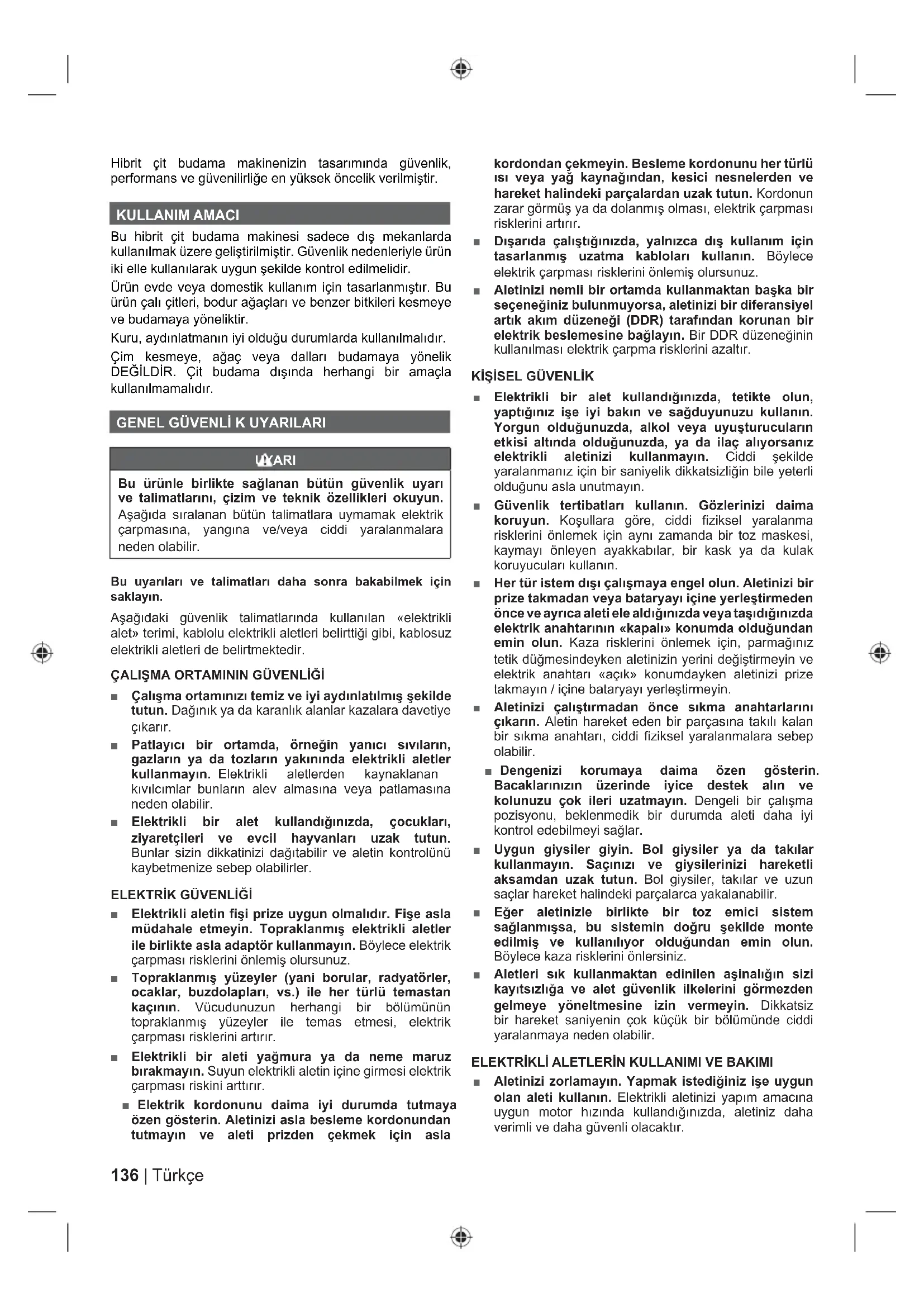 ■ Elektrikli aletin fişi prize uygun olmalıdır. Fişe asla müdahale etmeyin. Topraklanmış elektrikli aletler ile birlikte asla adaptör kullanmayın. Böylece elektrik çarpması risklerini önlemiş olursunuz. ■ Topraklanmış yüzeyler (yani borular, radyatörler, ocaklar, buzdolapları, vs.) ile her türlü temastan kaçının. Vücudunuzun herhangi bir bölümünün topraklanmış yüzeyler ile temas etmesi, elektrik çarpması risklerini artırır. ■ Elektrikli bir aleti yağmura ya da neme maruz bırakmayın. Suyun elektrikli aletin içine girmesi elektrik çarpması riskini arttırır. ■ Elektrik kordonunu daima iyi durumda tutmaya özen gösterin. Aletinizi asla besleme kordonundan tutmayın ve aleti prizden çekmek için asla kordondan çekmeyin. Besleme kordonunu her türlü ısı veya yağ kaynağından, kesici nesnelerden ve hareket halindeki parçalardan uzak tutun. Kordonun zarar görmüş ya da dolanmış olması, elektrik çarpması risklerini artırır. ■ Dışarıda çalıştığınızda, yalnızca dış kullanım için tasarlanmış uzatma kabloları kullanın. Böylece elektrik çarpması risklerini önlemiş olursunuz. ■ Aletinizi nemli bir ortamda kullanmaktan başka bir seçeneğiniz bulunmuyorsa, aletinizi bir diferansiyel artık akım düzeneği (DDR) tarafından korunan bir elektrik beslemesine bağlayın. Bir DDR düzeneğinin kullanılması elektrik çarpma risklerini azaltır.