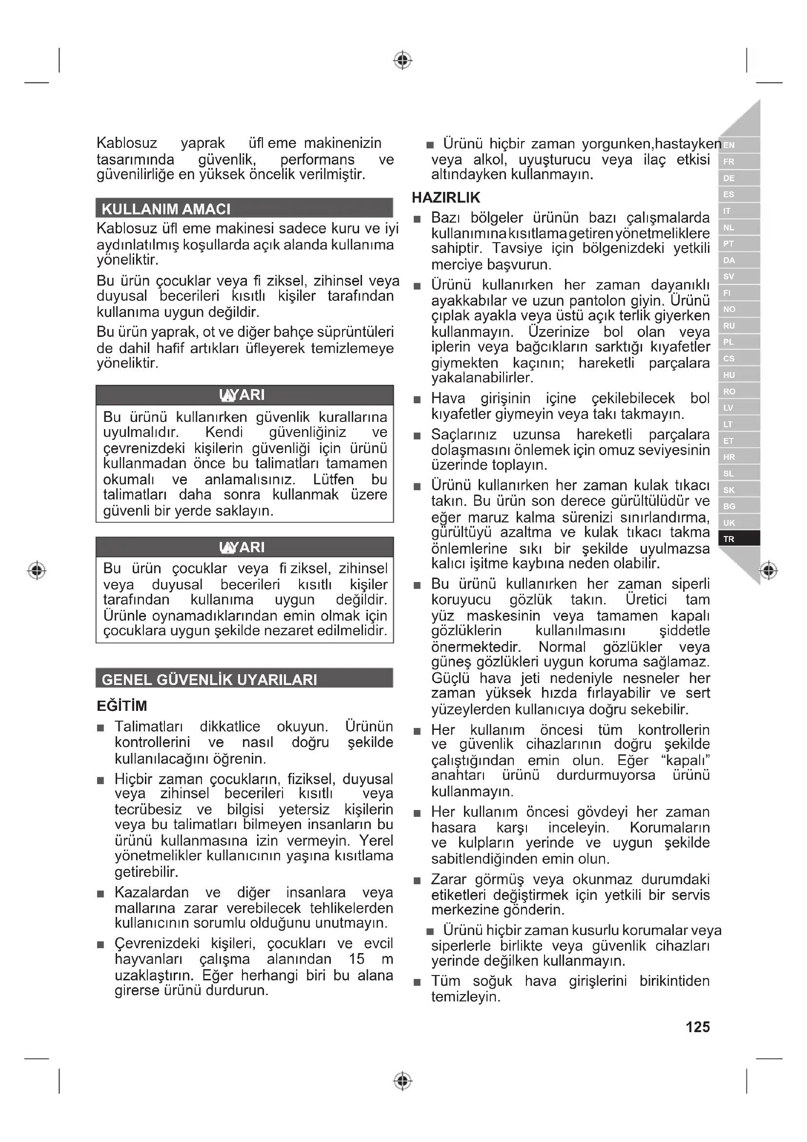 Kablosuz yaprak üfl eme makinenizin tasarımında güvenlik, performans ve güvenilirliğe en yüksek öncelik verilmiştir. KULLANIM AMACI Kablosuz üfl eme makinesi sadece kuru ve iyi aydınlatılmış koşullarda açık alanda kullanıma yöneliktir. Bu ürün çocuklar veya fi ziksel, zihinsel veya duyusal becerileri kısıtlı kişiler tarafından kullanıma uygun değildir. Bu ürün yaprak, ot ve diğer bahçe süprüntüleri de dahil hafi f artıkları üfl eyerek temizlemeye yöneliktir. UYARI Bu ürünü kullanırken güvenlik kurallarına uyulmalıdır. Kendi güvenliğiniz ve çevrenizdeki kişilerin güvenliği için ürünü kullanmadan önce bu talimatları tamamen okumalı ve anlamalısınız. Lütfen bu talimatları daha sonra kullanmak üzere güvenli bir yerde saklayın. UYARI Bu ürün çocuklar veya fi ziksel, zihinsel veya duyusal becerileri kısıtlı kişiler tarafından kullanıma uygun değildir. Ürünle oynamadıklarından emin olmak için çocuklara uygun şekilde nezaret edilmelidir.