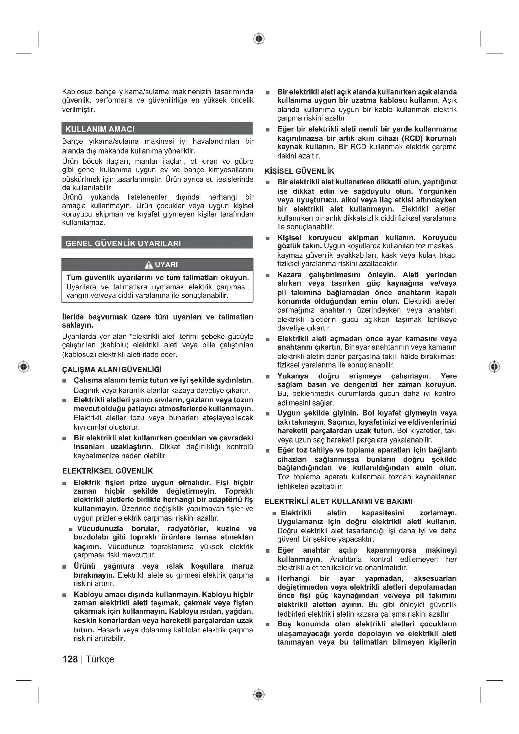 ПОПЕРЕДЖЕННЯ128 | Türkçe Kablosuz bahçe yıkama/sulama makinenizin tasarımında güvenlik, performans ve güvenilirliğe en yüksek öncelik verilmiştir. KULLANIM AMACI Bahçe yıkama/sulama makinesi iyi havalandırılan bir alanda dış mekanda kullanıma yöneliktir. Ürün böcek ilaçları, mantar ilaçları, ot kıran ve gübre gibi genel kullanıma uygun ev ve bahçe kimyasallarını püskürtmek için tasarlanmıştır. Ürün ayrıca su tesislerinde de kullanılabilir. Ürünü yukarıda listelenenler dışında herhangi bir amaçla kullanmayın. Ürün çocuklar veya uygun kişisel koruyucu ekipman ve kıyafet giymeyen kişiler tarafından kullanılamaz.