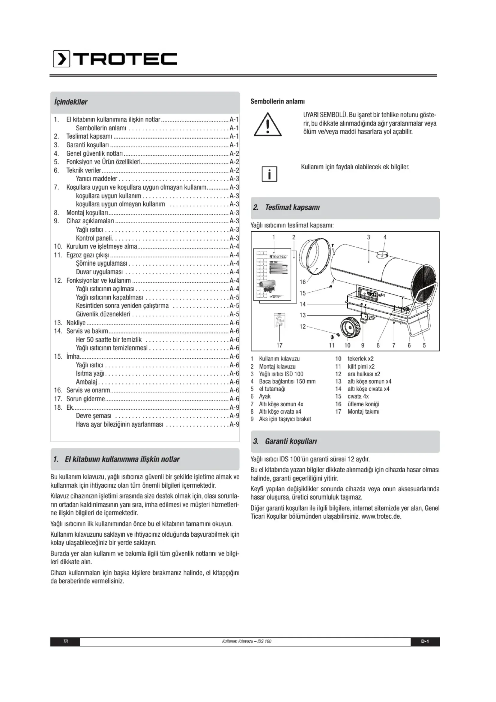 el kitabında yazan bilgiler dikkate alınmadığı için cihazda hasar olması halinde, garanti geçerliliğini yitirir. Keyfi yapılan değişiklikler sonunda cihazda veya onun aksesuarlarında hasar oluşursa, üretici sorumluluk taşımaz. Diğer garanti koşulları ile ilgili bilgilere, internet sitemizde yer alan, Genel Ticari Koşullar bölümünden ulaşabilirsiniz. www.trotec.de.Kullanım Kılavuzu – IDS 100 D-2 TR