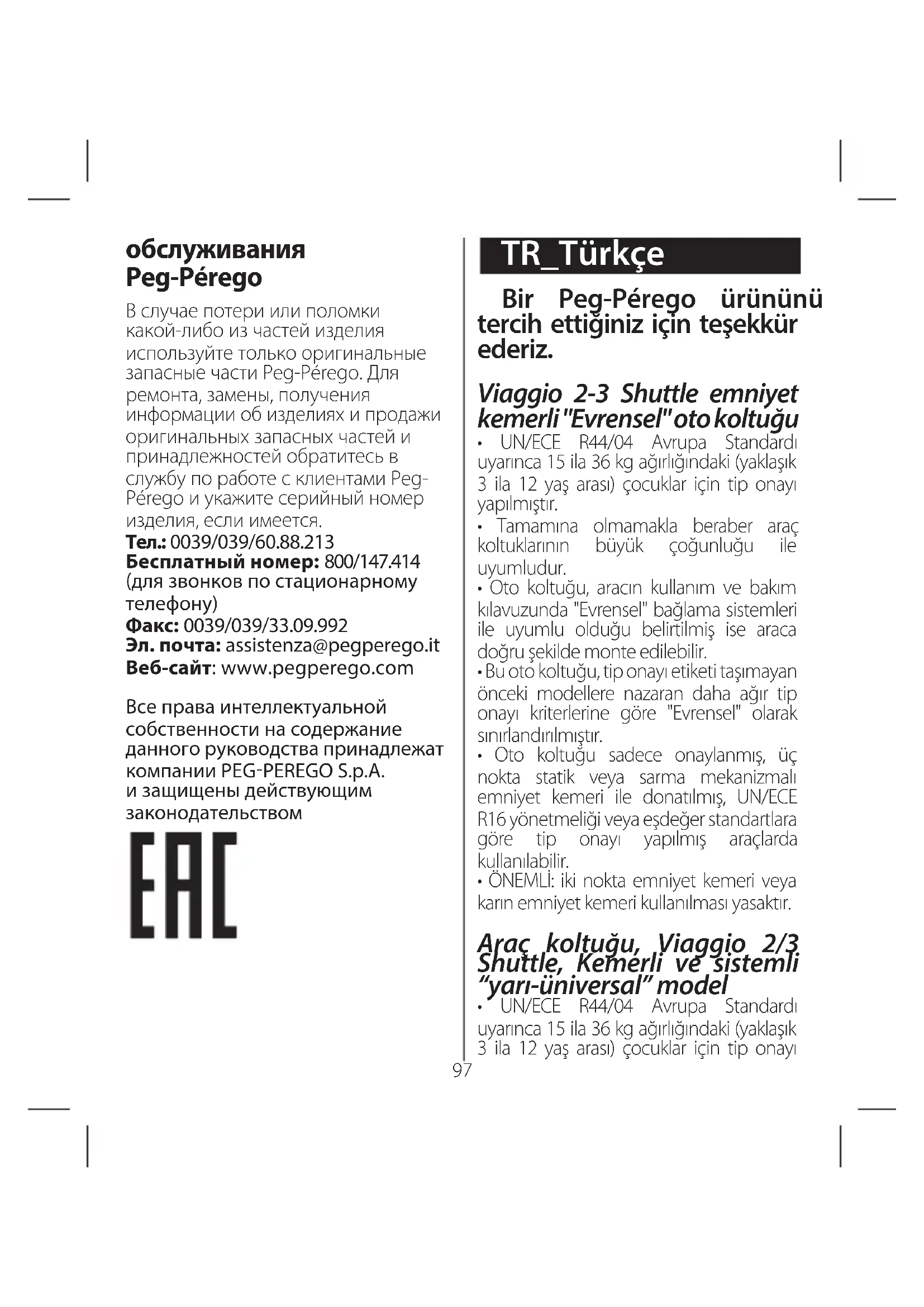 - Üretim sıra numarası: her oto koltuğununki farklıdır, tip onayı yapıldıktan sonra bütün oto koltuklarının kendi numarası vardır. PEG-PÉREGO S.p.A. Peg-Pérego SpA, ISO 9001 standardına uygun olarak TÜV Italia Srl tarafından onaylanmış bir kalite yönetim sistemine sahiptir. Peg- Pérego, bu belgede belirtilen ürün özellikleri üzerinde, teknik ve ticari gereksinimlere istinaden, arzuladığı zaman değişiklik yapabilme hakkını saklı tutar. Peg-Pérego müşteri hizmetleri Ürünün parçalarının kaza eseri kaybolması ya da hasar görmesi halinde sadece Peg-Pérego marka orijinal yedek parçalar kullanınız. Her türlü tamir, parça değişimi, ürünler hakkında bilgi, orijinal yedek parça ve aksesuar satışı için Peg-Pérego Müşteri Servisi ile iletişim kurarak varsa ürünün seri numarasını belirtiniz. tel. 0039/039/60.88.213 ücretsiz hat: 800/147.414 (İtalya'daki sabit numaralardan aramak için) fax 0039/039/33.09.992 e-mail assistenza@pegperego.it internet sitesi www.pegperego.com İşbu kullanım kılavuzunun içeriğine ait her türlü fikri mülkiyet hakları PEGPEREGO S.p.A.'ya ait olup yasalar tarafından korunmaktadır.103 HR/SRB/MNE/BiH_ Hrvatski Hvala vam što ste odabrali proizvod Peg-Pérego. Auto sjedalica Viaggio 2-3 Shuttle s pojasevima, kategorija „Univerzalna”
