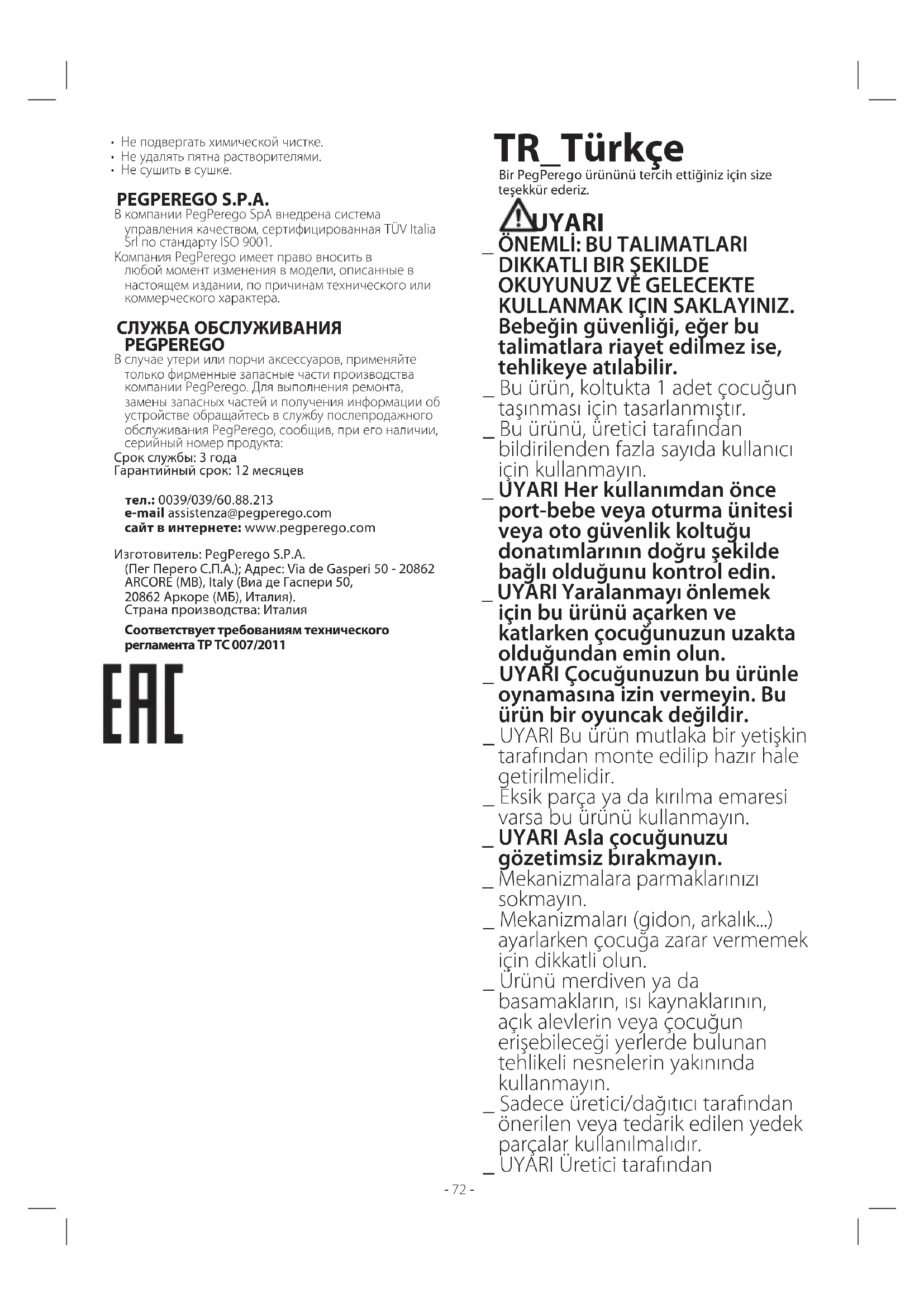 - Не гладить.- 72 - TR_Türkçe Bir PegPerego ürününü tercih ettiğiniz için size teşekkür ederiz. UYARI