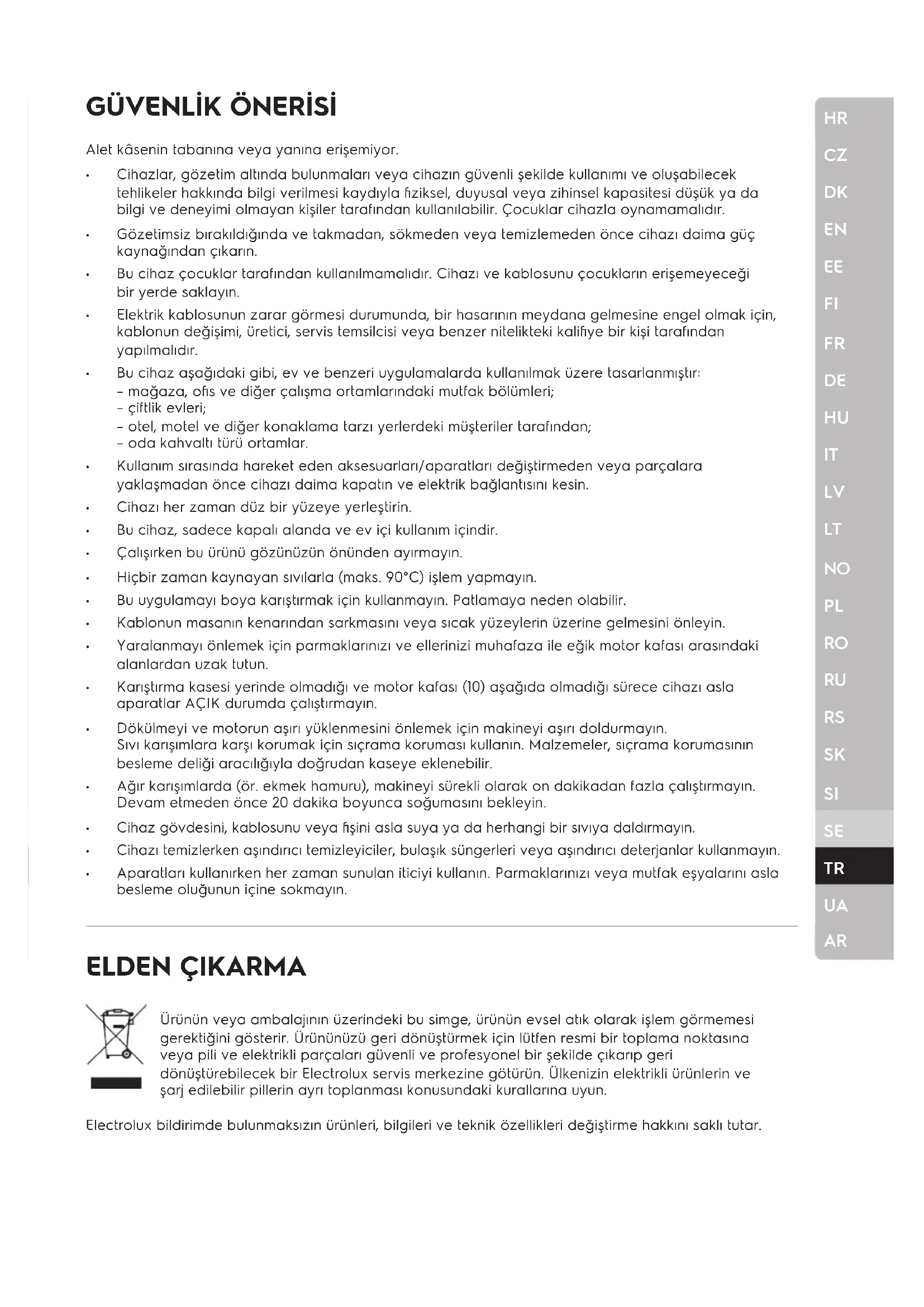 ELDEN ÇIKARMA Ürünün veya ambalajının üzerindeki bu simge, ürünün evsel atık olarak işlem görmemesi gerektiğini gösterir. Ürününüzü geri dönüştürmek için lütfen resmi bir toplama noktasına veya pili ve elektrikli parçaları güvenli ve profesyonel bir şekilde çıkarıp geri dönüştürebilecek bir Electrolux servis merkezine götürün. Ülkenizin elektrikli ürünlerin ve şarj edilebilir pillerin ayrı toplanması konusundaki kurallarına uyun. Electrolux bildirimde bulunmaksızın ürünleri, bilgileri ve teknik özellikleri değiştirme hakkını saklı tutar. Alet kâsenin tabanına veya yanına erişemiyor. Cihazlar, gözetim altında bulunmaları veya cihazın güvenli şekilde kullanımı ve oluşabilecek tehlikeler hakkında bilgi verilmesi kaydıyla fiziksel, duyusal veya zihinsel kapasitesi düşük ya da bilgi ve deneyimi olmayan kişiler tarafından kullanılabilir. Çocuklar cihazla oynamamalıdır. Gözetimsiz bırakıldığında ve takmadan, sökmeden veya temizlemeden önce cihazı daima güç kaynağından çıkarın. Bu cihaz çocuklar tarafından kullanılmamalıdır. Cihazı ve kablosunu çocukların erişemeyeceği bir yerde saklayın. Elektrik kablosunun zarar görmesi durumunda, bir hasarının meydana gelmesine engel olmak için, kablonun değişimi, üretici, servis temsilcisi veya benzer nitelikteki kalifiye bir kişi tarafından yapılmalıdır. Bu cihaz aşağıdaki gibi, ev ve benzeri uygulamalarda kullanılmak üzere tasarlanmıştır: – mağaza, ofis ve diğer çalışma ortamlarındaki mutfak bölümleri; – çiftlik evleri; – otel, motel ve diğer konaklama tarzı yerlerdeki müşteriler tarafından; – oda kahvaltı türü ortamlar. Kullanım sırasında hareket eden aksesuarları/aparatları değiştirmeden veya parçalara yaklaşmadan önce cihazı daima kapatın ve elektrik bağlantısını kesin. Cihazı her zaman düz bir yüzeye yerleştirin. Bu cihaz, sadece kapalı alanda ve ev içi kullanım içindir. Çalışırken bu ürünü gözünüzün önünden ayırmayın. Hiçbir zaman kaynayan sıvılarla (maks. 90°C) işlem yapmayın. Bu uygulamayı boya karıştırmak için kullanmayın. Patlamaya neden olabilir. Kablonun masanın kenarından sarkmasını veya sıcak yüzeylerin üzerine gelmesini önleyin. Yaralanmayı önlemek için parmaklarınızı ve ellerinizi muhafaza ile eğik motor kafası arasındaki alanlardan uzak tutun. Karıştırma kasesi yerinde olmadığı ve motor kafası (10) aşağıda olmadığı sürece cihazı asla aparatlar AÇIK durumda çalıştırmayın. Dökülmeyi ve motorun aşırı yüklenmesini önlemek için makineyi aşırı doldurmayın. Sıvı karışımlara karşı korumak için sıçrama koruması kullanın. Malzemeler, sıçrama korumasının besleme deliği aracılığıyla doğrudan kaseye eklenebilir. Ağır karışımlarda (ör. ekmek hamuru), makineyi sürekli olarak on dakikadan fazla çalıştırmayın. Devam etmeden önce 20 dakika boyunca soğumasını bekleyin. Cihaz gövdesini, kablosunu veya fişini asla suya ya da herhangi bir sıvıya daldırmayın. Cihazı temizlerken aşındırıcı temizleyiciler, bulaşık süngerleri veya aşındırıcı deterjanlar kullanmayın. Aparatları kullanırken her zaman sunulan iticiyi kullanın. Parmaklarınızı veya mutfak eşyalarını asla besleme oluğunun içine sokmayın.