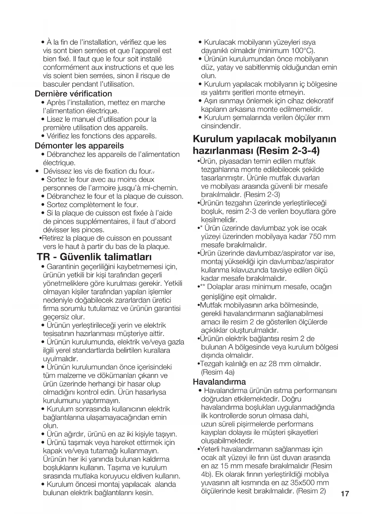 - Kurulum şemalarında verilen ölçüler mm cinsindendir. Kurulum yapılacak mobilyanın hazırlanması (Resim 2-3-4)