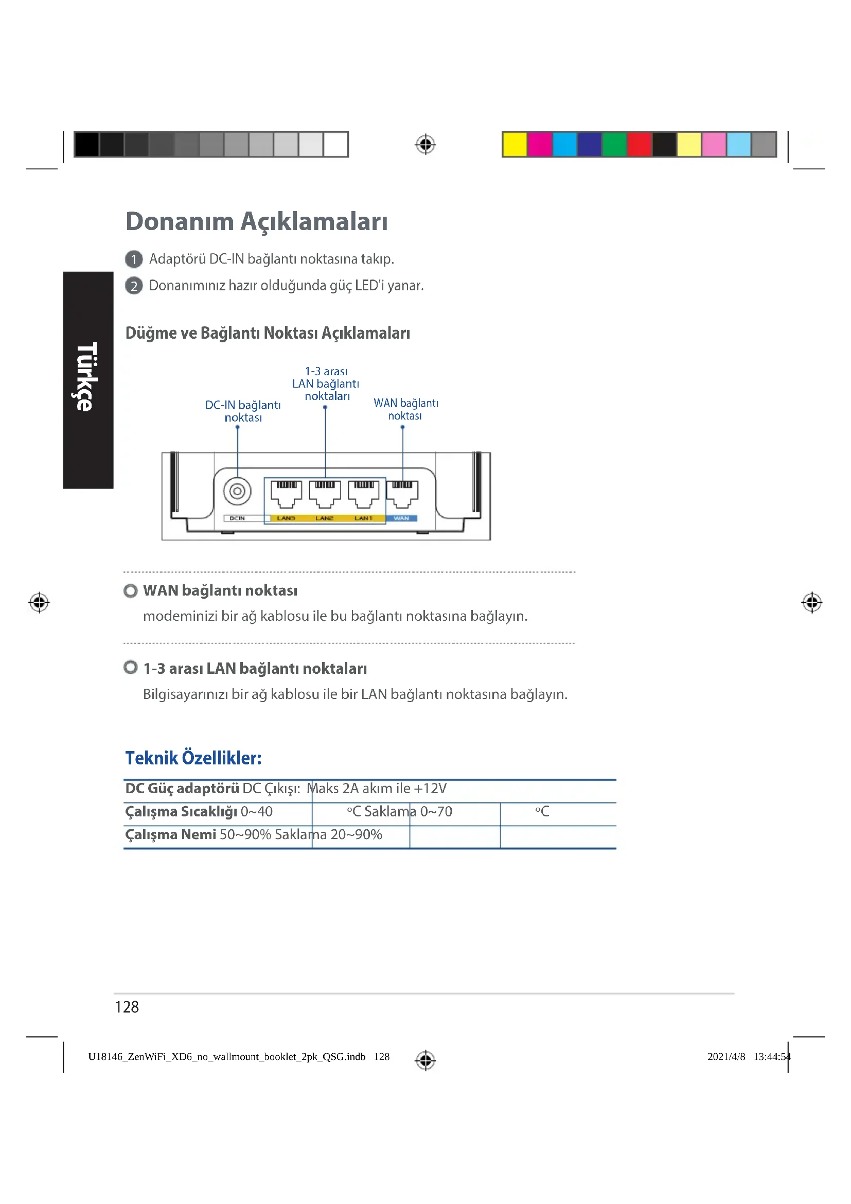 Çalışma Nemi 50~90% Saklama 20~90% Teknik Özellikler: DC-IN bağlantı noktasıWAN bağlantı noktası Düğme ve Bağlantı Noktası Açıklamaları 1-3 arası LAN bağlantı noktaları WAN bağlantı noktası modeminizi bir ağ kablosu ile bu bağlantı noktasına bağlayın. 1-3 arası LAN bağlantı noktaları Bilgisayarınızı bir ağ kablosu ile bir LAN bağlantı noktasına bağlayın. U18146_ZenWiFi_XD6_no_wallmount_booklet_2pk_QSG.indb 128U18146_ZenWiFi_XD6_no_wallmount_booklet_2pk_QSG.indb 128 2021/4/8 13:44:542021/4/8 13:44:54129 Türkçe
