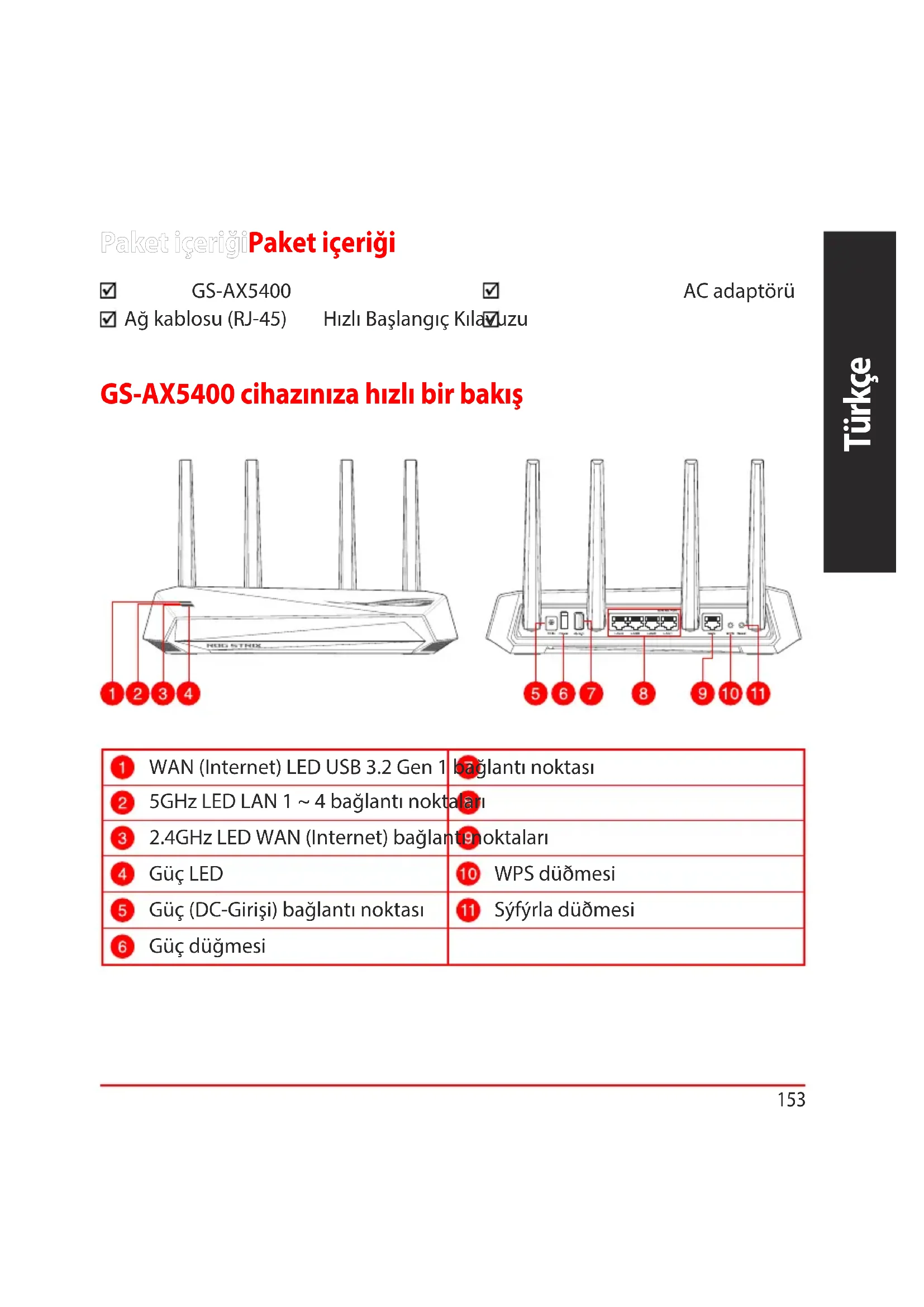 GS-AX5400 cihazınıza hızlı bir bakışGS-AX5400 cihazınıza hızlı bir bakış Paket içeriğiPaket içeriği GS-AX5400 AC adaptörü Ağ kablosu (RJ-45) Hızlı Başlangıç Kılavuzu WAN (Internet) LED USB 3.2 Gen 1 bağlantı noktası 5GHz LED LAN 1 ~ 4 bağlantı noktaları 2.4GHz LED WAN (Internet) bağlantı noktaları Güç LED WPS düðmesi Güç (DC-Girişi) bağlantı noktası Sýfýrla düðmesi Güç düğmesiTürkçe
