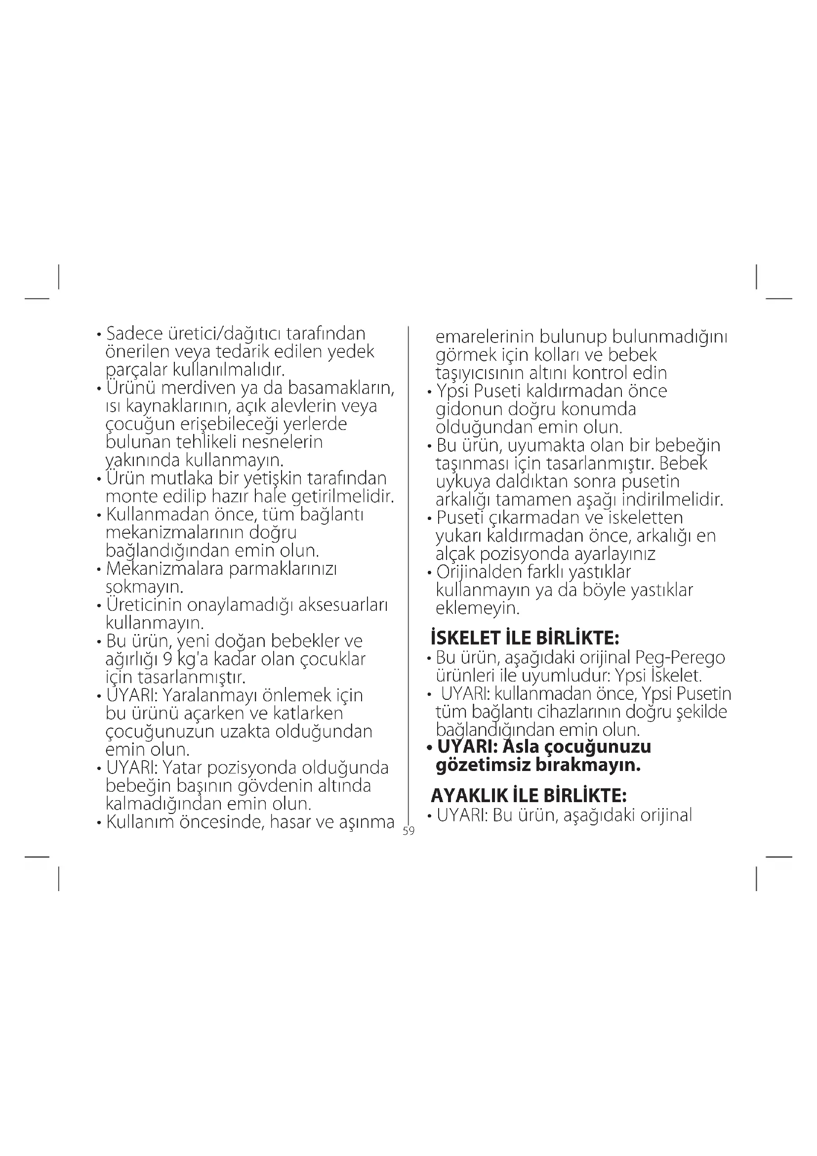 - Периодически очищайте пластмассовые детали влажной тряпкой, не пользуйтесь растворителями и сходными веществами.58 TR_Türkçe Bir Peg-Perego ürününü tercih ettiğiniz için size teşekkür ederiz. UYARI _ ÖNEMLİ: bu talmatları dkkatl br şeklde okuyunuz ve gelecekte kullanmak çn saklayınız. Bebeğn güvenlğ, eğer bu talmatlara rayet edlmez se, tehlkeye atılablr.