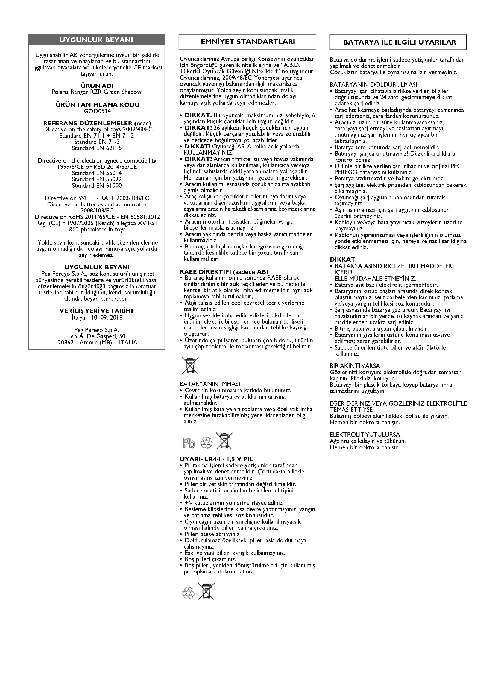 IGOD0534 REFERANS DÜZENLEMELER (esas) Directive on the safety of toys 2009/48/EC Standard EN 71-1 + EN 71-2 Standard EN 71-3 Standard EN 62115 Directive on the electromagnetic compatibility 1999/5/CE or RED 2014/53/UE Standard EN 55014 Standard EN 55022 Standard EN 61000 Directive on WEEE - RAEE 2003/108/EC Directive on batteries and accumulator 2008/103/EC Directive on RoHS 2011/65/UE - EN 50581:2012 Reg. (CE) n.1907/2006 (Reach) allegato XVII-51 &52 phthalates in toys Yolda seyir konusundaki trafik düzenlemelerine uygun olmadığından dolayı kamuya açık yollarda seyir edemez. UYGUNLUK BEYANI Peg Perego S.p.A., söz konusu ürünün şirket bünyesinde gerekli testlere ve yürürlükteki yasal düzenlemelerin öngördüğü bağımsız laboratuar testlerine tabi tutulduğunu, kendi sorumluluğu altında, beyan etmektedir.