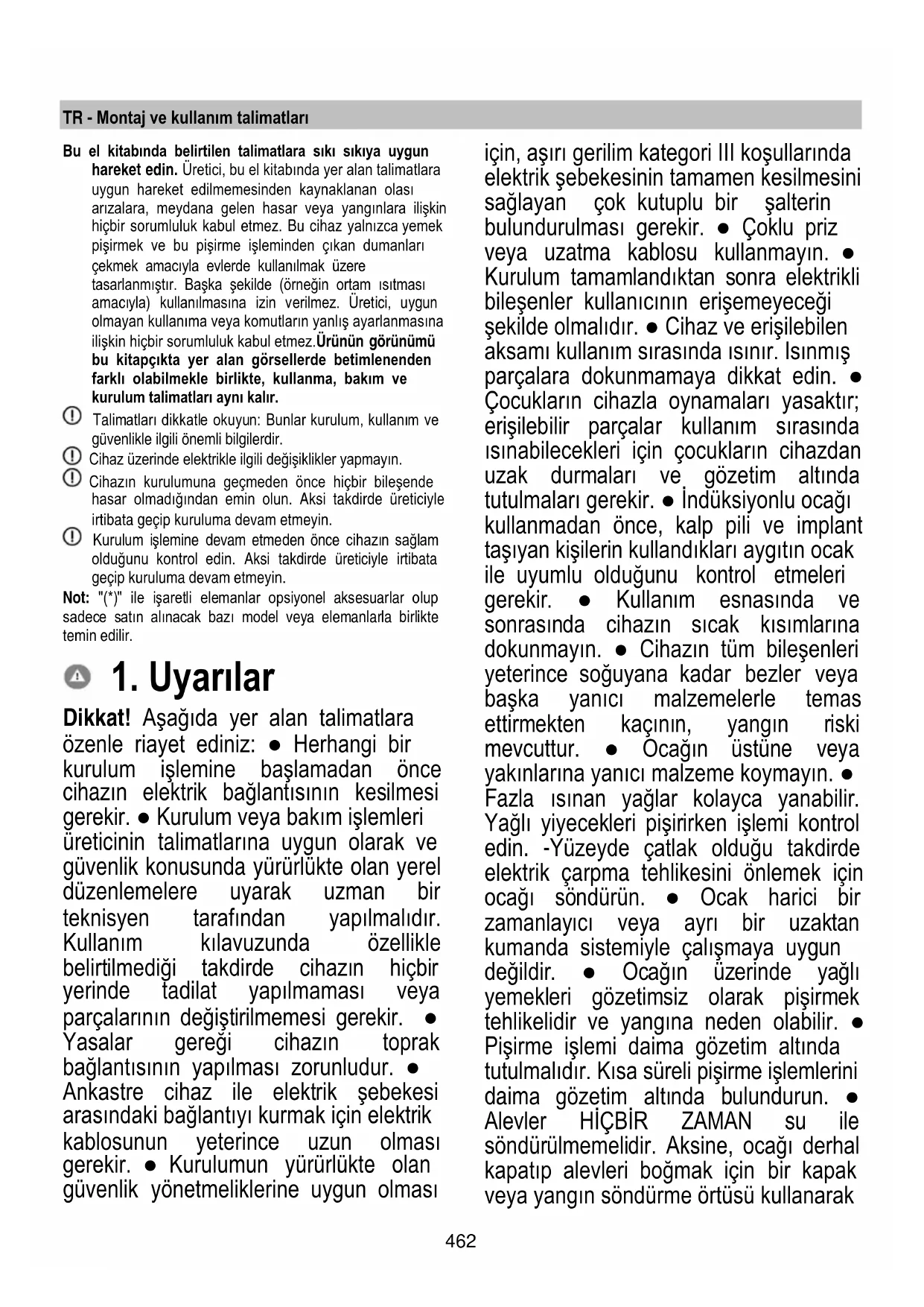 Dikkat! Aşağıda yer alan talimatlara özenle riayet ediniz: ● Herhangi bir kurulum işlemine başlamadan önce cihazın elektrik bağlantısının kesilmesi gerekir. ● Kurulum veya bakım işlemleri üreticinin talimatlarına uygun olarak ve güvenlik konusunda yürürlükte olan yerel düzenlemelere uyarak uzman bir teknisyen tarafından yapılmalıdır. Kullanım kılavuzunda özellikle belirtilmediği takdirde cihazın hiçbir yerinde tadilat yapılmaması veya parçalarının değiştirilmemesi gerekir. ● Yasalar gereği cihazın toprak bağlantısının yapılması zorunludur. ● Ankastre cihaz ile elektrik şebekesi arasındaki bağlantıyı kurmak için elektrik kablosunun yeterince uzun olması gerekir. ● Kurulumun yürürlükte olan güvenlik yönetmeliklerine uygun olması için, aşırı gerilim kategori III koşullarında elektrik şebekesinin tamamen kesilmesini sağlayan çok kutuplu bir şalterin bulundurulması gerekir. ● Çoklu priz veya uzatma kablosu kullanmayın. ● Kurulum tamamlandıktan sonra elektrikli bileşenler kullanıcının erişemeyeceği şekilde olmalıdır. ● Cihaz ve erişilebilen aksamı kullanım sırasında ısınır. Isınmış parçalara dokunmamaya dikkat edin. ● Çocukların cihazla oynamaları yasaktır; erişilebilir parçalar kullanım sırasında ısınabilecekleri için çocukların cihazdan uzak durmaları ve gözetim altında tutulmaları gerekir. ● İndüksiyonlu ocağı kullanmadan önce, kalp pili ve implant taşıyan kişilerin kullandıkları aygıtın ocak ile uyumlu olduğunu kontrol etmeleri gerekir. ● Kullanım esnasında ve sonrasında cihazın sıcak kısımlarına dokunmayın. ● Cihazın tüm bileşenleri yeterince soğuyana kadar bezler veya başka yanıcı malzemelerle temas ettirmekten kaçının, yangın riski mevcuttur. ● Ocağın üstüne veya yakınlarına yanıcı malzeme koymayın. ● Fazla ısınan yağlar kolayca yanabilir. Yağlı yiyecekleri pişirirken işlemi kontrol edin. -Yüzeyde çatlak olduğu takdirde elektrik çarpma tehlikesini önlemek için ocağı söndürün. ● Ocak harici bir zamanlayıcı veya ayrı bir uzaktan kumanda sistemiyle çalışmaya uygun değildir. ● Ocağın üzerinde yağlı yemekleri gözetimsiz olarak pişirmek tehlikelidir ve yangına neden olabilir. ● Pişirme işlemi daima gözetim altında tutulmalıdır. Kısa süreli pişirme işlemlerini daima gözetim altında bulundurun. ● Alevler HİÇBİR ZAMAN su ile söndürülmemelidir. Aksine, ocağı derhal kapatıp alevleri boğmak için bir kapak veya yangın söndürme örtüsü kullanarak463 söndürün. Yangın tehlikesi: Pişirme yüzeylerinin üzerine eşya koymayın. ● Buharlı temizleyici kullanmayın, elektrik çarpması riski mevcuttur. ● Fazla ısınma tehlikesi oluşabileceğinden, ocağın üzerine bıçak, çatal, kaşık ve kapak gibi metal malzeme koymayın. ● Cihazı elektrik şebekesine bağlamadan önce: Gerilim ve güç değerlerinin şebekenin değerlerine karşılık geldiğinden ve bağlantı prizinin uygun olduğundan emin olmak için bilgi plakasını kontrol edin (cihazın alt kısmında bulunur). Şüpheye düşerseniz, ehil bir elektrik teknisyeniyle bağlantı kurun. Önemli: ● Kullanımdan sonra, ocağı kumandasıyla kapatın, tencere algılayıcısına güvenmeyin. ● Sıvıların taşmasını önlemek için haşlama veya ısıtma yaparken ısı beslemesini düşürün. ● Ocağın ısıtma elemanlarının üzerinde boş tencere veya tava bırakmayın. ● Pişirme işlemi sona erer ermez ilgili pişirme bölgesini kapatın. ● Pişirme sırasında kesinlikle alüminyum folyo kullanmayın ve alüminyum ambalajlı ürünleri doğrudan yerleştirmeyin. Alüminyum eriyip ocakta geri dönüşü olanaksız zararlara yol açabilir. ● Öncesinde açmadan yiyecek içeren metal kutu veya tenekeleri kesinlikle ısıtmayın: patlama meydana gelebilir! Bu uyarı tüm diğer ocak tipleri için geçerlidir. ● Takviye özelliği gibi yüksek güçlü bir fonksiyonu kullanmak kızartma yağı gibi bazı sıvıları ısıtmak için uygun değildir. Yüksek ısı tehlikeli olabilir. Bu durumlarda daha düşük bir ısıtma gücü kullanılması tavsiye edilir. ● Kaplar doğrudan ocağın üzerine ve ısıtma bölümlerinin ortasına yerleştirilmelidir. Tencere ve ocak arasında kesinlikle başka nesne olmamalıdır. ● Yüksek sıcaklık söz konusu olduğunda cihaz otomatik olarak pişirme bölgelerinin güç seviyesini düşürür. ● Herhangi bir temizlik veya bakım işlemi yapmadan önce elektrik fişini prizden çekerek veya evinizdeki ana şalteri kapatarak cihazın elektrik şebekesiyle olan bağlantısını kesin. ● Tüm kurulum ve bakım işlemlerinde iş eldiveni kullanın. ● Bu cihaz 8 yaşından büyük çocuklar ile fiziksel, duyusal veya zihinsel kapasitesi düşük veya deneyimden ve gerekli bilgiden yoksun kişilerce yalnızca gözetim altındayken veya cihazın güvenli kullanımına ilişkin talimatlar verildikten ve bu durumla ilgili tehlikeleri anlamaları sağlandıktan sonra kullanılabilir. ● Cihazla oynamadıklarından emin olmak için çocuklar kontrol altında tutulmalıdır. ● Temizlik ve bakım işlemleri çocuklar tarafından gözetimsiz olarak yapılmamalıdır. ● Bu cihaz gaz veya başka yakıtları yakan diğer cihazlarla aynı anda kullanılacağı zaman söz konusu yerde yeterli havalandırma bulunmalıdır. ● Cihazın dışı ve içi sık sık (EN AZINDAN AYDA BİR) temizlenmelidir; her koşulda bakım talimatlarında açıkça belirtilenlere uygun hareket edin. ● Cihazla ilgili temizlik kuralları ile filtreleri değiştirme ve temizleme kurallarına uygun hareket edilmemesi yangın risklerinin doğmasına neden olur. ● Flambe usulü yemek pişirmek kesinlikle yasaktır. ● Açık alev kullanmak filtreler açısından zararlıdır ve yangınlara neden olabilir, bu nedenle her durumda kaçınılmalıdır. ● Aş