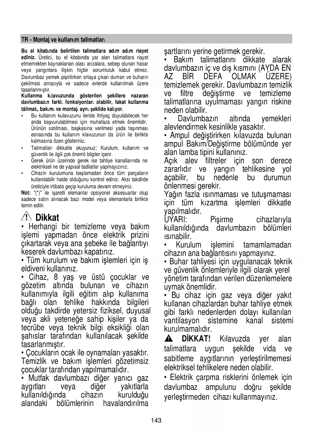 - Elektrik çarpma risklerini önlemek için davlumbaz ampulunu doğru şekilde yerleştirmeden cihazı kullanmayınız.144