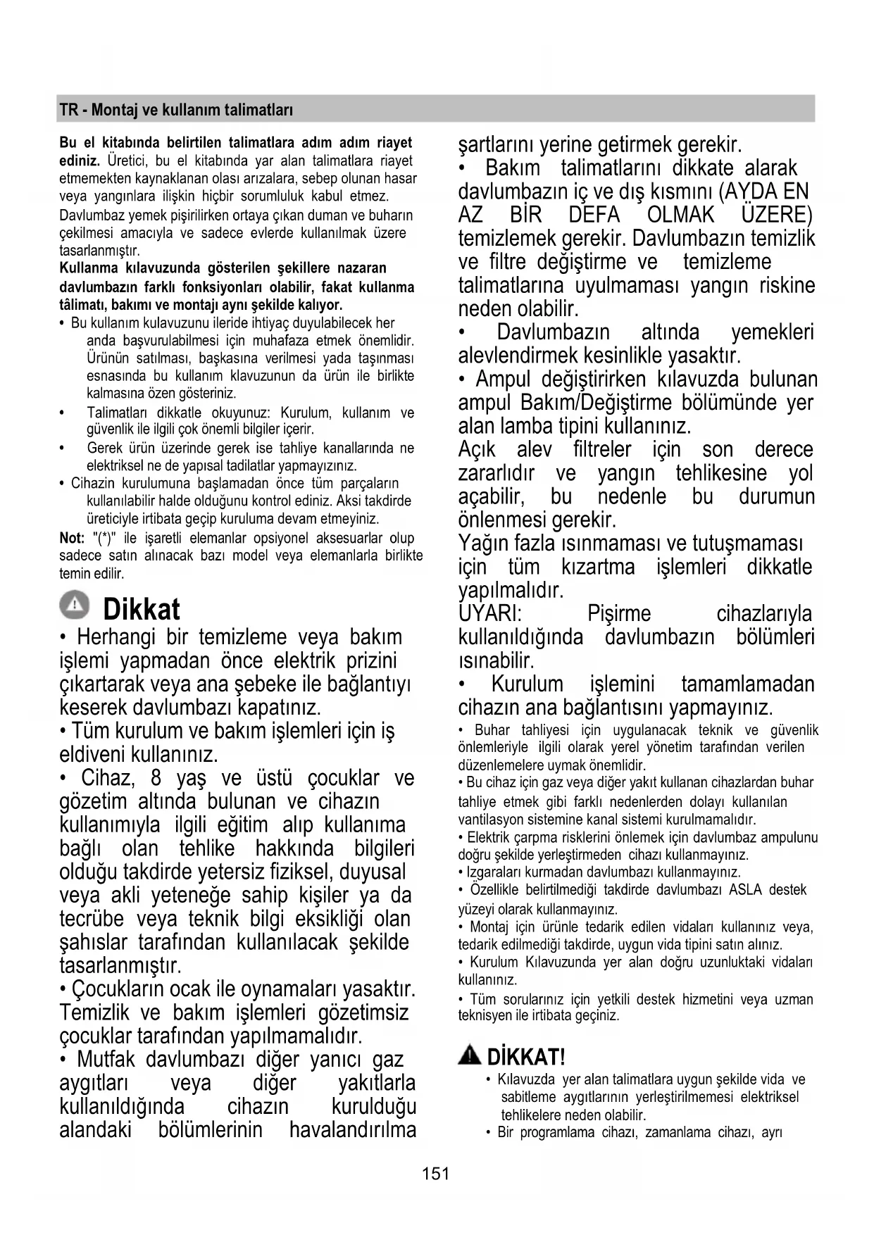 - Elektrik çarpma risklerini önlemek için davlumbaz ampulunu doğru şekilde yerleştirmeden cihazı kullanmayınız.