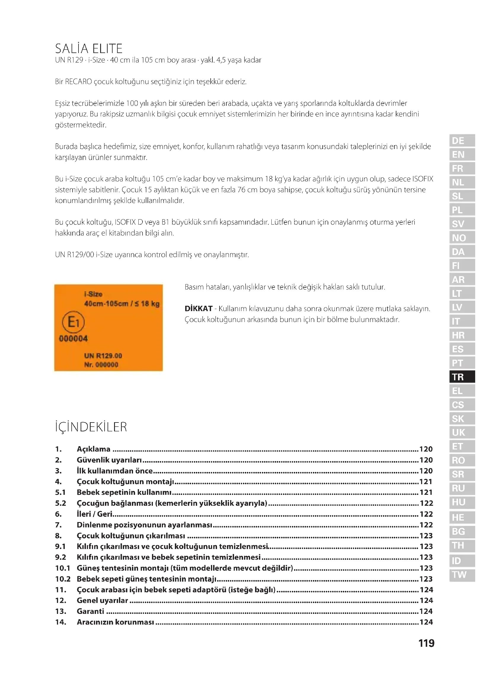 Kullanım kılavuzu çocuk koltuğunun arka tarafındaki saklama bölmesinde bulunur. Kılavuz kullanıldıktan sonra tekrar yerine konulmalıdır. RECARO Salia Elite, boyu 105 cm’nin altında ve maksimum 18 kg ağırlığındaki çocuklar içindir.