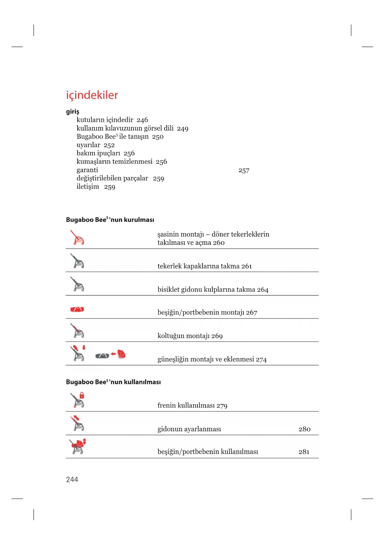 SLiçindekiler giriş kutuların içindedir 246 kullanım kılavuzunun görsel dili 249 Bugaboo Bee