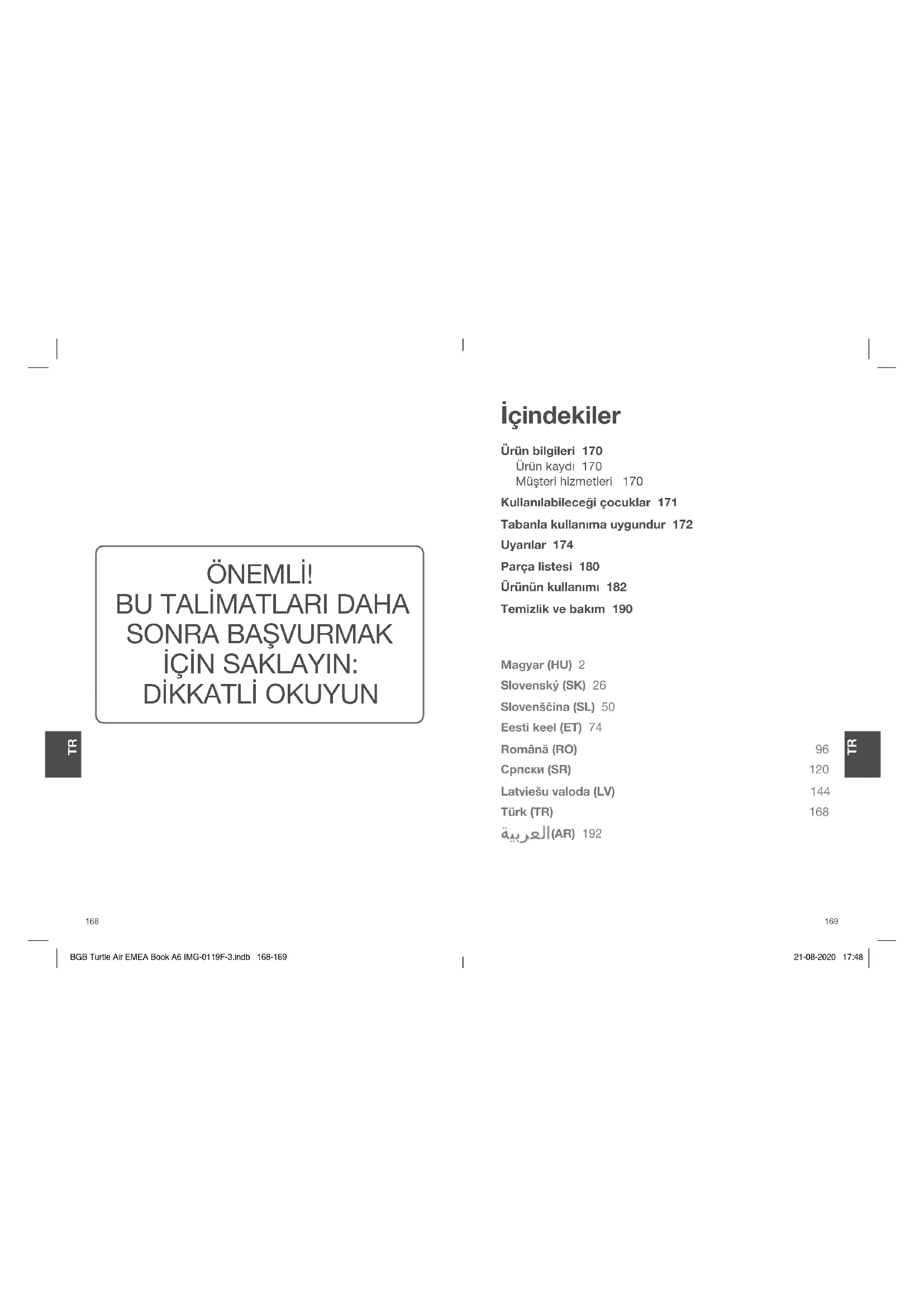 BGB Turtle Air EMEA Book A6 IMG-0119F-3.indb 166-167BGB Turtle Air EMEA Book A6 IMG-0119F-3.indb 166-167 21-08-2020 17:4821-08-2020 17:48İçindekiler Ürün bilgileri 170 Ürün kaydı 170 Müşteri hizmetleri 170 Kullanılabileceği çocuklar 171 Tabanla kullanıma uygundur 172 Uyarılar 174 Parça listesi 180 Ürünün kullanımı 182 Temizlik ve bakım 190 ÖNEMLİ!