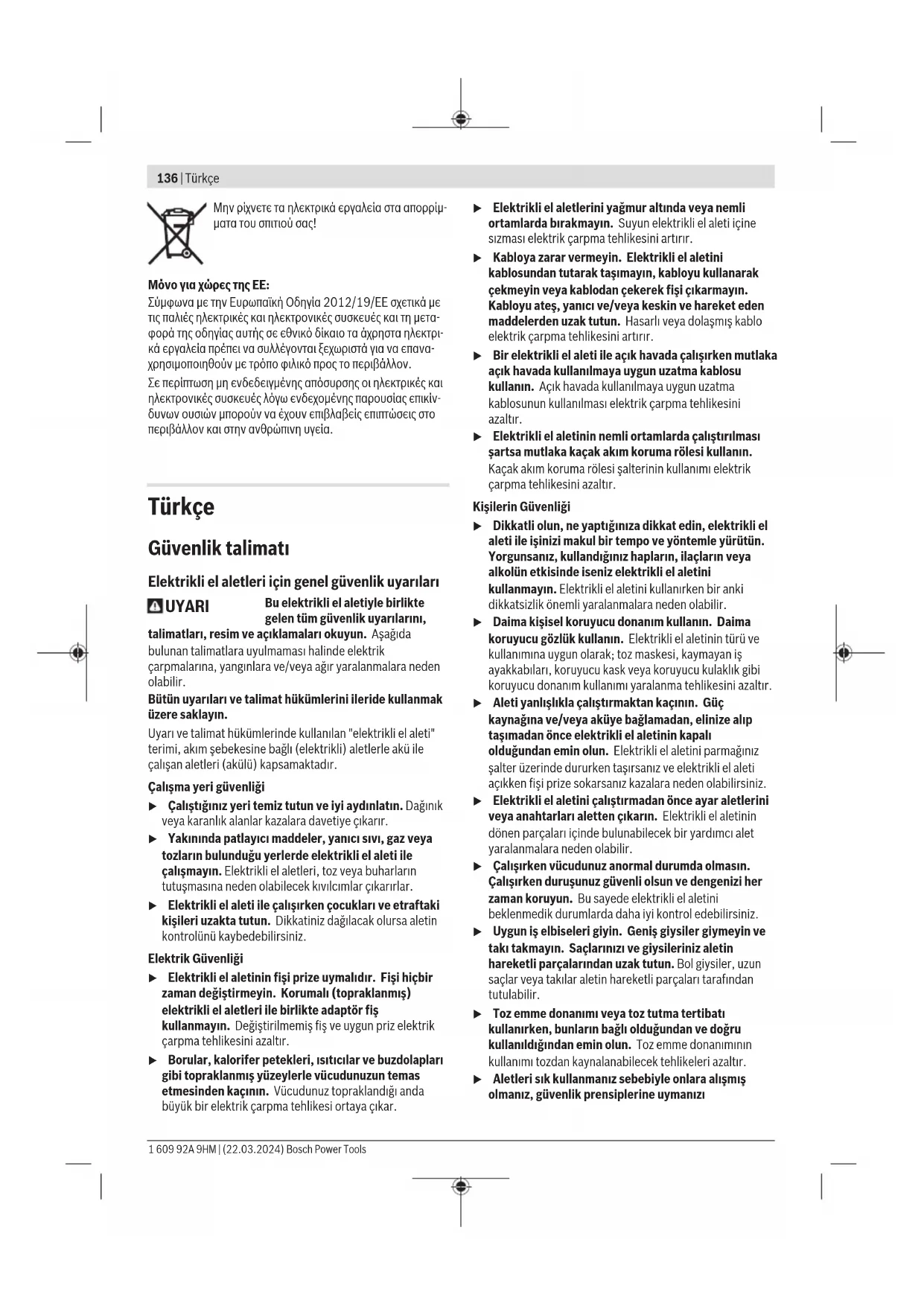 Bosch Power Tools 1 609 92A 9HM | (22.03.2024)136 | Türkçe Μην ρίχνετε τα ηλεκτρικά εργαλεία στα απορρίμ- ματα του σπιτιού σας! Μόνο για χώρες τηςΕΕ: Σύμφωνα με την Ευρωπαϊκή Οδηγία 2012/19/ΕΕ σχετικά με τις παλιές ηλεκτρικές και ηλεκτρονικές συσκευές και τη μετα- φορά της οδηγίας αυτής σε εθνικό δίκαιο τα άχρηστα ηλεκτρι- κά εργαλεία πρέπει να συλλέγονται ξεχωριστά για να επανα- χρησιμοποιηθούν με τρόπο φιλικό προς το περιβάλλον. Σε περίπτωση μη ενδεδειγμένης απόσυρσης οι ηλεκτρικές και ηλεκτρονικές συσκευές λόγω ενδεχομένης παρουσίας επικίν- δυνων ουσιών μπορούν να έχουν επιβλαβείς επιπτώσεις στο περιβάλλον και στην ανθρώπινη υγεία. Türkçe Güvenlik talimatı Elektrikli el aletleri için genel güvenlik uyarıları UYARI Bu elektrikli el aletiyle birlikte gelen tüm güvenlik uyarılarını, talimatları, resim ve açıklamaları okuyun. Aşağıda bulunan talimatlara uyulmaması halinde elektrik çarpmalarına, yangınlara ve/veya ağır yaralanmalara neden olabilir. Bütün uyarıları ve talimat hükümlerini ileride kullanmak üzere saklayın. Uyarı ve talimat hükümlerinde kullanılan "elektrikli el aleti" terimi, akım şebekesine bağlı (elektrikli) aletlerle akü ile çalışan aletleri (akülü) kapsamaktadır. Çalışma yeri güvenliği u Çalıştığınız yeri temiz tutun ve iyi aydınlatın. Dağınık veya karanlık alanlar kazalara davetiye çıkarır. u Yakınında patlayıcı maddeler, yanıcı sıvı, gaz veya tozların bulunduğu yerlerde elektrikli el aleti ile çalışmayın. Elektrikli el aletleri, toz veya buharların tutuşmasına neden olabilecek kıvılcımlar çıkarırlar. u Elektrikli el aleti ile çalışırken çocukları ve etraftaki kişileri uzakta tutun. Dikkatiniz dağılacak olursa aletin kontrolünü kaybedebilirsiniz. Elektrik Güvenliği u Elektrikli el aletinin fişi prize uymalıdır. Fişi hiçbir zaman değiştirmeyin. Korumalı (topraklanmış) elektrikli el aletleri ile birlikte adaptör fiş kullanmayın. Değiştirilmemiş fiş ve uygun priz elektrik çarpma tehlikesini azaltır. u Borular, kalorifer petekleri, ısıtıcılar ve buzdolapları gibi topraklanmış yüzeylerle vücudunuzun temas etmesinden kaçının. Vücudunuz topraklandığı anda büyük bir elektrik çarpma tehlikesi ortaya çıkar. u Elektrikli el aletlerini yağmur altında veya nemli ortamlarda bırakmayın. Suyun elektrikli el aleti içine sızması elektrik çarpma tehlikesini artırır. u Kabloya zarar vermeyin. Elektrikli el aletini kablosundan tutarak taşımayın, kabloyu kullanarak çekmeyin veya kablodan çekerek fişi çıkarmayın. Kabloyu ateş, yanıcı ve/veya keskin ve hareket eden maddelerden uzak tutun. Hasarlı veya dolaşmış kablo elektrik çarpma tehlikesini artırır. u Bir elektrikli el aleti ile açık havada çalışırken mutlaka açık havada kullanılmaya uygun uzatma kablosu kullanın. Açık havada kullanılmaya uygun uzatma kablosunun kullanılması elektrik çarpma tehlikesini azaltır. u Elektrikli el aletinin nemli ortamlarda çalıştırılması şartsa mutlaka kaçak akım koruma rölesi kullanın. Kaçak akım koruma rölesi şalterinin kullanımı elektrik çarpma tehlikesini azaltır. Kişilerin Güvenliği u Dikkatli olun, ne yaptığınıza dikkat edin, elektrikli el aleti ile işinizi makul bir tempo ve yöntemle yürütün. Yorgunsanız, kullandığınız hapların, ilaçların veya alkolün etkisinde iseniz elektrikli el aletini kullanmayın. Elektrikli el aletini kullanırken bir anki dikkatsizlik önemli yaralanmalara neden olabilir. u Daima kişisel koruyucu donanım kullanın. Daima koruyucu gözlük kullanın. Elektrikli el aletinin türü ve kullanımına uygun olarak; toz maskesi, kaymayan iş ayakkabıları, koruyucu kask veya koruyucu kulaklık gibi koruyucu donanım kullanımı yaralanma tehlikesini azaltır. u Aleti yanlışlıkla çalıştırmaktan kaçının. Güç kaynağına ve/veya aküye bağlamadan, elinize alıp taşımadan önce elektrikli el aletinin kapalı olduğundan emin olun. Elektrikli el aletini parmağınız şalter üzerinde dururken taşırsanız ve elektrikli el aleti açıkken fişi prize sokarsanız kazalara neden olabilirsiniz. u Elektrikli el aletini çalıştırmadan önce ayar aletlerini veya anahtarları aletten çıkarın. Elektrikli el aletinin dönen parçaları içinde bulunabilecek bir yardımcı alet yaralanmalara neden olabilir. u Çalışırken vücudunuz anormal durumda olmasın. Çalışırken duruşunuz güvenli olsun ve dengenizi her zaman koruyun. Bu sayede elektrikli el aletini beklenmedik durumlarda daha iyi kontrol edebilirsiniz. u Uygun iş elbiseleri giyin. Geniş giysiler giymeyin ve takı takmayın. Saçlarınızı ve giysileriniz aletin hareketli parçalarından uzak tutun. Bol giysiler, uzun saçlar veya takılar aletin hareketli parçaları tarafından tutulabilir. u Toz emme donanımı veya toz tutma tertibatı kullanırken, bunların bağlı olduğundan ve doğru kullanıldığından emin olun. Toz emme donanımının kullanımı tozdan kaynalanabilecek tehlikeleri azaltır. u Aletleri sık kullanmanız sebebiyle onlara alışmış olmanız, güvenlik prensiplerine uymanızı 1 609 92A 9HM | (22.03.2024) Bosch Power ToolsTürkçe | 137 önlememelidir. Dikkatsiz bir hareket, bir anda ciddi yaralanmalara yol açabilir. Elektrikli el aletlerinin kullanımı ve bakımı u Elektrikli el aletini aşırı ölçüde zorlamayın. Yaptığınız işe uygun elektrikli el aletleri kullanın.