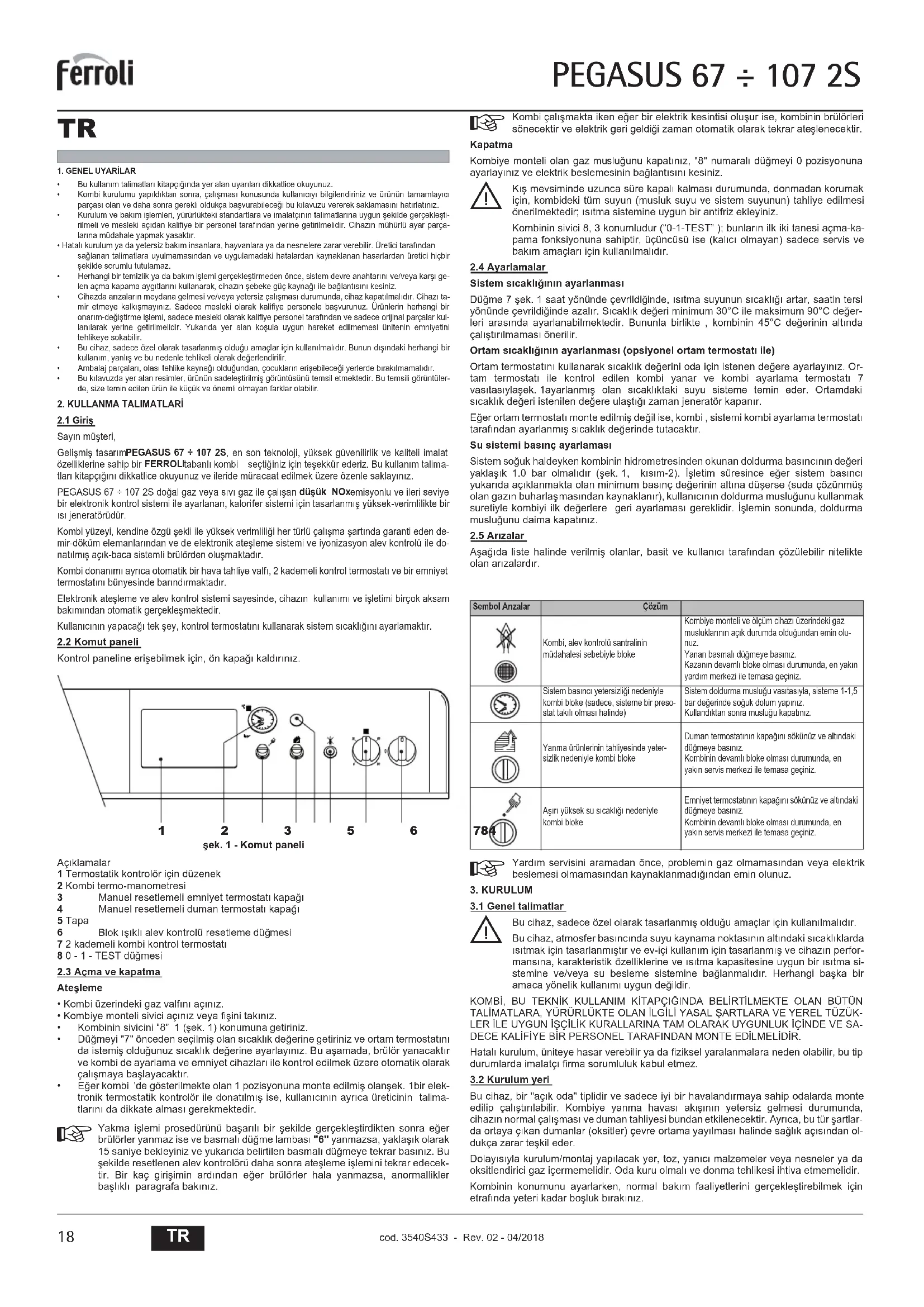 Arıza Sebep / ÇözümBir kaç kez ateúleme denemesi yaptıktan sonra elektronik kon-trolör kombiyi kapatacaktır.Pilot brülör uçlarını basınçlı hava ile temizleyiniz. Kombiye gelen normal gaz akıúını kontrol ediniz ve borulardaki havanın yok edildi÷inden emin olunuz. Elektrotların do÷ru bir úekilde konumlandırılmıú oldu÷undan ve üzerinde herhangi bir kalıntı olmadı÷ından emin olunuz (bkz. úek. 11). Kombinin, iyi bir topraklama ba÷lantısına ba÷lanmıú oldu÷undan emin olunuz. Ateúleme ve iyonizasyon elektrotlarının ba÷lantılarını kontrol ediniz. Elektrotlar ateúleme aúamasında tahliye iúlemini gerçekleútirmiyor. Elektrotların do ÷ru bir úekilde konumlandırılmıú oldu÷undan ve üzerinde herhangi bir kalıntı olmadı÷ından emin olunuz (bkz. úek. 11). Ayarlama termostatının ayarı çok düúüktür.Elektrik gücü beslemesini kontrol ediniz. Ateúleme ve iyonizasyon elektrotlarının ba÷lantılarını kontrol ediniz. Elektronik alev kontrolöründeki ba÷lantıları kontrol ediniz. FAZ ve NÖTR kısmın ters dönmemiú oldu÷undan ve topraklama kontaklarının sa÷lıklı oldu÷undan emin olunuz. Giriú gaz basıncını ve varsa açık basınç siviçlerini kontrol ediniz. Emniyet termostatını resetleyiniz.Duman termostatını resetleyiniz.Ortam termostatının kapalı oldu÷undan emin olunuz.Brülör zayıf bir úekilde yanıyor: Ale-vler çok yüksek, çok düúük veya çok sarı renkteGaz valfı filtresi kirlenmiútir.Gaz besleme basıncını kontrol ediniz.Gaz uçları kirlidir.Kombinin kirli olmadı÷ından emin olunuz. Cihazın monte edilmiú oldu÷u ortamdaki havalandırmanın, verimli bir yanmayı sa÷lamak için yeterli oldu÷undan emin olunuz. Yanmamıú gaz kokusu geliyor Kombinin temiz oldu÷undan emin olunuz. Baca çekiúinin yeterli oldu÷unu kontrol ediniz. Gaz sarfiyatının aúırı derecede olup olmadı÷ını kontrol ediniz. Kombi çalıúıyor fakat sıcaklık yük-selmiyor2 kademeli ayarlama termostatının düzgün bir úekilde çalıúıp çalıúmadı÷ını kontrol ediniz.Gaz valfının (maksimum güç) 2. kademe operatörünün beslenip beslen-medi÷ini kontrol ediniz. Gaz tüketiminin temin edilen gaza göre az olup olmadı÷ını kontrol ediniz. Kombinin tamamen temiz oldu÷undan emin olunuz. Kombinin sistem için uygun olup olmadı÷ını kontrol ediniz. Isıtma pompasını tıkanmıú olup olmadı÷ını kontrol ediniz. Sisteme sa÷lanan suyun sıcaklı÷ı çok yüksek veya çok düúük 2 kademeli ayarlama termostatının düzgün bir úekilde çalıúıp çalıúmadı÷ını kontrol ediniz.Isıtma pompasını tıkanm ıú olup olmadı÷ını kontrol ediniz. Devir-daim pompasının özelliklerinin sistem için uygun olup olmadı÷ını kontrol ediniz.Brülör patlaması. Ateúlemede gecikme Gaz basıncının yeterli ve kombi kasasının/kaplamasının kirli olup olmadı÷ını kontrol ediniz.Ayarlama termostatı , çok fazla büyük sıcaklık farkı ile geri dönüyor Termostat ampulünün muhafazasına düzgün bir úekilde yerleútirilmiú olup olmadı÷ını kontrol ediniz. 2 kademeli termostatın düzgün úekilde çalıúıp çalıúmadı÷ını kontrol ediniz. Kombi su yo÷unlaúması yapı yor Kombinin çok düúük bir sıcaklık de÷erinde çalıúıp çalıúmadı÷ını kontrol ediniz (50°C'nin altında).Gaz sarfiyatının normal olup olmadı÷ını kontrol ediniz. Bacanın sıhhatli çalıúıp çalıúmadı÷ını kontrol ediniz. Gözle görülür bir sebep olmaksızınkombi sönüyorSıcaklık yükselmesinden dolayı emniyet termostatı hata vermektedir.Duman termostatı hatalıdır. cod. 3540S433 - Rev. 02 - 04/2018PEGASUS 67 ÷ 107 2S